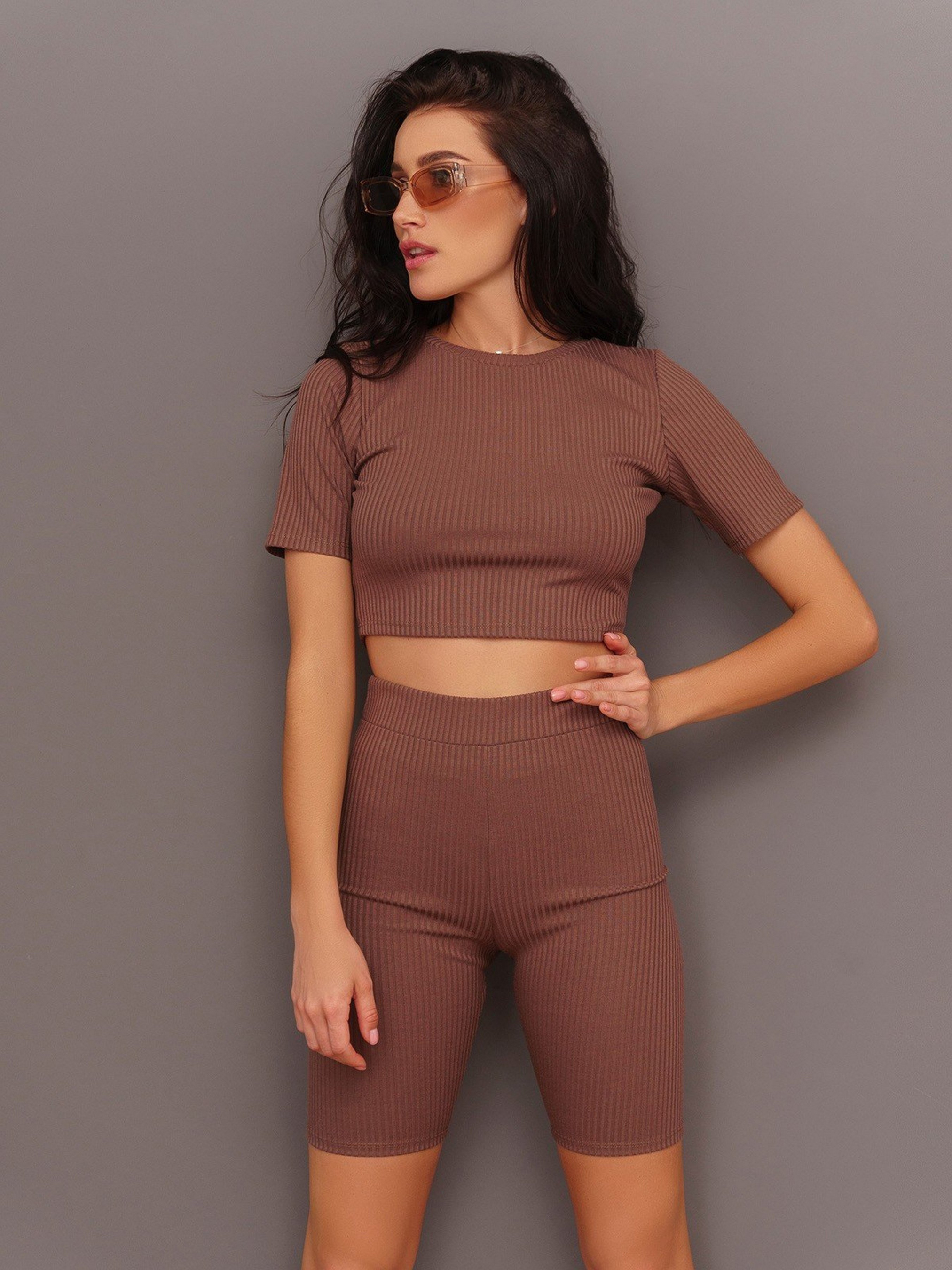 Коричневый облегающий костюм из фактурного трикотажа. Топ укороченной длины с короткими рукавами и манжеткой на горловине. Велосипедки высокой посадки с широкой поясной резинкой и длиной выше колен. Состав: 50% хлопок, 50% полиэстер. Полуобхват: Топ: Грудь: S (42), M (44), L (46), XL (48), Длина изделия - 35, Рукав - 21, Велосипедки: Талия: S (30-35), M (32-37), L (34-39), XL (36-41), Бедра: S (42), M (44), L (46), XL (48), Длина изделия - 47, Длина по внутреннему шву - 21, Ткань: Средней эластичности.