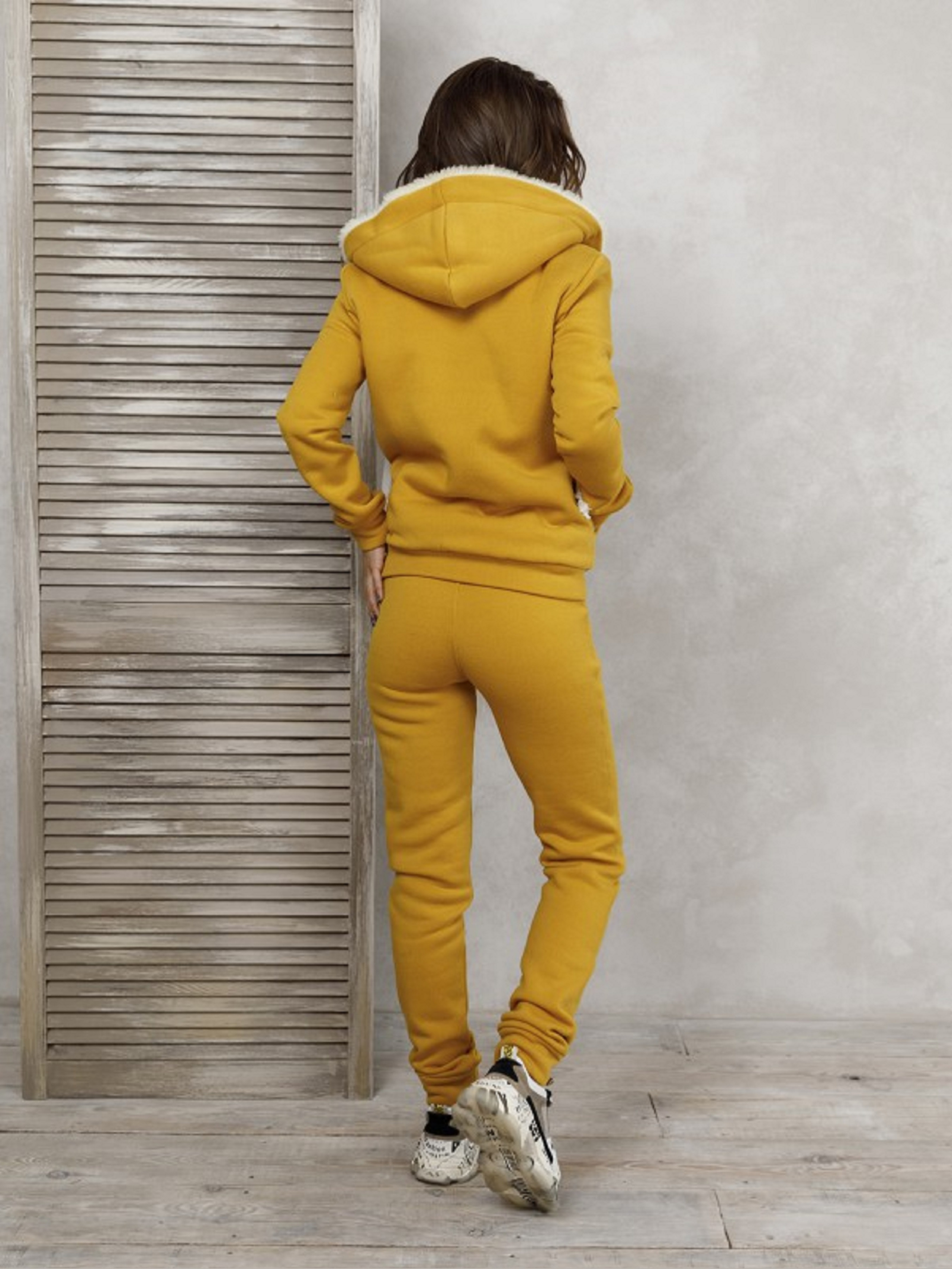 Зимний горчичный спортивный костюм на молнии выполненный из трикотажа на флисе с подкладом на толстовке из плотного искусственного меха в виде жилетки. Рукава и брюки без подклада. Толстовка с капюшоном, длинными рукавами и манжетами оснащена карманами. Брюки с резинкой на поясе, карманами и нижними манжетами. Полуобхват: Кофта: Грудь: S (48), M (50), L (52), XL (54), XXL (55), Длина изделия - 54, Рукав - 60, Брюки: Талия: S (30), M (31), L (32), XL (35), XXL (36), Бедра: S (42), M (44), L (45), XL (46), XXL (48), Длина изделия - 104, Длина по внутреннему шву - 79, Ткань: Средней эластичности.