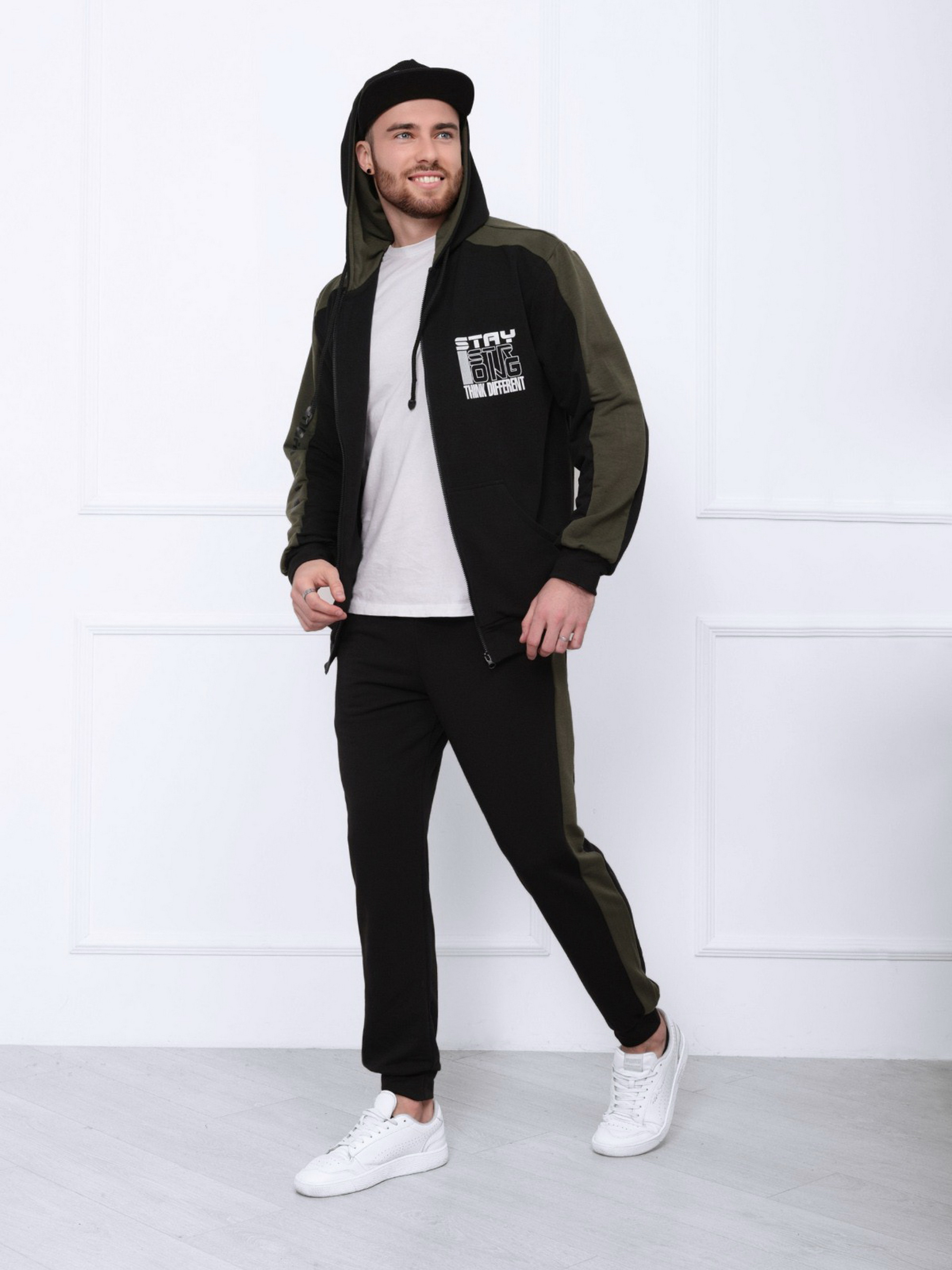 Черный спортивный костюм с вставками цвета хаки сшитый из двухнитного трикотажа и декорированный принтом. Толстовка с манжетами и молнией оснащена карманами и длинными рукавами. Брюки с лампасами и поясной резинкой оснащены манжетами. Материал: Трикотаж.Полуобхват: Кофта: Грудь: S (54), M (56), L (58), XL (60), Длина изделия - 71, Рукав - 67, Брюки: Талия: S (34-38), M (36-40), L (38-42), XL (40-44), Бедра: S (53), M (55), L (57), XL (59), Длина изделия - 98, Длина по внутреннему шву - 72, Ткань: Низкой эластичности.