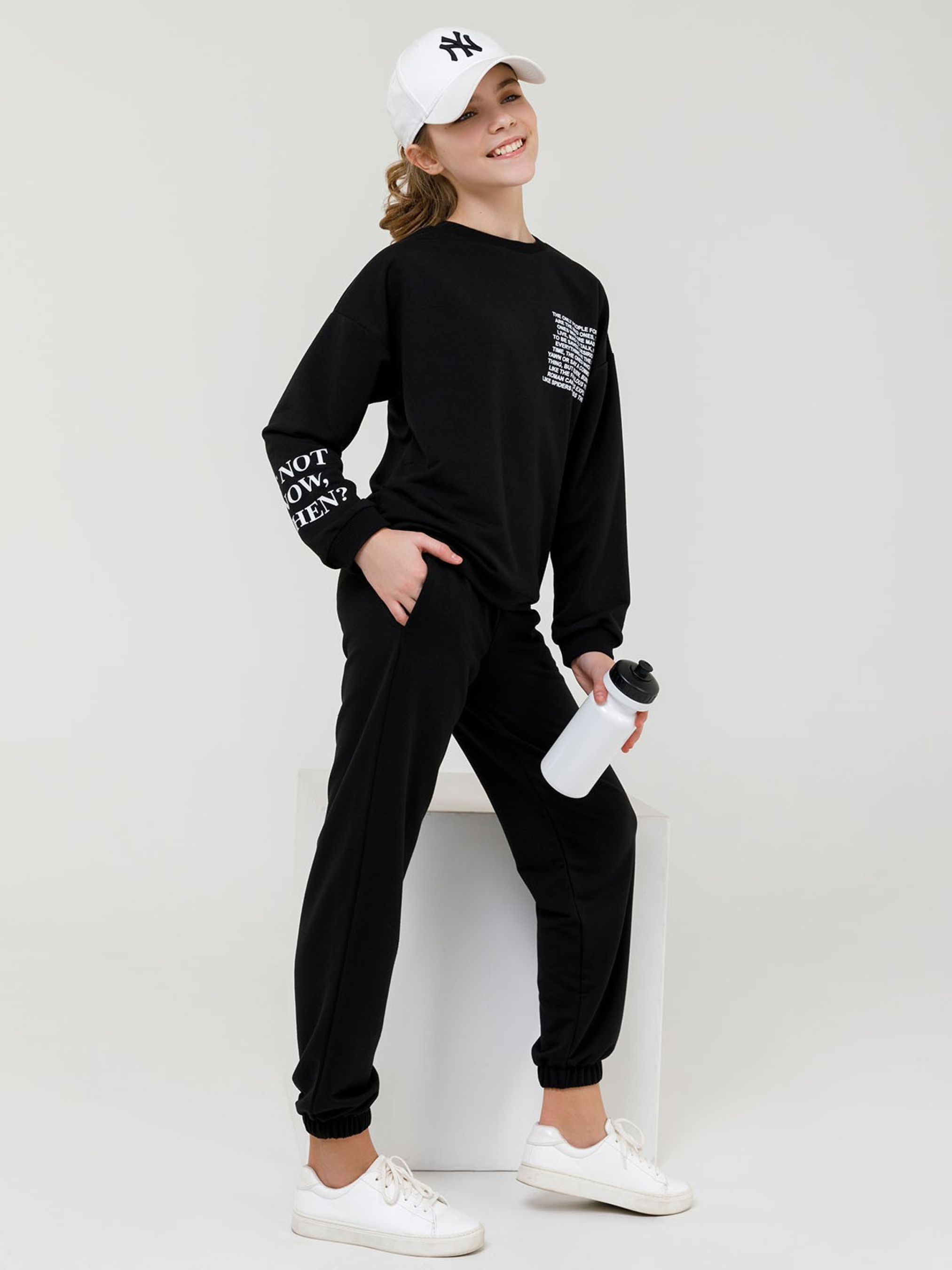 Повседневный черный костюм выполненный из двухнитного трикотажа с надписями на толстовке. Толстовка на манжетах с прямым кроем и длинными рукавами. Брюки-джоггеры с резинками на поясе и манжетах оснащены карманами. Материал: Трикотаж. Полуобхват: Кофта: Грудь: 116 (35), 122 (37), 128 (39), 134 (41), 140 (43), 146 (45), 152 (47), 158 (49), длина изделия - 41, рукав - 35, Брюки: Талия: 116 (25-31), 122 (26-32), 128 (27-33), 134 (28-34), 140 (29-35), 146 (30-36), 152 (31-37), 158 (32-38), Бедра: 116 (33), 122 (35), 128 (37), 134 (39), 140 (41), 146 (43), 152 (45), 158 (47), длина изделия - 69, длина по внутреннему шву - 50, Ткань: низкой эластичности.