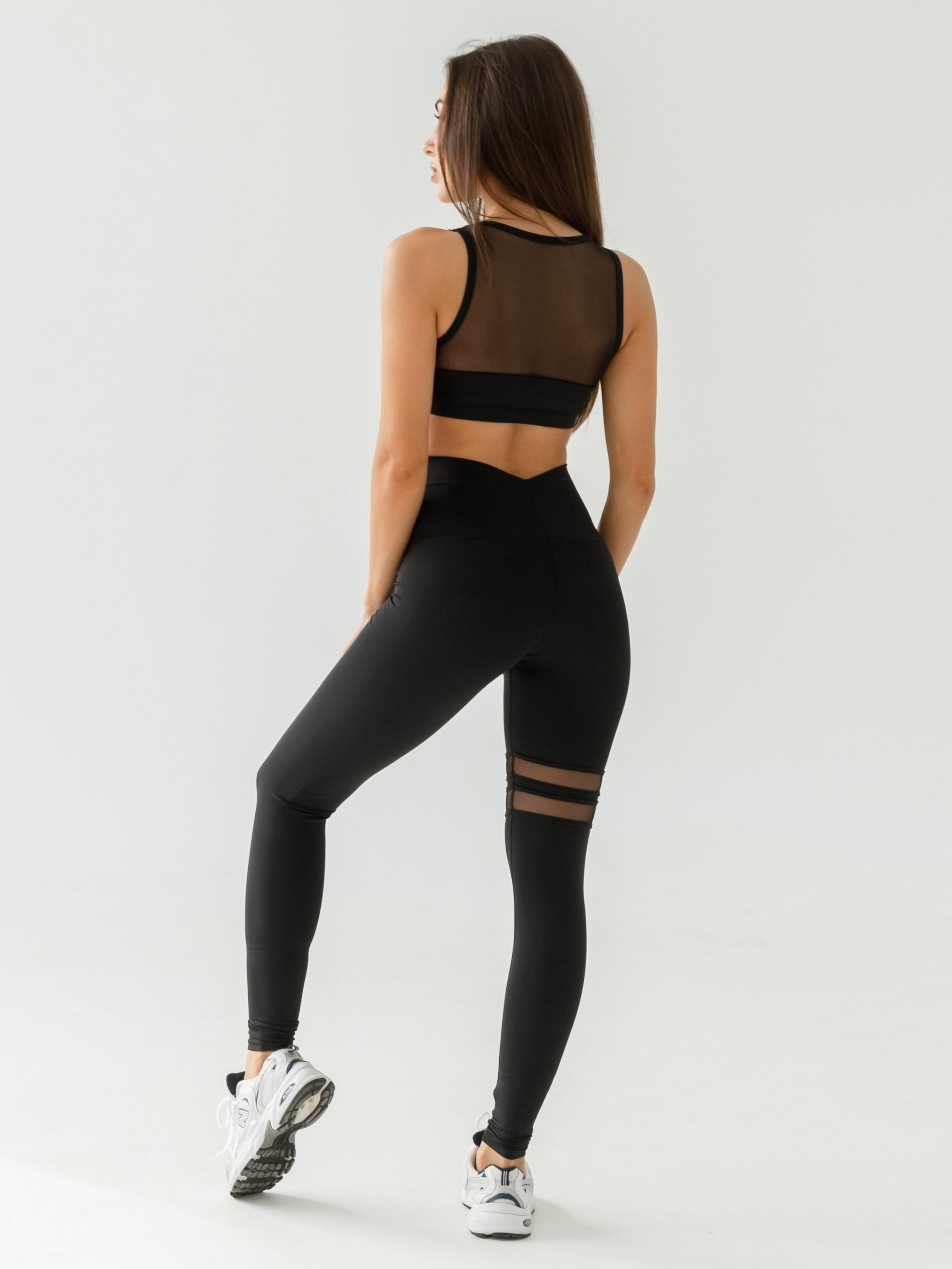 Женский спортивный комплект - лосины и топ, для стретчинга, бега или тренажерного зала. Комплект украшен вставками из сетки. Топ с глубоким декольте и лосины на высокой посадке обеспечит свободу движений. Компрессионная ткань помогает скорректировать форму ягодиц, подтянуть верхнюю часть бедер и живота. Изделие изготовлено из бифлекса — эластичного и прочного материала.