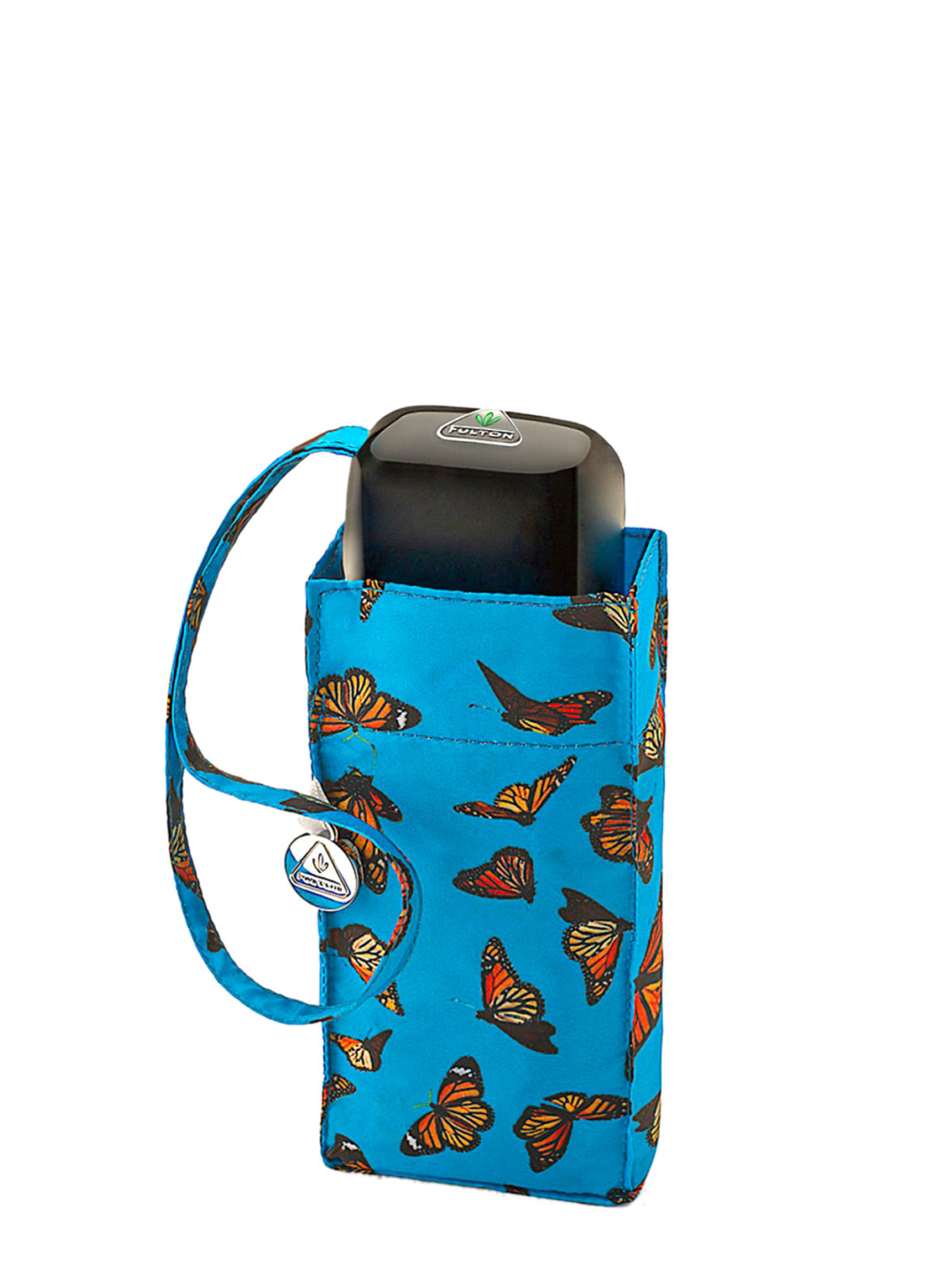 Компактный зонт Fulton Tiny-2 Monarch Butterflies L501 с множеством бабочек Монарах на голубом куполе, он с легкостью поместиться в вашей сумочке. При небольшом размере купола — 85 см — зонт обеспечивает достаточную защиту от дождя. Благодаря лёгкому весу и компактным размерам он легко помещается даже в небольшую сумочку и всегда будет под рукой, когда дождь застанет врасплох. Каркас зонта сделан из алюминия в сочетании с фиберглассом - это придает зонту ветроустойчивость. Вес этого зонтика составляет всего 160 грамм, а размеры в сложенном виде – 15х6х3 см. Ультракомпактная плоская форма позволяет с удобством носить зонт даже в кармане. Механический зонт: раскрывать и закрывать купол зонт, а также складывать надлежит вручную. Система 'Антиветер' не даст сломаться Вашему зонту, даже если его ветер вывернул наизнанку. Небольшие пружинки или гибкие элементы в спицах предотвращают поломку каркаса. При порывах ветра такие спицы будут только гнуться, но не ломаться. Если купол вывернулся наружу, важно не дергать за спицы в попытках вернуть их в первоначальное положение. Достаточно сложить зонт обычным способом.