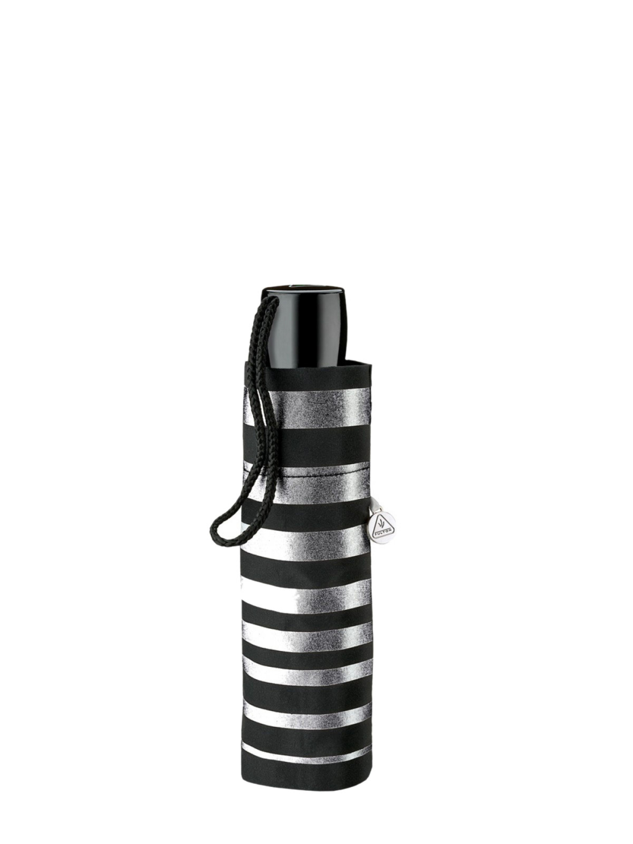 Женский зонт Fulton L354 Minilite-2 Silver Stripes - легкий и компактный аксессуар чёрного цвета с серебряными полосами. Купол зонта создан из высококачественного полиэстера, который быстро сохнет и не линяет. Запатентованный защитный бегунок для предотвращения травм. Каркас изделия выполнен из алюминия, что в сочетании с фиберглассовыми спицами обеспечивает легкость и ветроустойчивость этой модели. Устойчивый к ржавчине. Надежная механическая конструкция и удобная каучуковая ручка. Простой в использовании зонт подойдет к любой одежде и станет надежным защитником от непогоды. Его большой 96-сантиметровый глубокий купол полностью укрывает голову и плечи. К тому же этот зонт очень легкий – его вес всего 238 грамм (прибл. ). Механизм зонта: механика. Открытие и закрытие осуществляется вручную. Чтобы открыть зонт, потяните его бегунок вверх до полного открытия купола. Для закрытия просто нажмите на фиксатор на стержне, аккуратно потяните бегунок вниз по направлению к ручке.