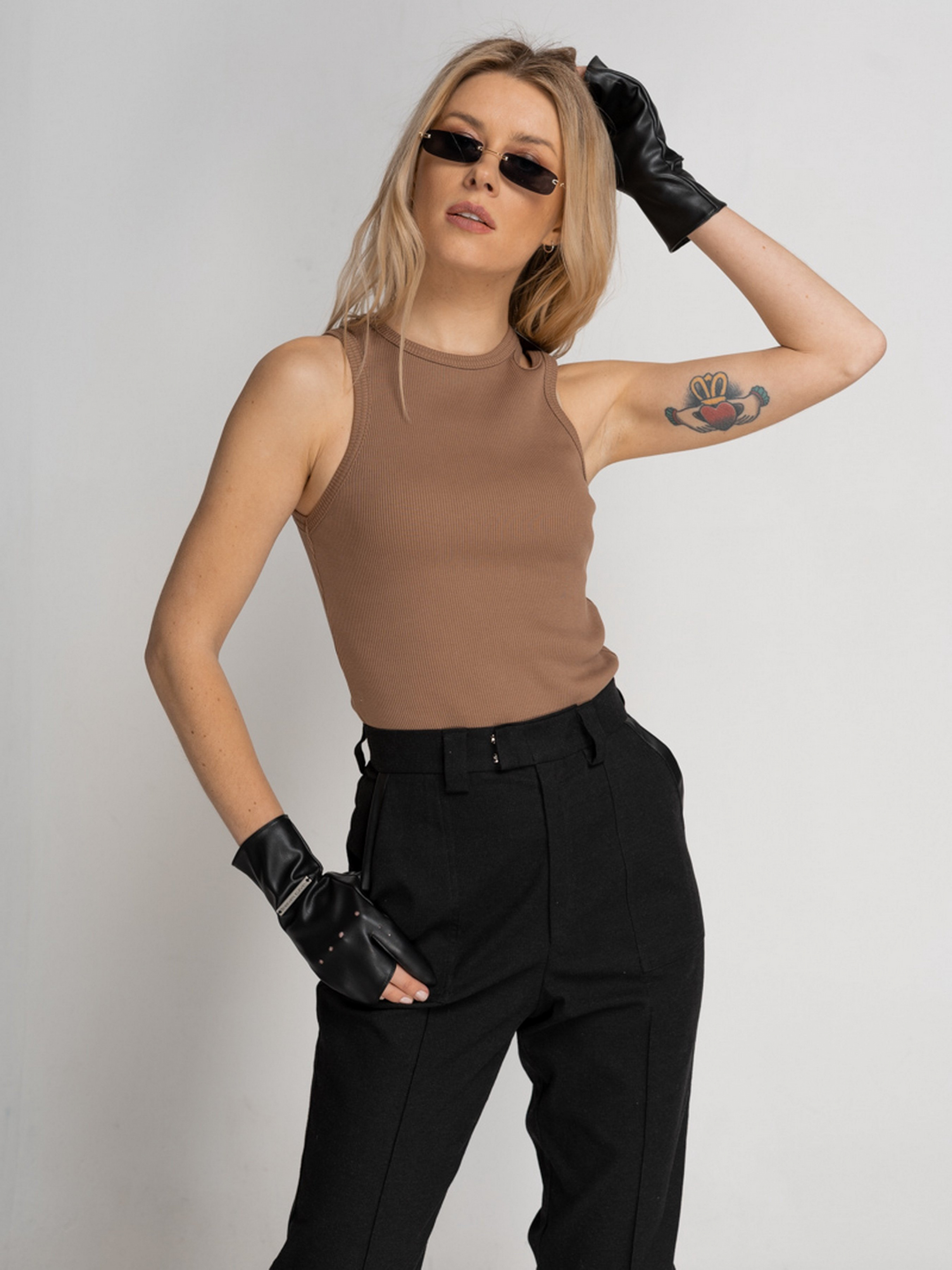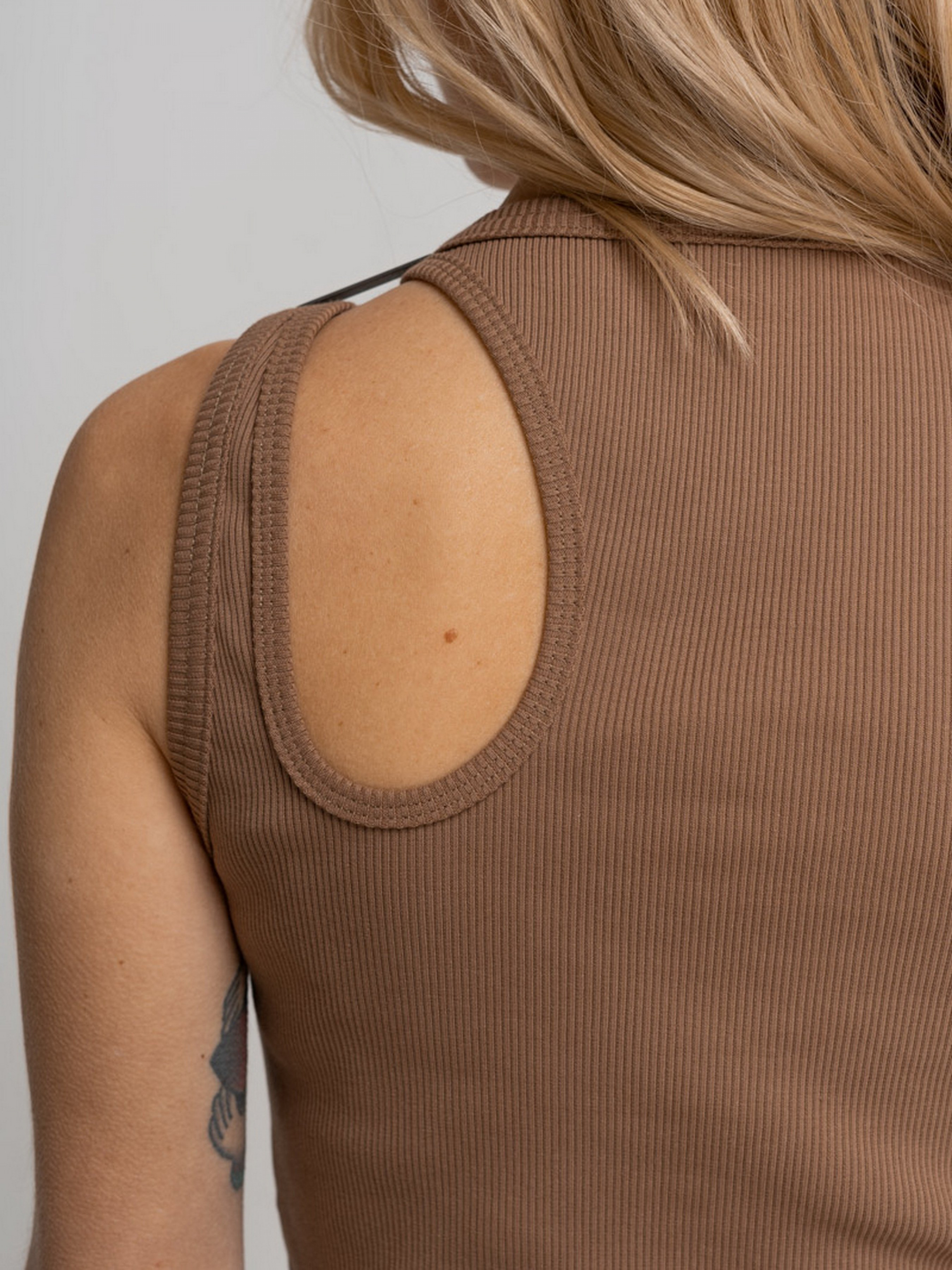 Майка-топ выполнена из хлопковой рибаны бежевого цвета. Круглая горловина, на левом плече вырез. Параметры изделия: Длина по спинке: 54 см Рост модели 174 см, на ней надет размер S. Сезон: Весна/Лето/Осень Рекомендации по уходу: Машинная стирка 40°С. Отжим: 600-800 об. Не использовать режим сушки в стиральной машинке. Не использовать хлорные отбеливатели и средства для выведения пятен. Утюжка изделия: средняя температура, с изнаночной стороны. Состав: 98% Коттон 2% Эластан