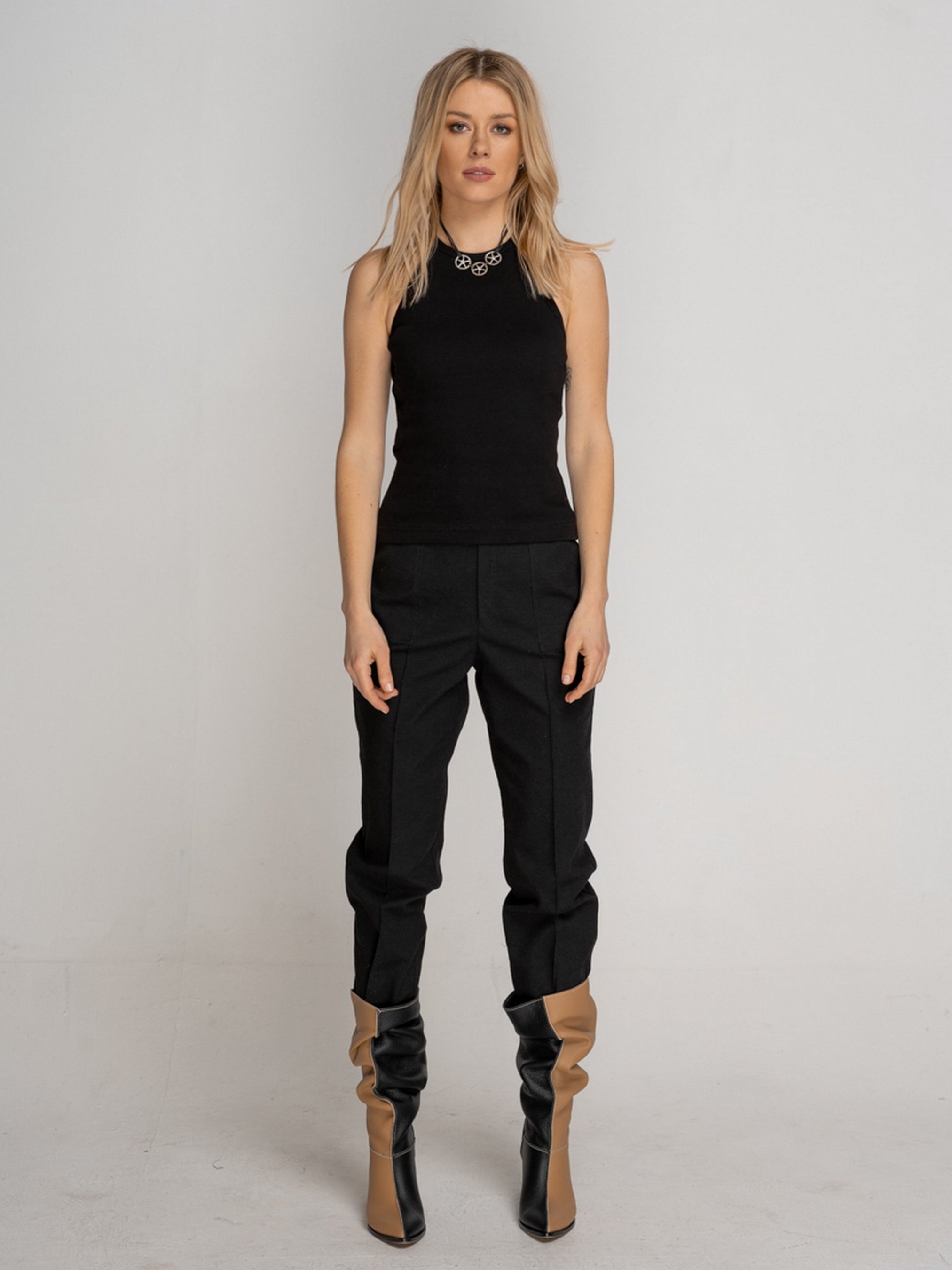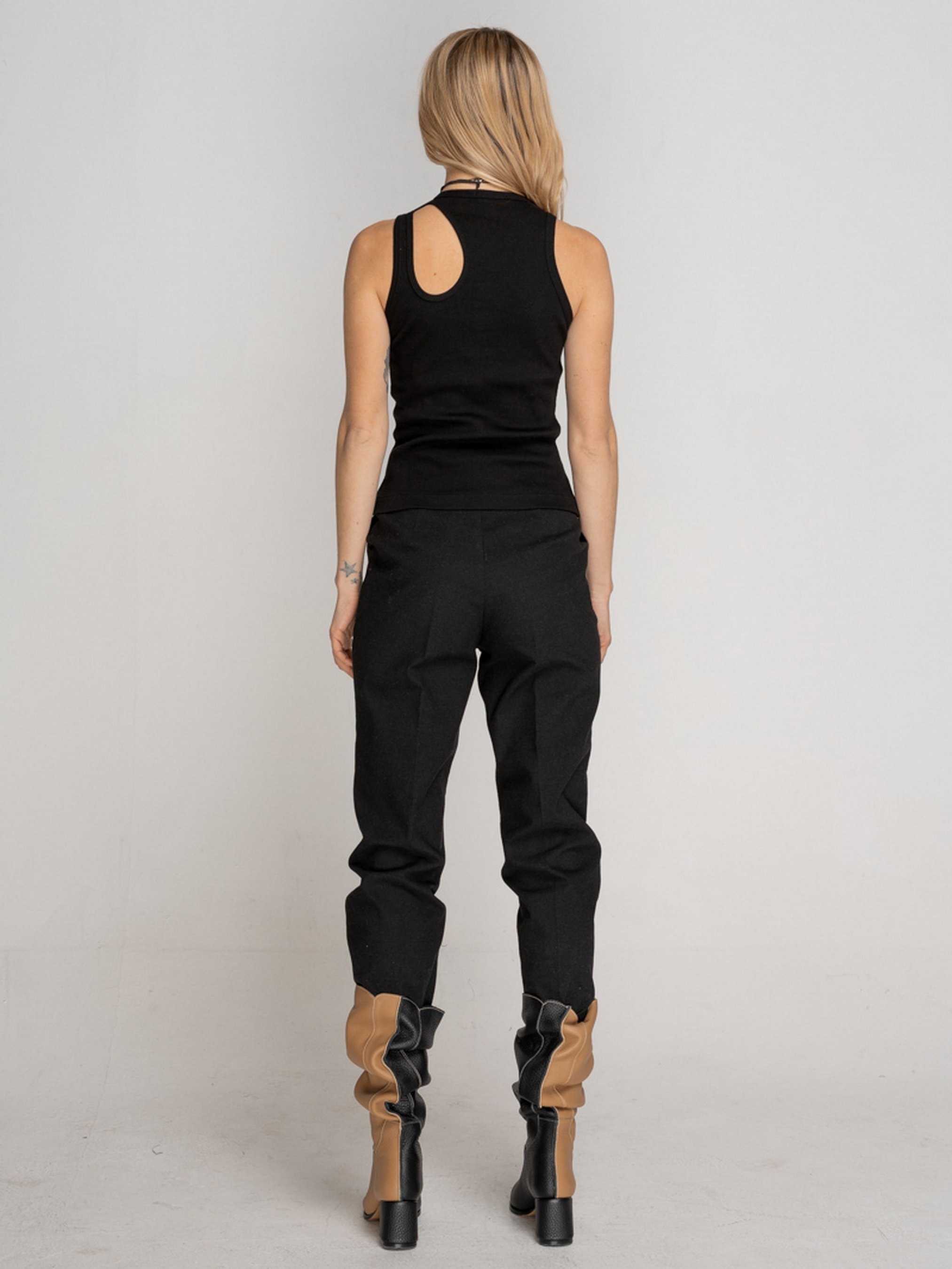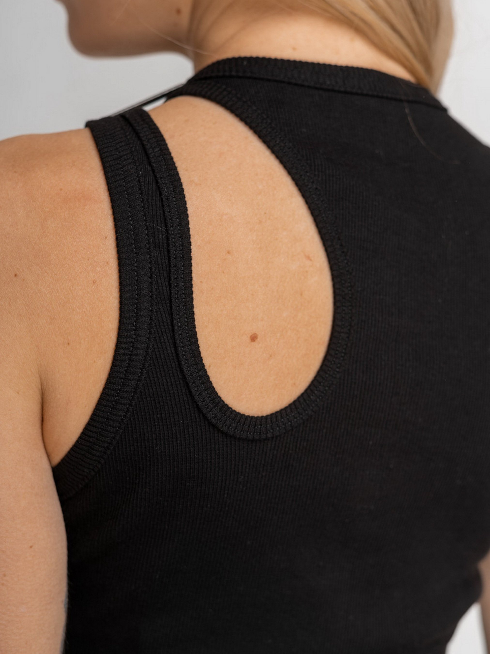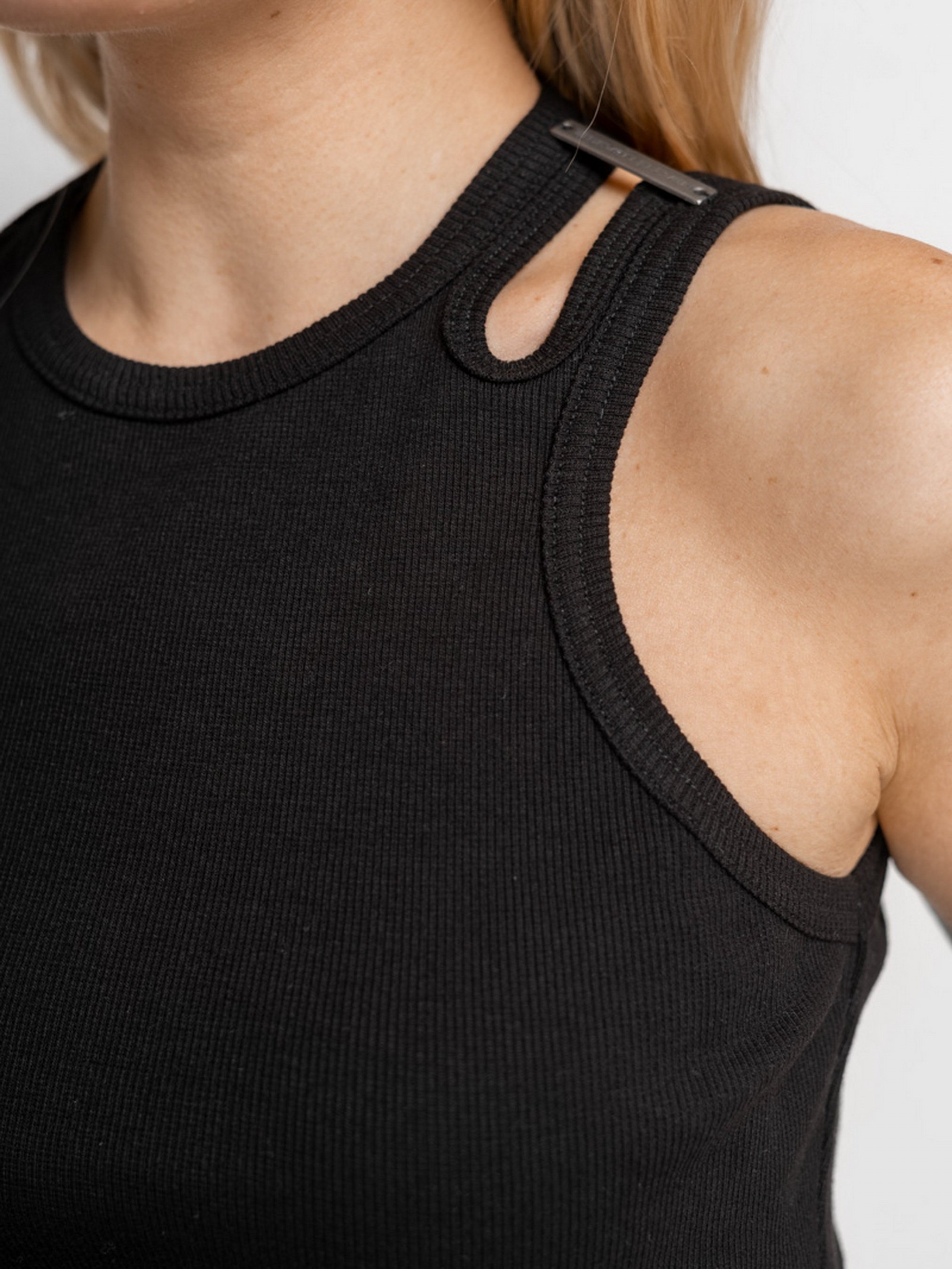 Майка-топ выполнена из хлопковой рибаны черного цвета. Круглая горловина, на левом плече вырез. Параметры изделия: Длина по спинке: 54 см Рост модели 174, на ней надет размер S. Сезон: Весна/Лето/Осень Рекомендации по уходу: Машинная стирка 40°С. Отжим: 600-800 об. Не использовать режим сушки в стиральной машинке. Не использовать хлорные отбеливатели и средства для выведения пятен. Утюжка изделия: средняя температура, с изнаночной стороны. Состав: 98% Коттон 2% Эластан