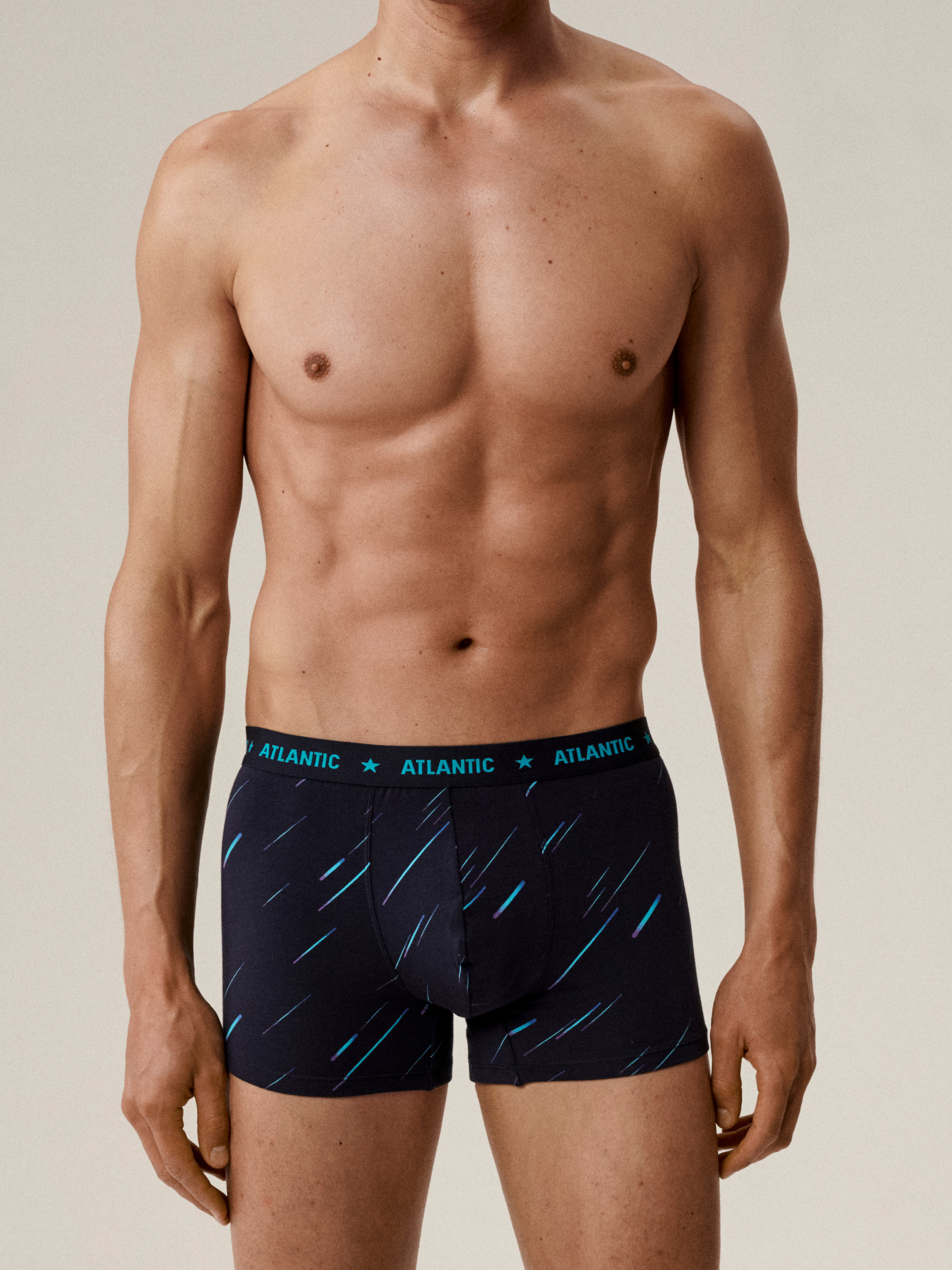 Набор мужских трусов-боксеров Atlantic из 3 штук Этот набор сочетает комфорт, практичность и современный стиль. Трусы выполнены из хлопкового трикотажа, который мягко прилегает к телу, обеспечивает отличную воздухопроницаемость и комфорт на протяжении всего дня. Модель имеет анатомический крой, повторяющий контуры тела для естественной посадки и свободы движений. Внешняя мягкая резинка надежно фиксирует изделие на талии, не создавая дискомфорта. В набор входят три пары трусов: две с абстрактным принтом и одна однотонная, что делает комплект универсальным и стильным для повседневного использования. Особенности модели: Хлопковый трикотаж — мягкость, воздухопроницаемость и комфорт; Анатомический крой — идеальная посадка и свобода движений; Внешняя резинка — надежная фиксация на талии; Две пары с абстрактным принтом и одна однотонная — стиль и универсальность; Идеальный набор для повседневного ношения и домашнего комфорта. Набор мужских трусов Atlantic — сочетание комфорта, практичности и современного дизайна.
