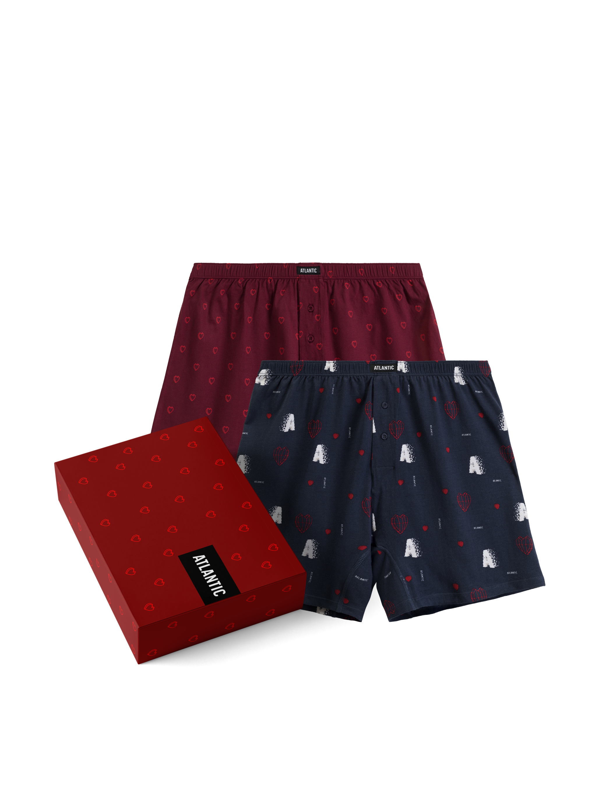 Подарочный набор мужских боксеров Atlantic из натурального хлопка Оригинальный набор мужских боксеров свободного кроя — идеальный вариант подарка, сочетающий комфорт, качество и немного юмора. В комплект входят две пары трусов из натурального хлопка: красные с принтом в виде сердец — яркий и игривый вариант, поднимающий настроение; темно-синие со стилизованной буквой “А” — более сдержанная и универсальная модель. Мягкий хлопковый материал обеспечивает комфорт на протяжении всего дня, а свободный крой не стесняет движений. По талии — удобная туннельная резинка, аккуратно зафиксированная в поясе и не давящая на кожу. Особенности модели: 100% натуральный хлопок — приятный и воздухопроницаемый материал; Свободный крой для максимального комфорта; Мягкая туннельная резинка по талии; Две стильные расцветки в одном наборе; Упакован в подарочную коробку — готов к вручению. Подарочный набор боксеров Atlantic — практичный и стильный подарок с индивидуальностью.