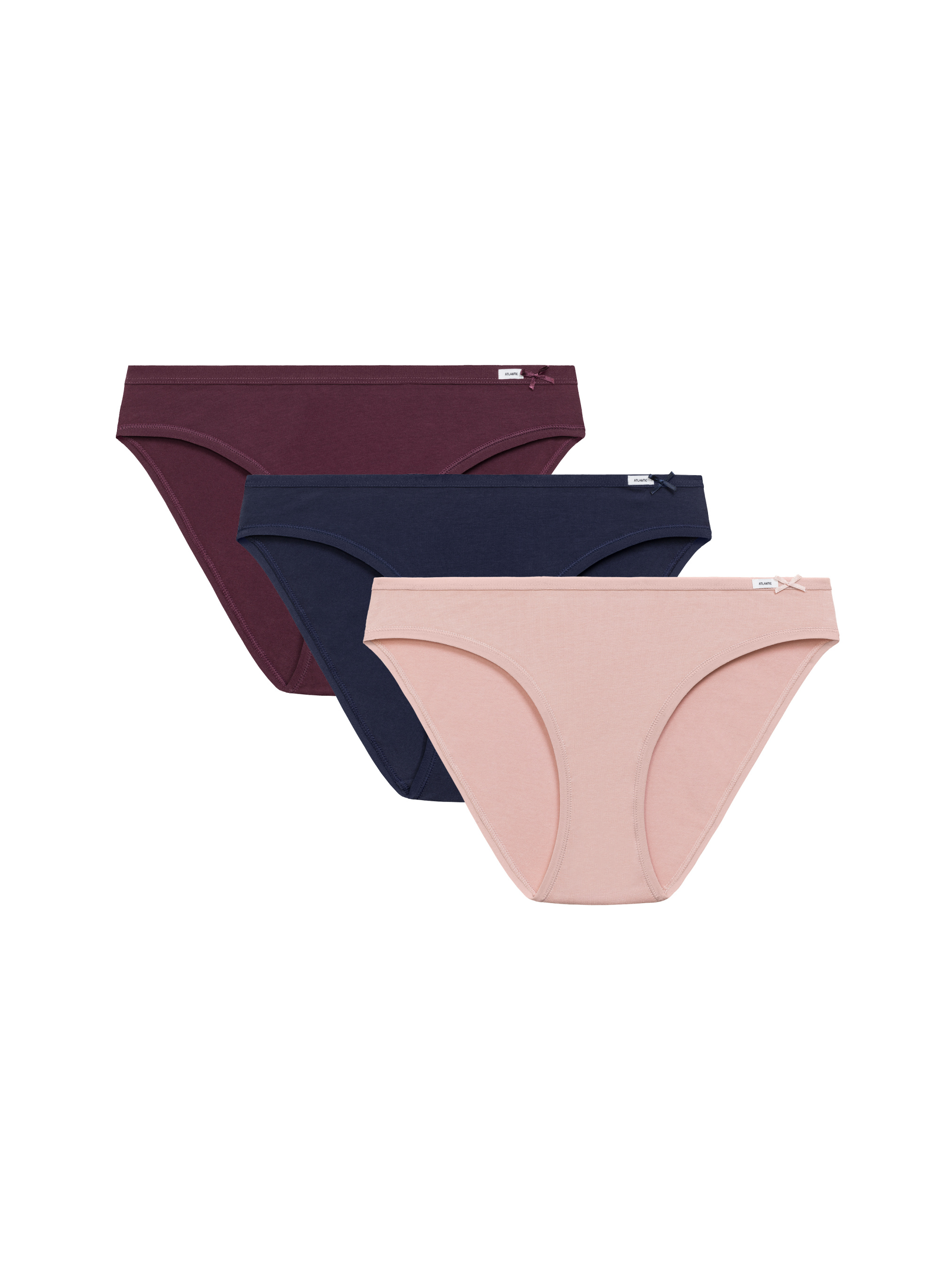 Набор женских трусиков-бикини Atlantic из 3 штук Комфортный и практичный набор трусиков-бикини выполнен из качественного хлопка с добавлением 5% эластана (95% хлопок, 5% эластан), что обеспечивает мягкость, эластичность и приятное прилегание к телу. Модель имеет классический крой бикини, обеспечивающий свободу движений и комфорт на протяжении всего дня. Эластичная ткань и аккуратная посадка позволяют изделию держать форму и не сдавливать кожу. В набор входят три пары трусиков разных цветов: розовые, бордовые и синие что делает комплект универсальным и подходящим под разные образы и наряды. Особенности модели: Хлопок с эластаном — мягкость, эластичность и комфорт; Классический крой бикини — удобство и свобода движений; Три универсальные расцветки — практичный набор для повседневного ношения; Подходит для любого гардероба и образа. Женские трусики-бикини Atlantic — сочетание комфорта, качества и универсального стиля.