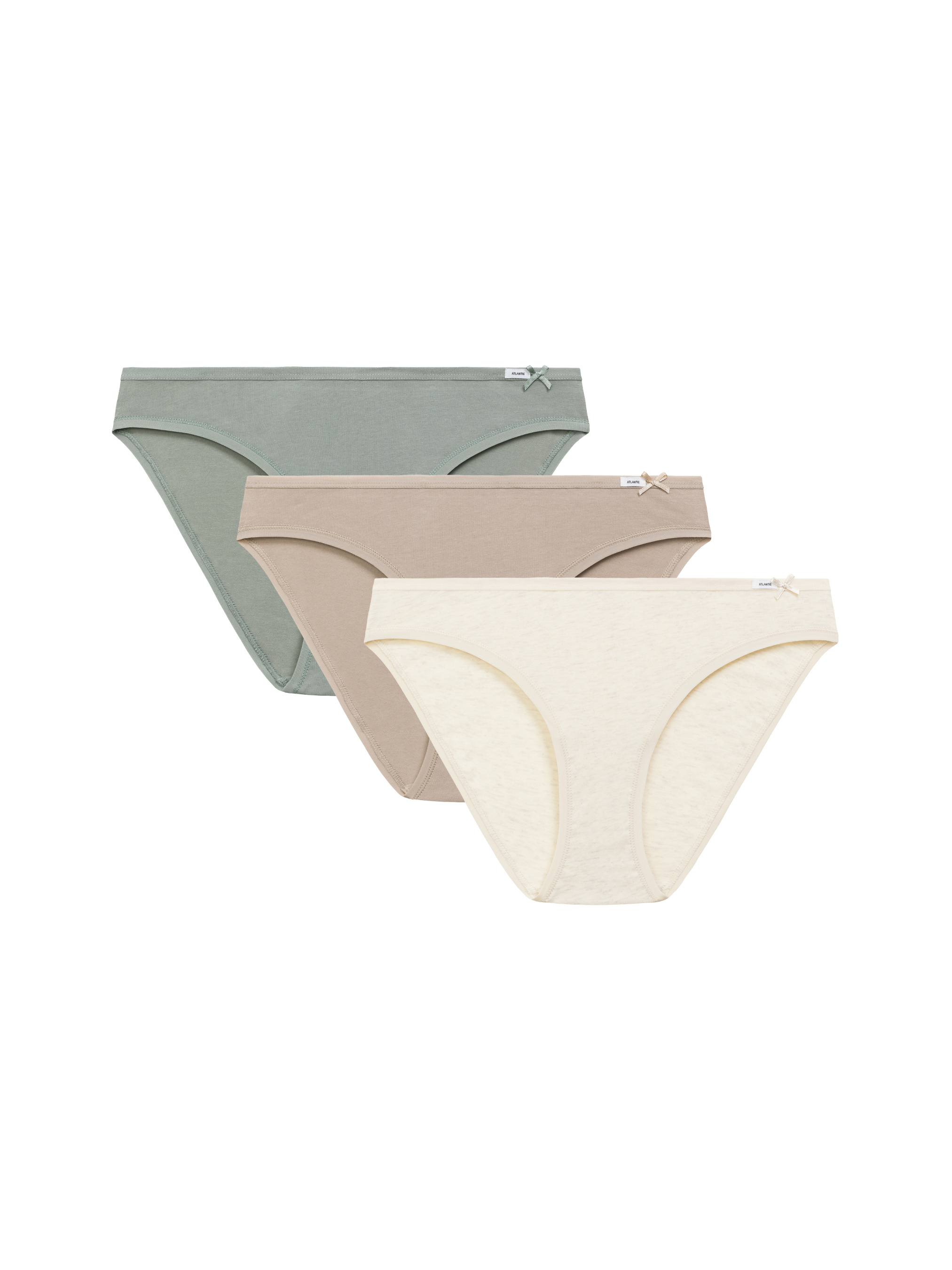 Набор женских трусиков-бикини Atlantic из 3 штук Комфортный и практичный набор трусиков-бикини выполнен из качественного хлопка с добавлением 5% эластана (95% хлопок, 5% эластан), что обеспечивает мягкость, эластичность и приятное прилегание к телу. Модель имеет классический крой бикини, обеспечивающий свободу движений и комфорт на протяжении всего дня. Эластичная ткань и аккуратная посадка позволяют изделию держать форму и не сдавливать кожу. В набор входят три пары трусиков разных цветов: темно-бежевые, зеленые и бежевые, что делает комплект универсальным и подходящим под разные образы и наряды. Особенности модели: Хлопок с эластаном — мягкость, эластичность и комфорт; Классический крой бикини — удобство и свобода движений; Три универсальные расцветки — практичный набор для повседневного ношения; Подходит для любого гардероба и образа. Женские трусики-бикини Atlantic — сочетание комфорта, качества и универсального стиля.