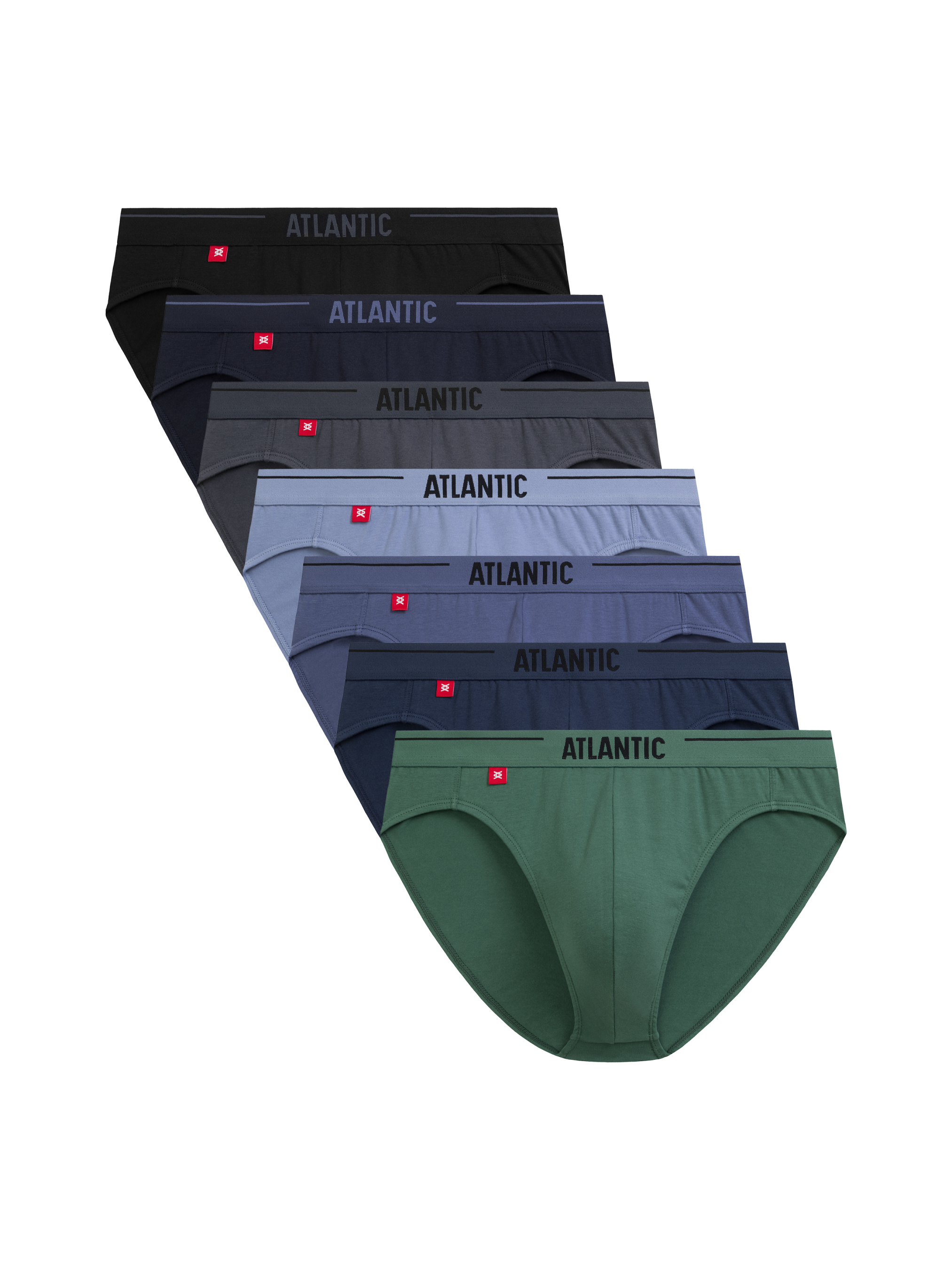 Набор мужских трусов слипов с анатомическим кроем и внешней резинкой — стильный и лаконичный комплект для ежедневного ношения. В набор входят 7 пар: синего, графитового, голубого, темно-синего, зеленого, черного и цвета деним с чистым, современным дизайном. Анатомический крой обеспечивает точную посадку и свободу движений, а внешняя эластичная резинка с принтом в виде стилизованной надписи Atlantic подчёркивает фирменный стиль, не перегружая визуал. Ткань — 95% хлопок, 5% эластан. Натуральный хлопок мягкий, хорошо проветривается и комфортен для кожи, а эластан добавляет лёгкую растяжимость и помогает сохранять форму даже после частых стирок. Такая комбинация делает изделие приятным в длительном использовании и аккуратным в уходе. Мужское белье Atlantic в этом наборе — минимализм, качество материалов и практичность, легко вписывающиеся в любой гардероб.