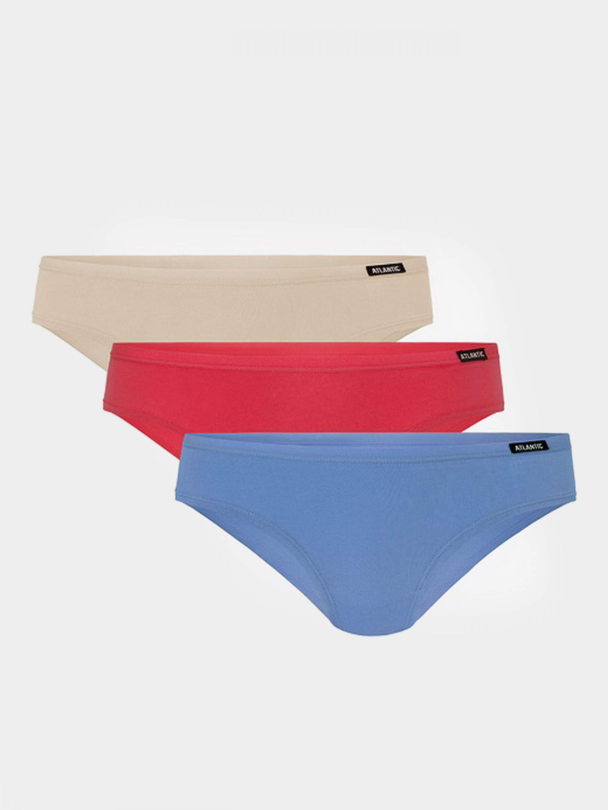 Набор женских трусов Atlantic, модель Бикини. В наборе 3 однотонных трусов следующих цветов: коралловый, голубой и экрю. Трусы-бикини характеризуется заниженной талией с небольшим лого ATLANTIC и универсальной боковой частью. Нижнее белье изготовлено из мягкой на ощупь и легкой ткани, которую мы называем thin & light (то есть тонкая и легкая), представляющая собой сочетание хлопка и эластана. Трусы идеально облегают тело и обеспечивает максимальный комфорт. Основные характеристики: идеально на каждый день красиво сидят на фигуре легкий и приятный на ощупь трикотаж обеспечение максимального комфорта