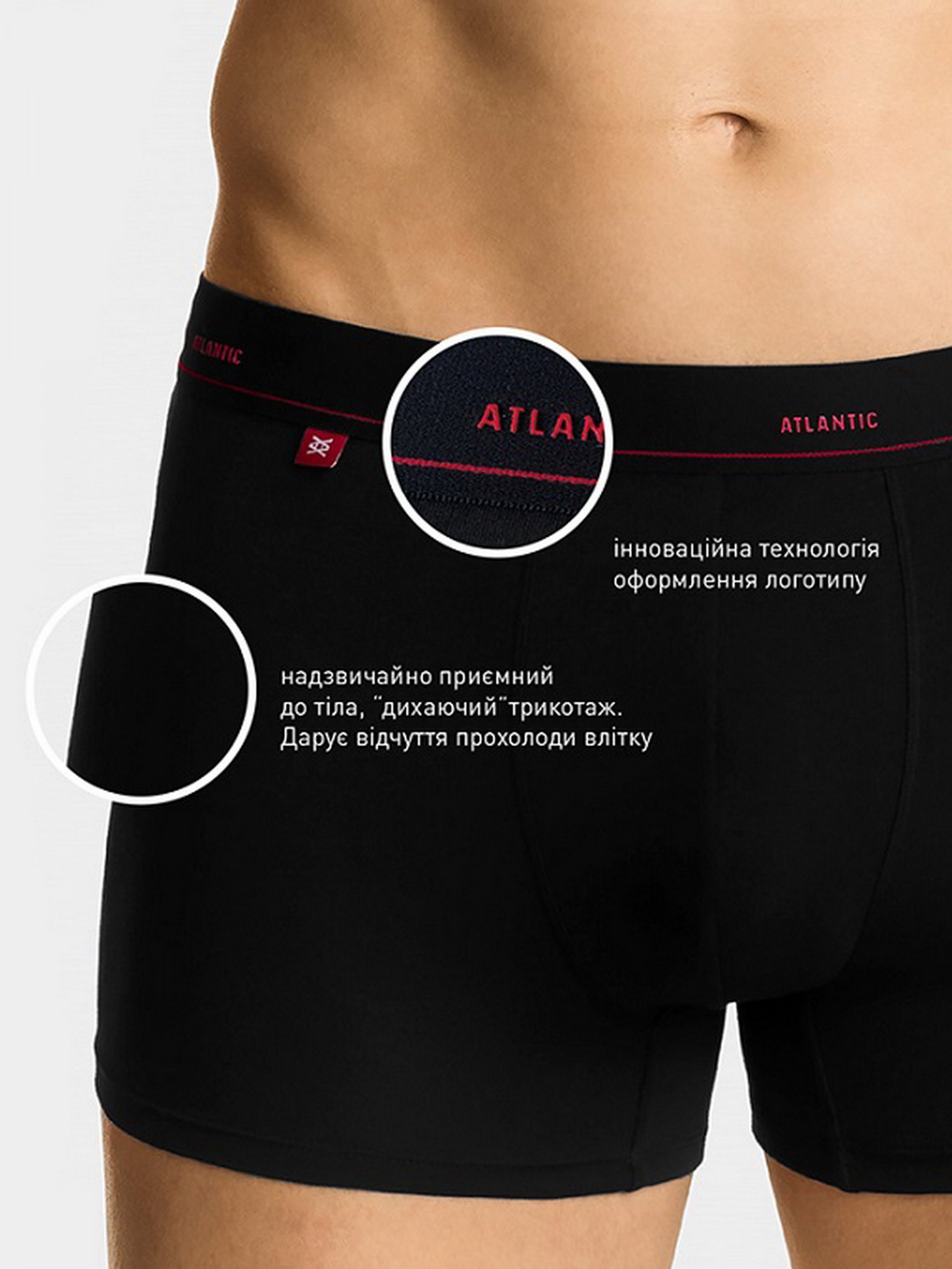 Мужские шорты-боксеры черного цвета с широкой мягкой резинкой в талии с надписью ATLANTIC красного цвета. Шорты выполнены в спортивном дизайне, имеют универсальную длину штанин и слегка заниженную талию. Мягкая и приятная на ощупь резинка не сжимает тело и не вызывает дискомфорт. Нижнее белье изготовлено из трикотажной ткани, которая представляет собой сочетание нежного пима-хлопка, тонкого и шелковистого модала и эластана. Идеальная для кожи ткань хорошо пропускает воздух и предотвращает чрезмерное потоотделение. Шорты обеспечивают самый высокий уровень комфорта при использовании. Основные характеристики: спортивный дизайн идеально прилегает к телу мягкая комфортная резинка высококачественный трикотаж максимальный комфорт