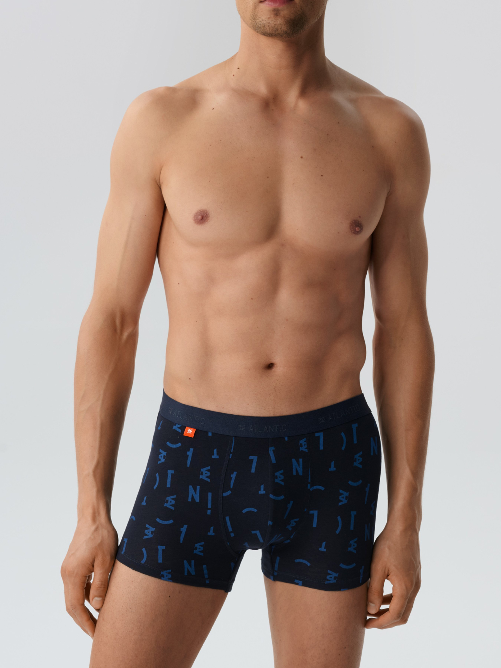 Комплект мужских трусов Atlantic 3 штуки. В набор вошли мужские трусы-шорты синего цвета с темно-синим принтом «буквы», однотонные голубые и темно-синие трусы с принтом «буквы». Модель трусов шорты – это сочетание средней линии талии и комфортной длины штанин. Анатомическая посадка делает это белье удобным в каждодневном использовании. По талии идет мягкая внешняя резинка с силиконовой надписью Atlantic. Шорты пошиты из натурального хлопкового волокна в сочетании с небольшим добавлением эластана, что делает ткань более долговечной и устойчивой к деформации.с