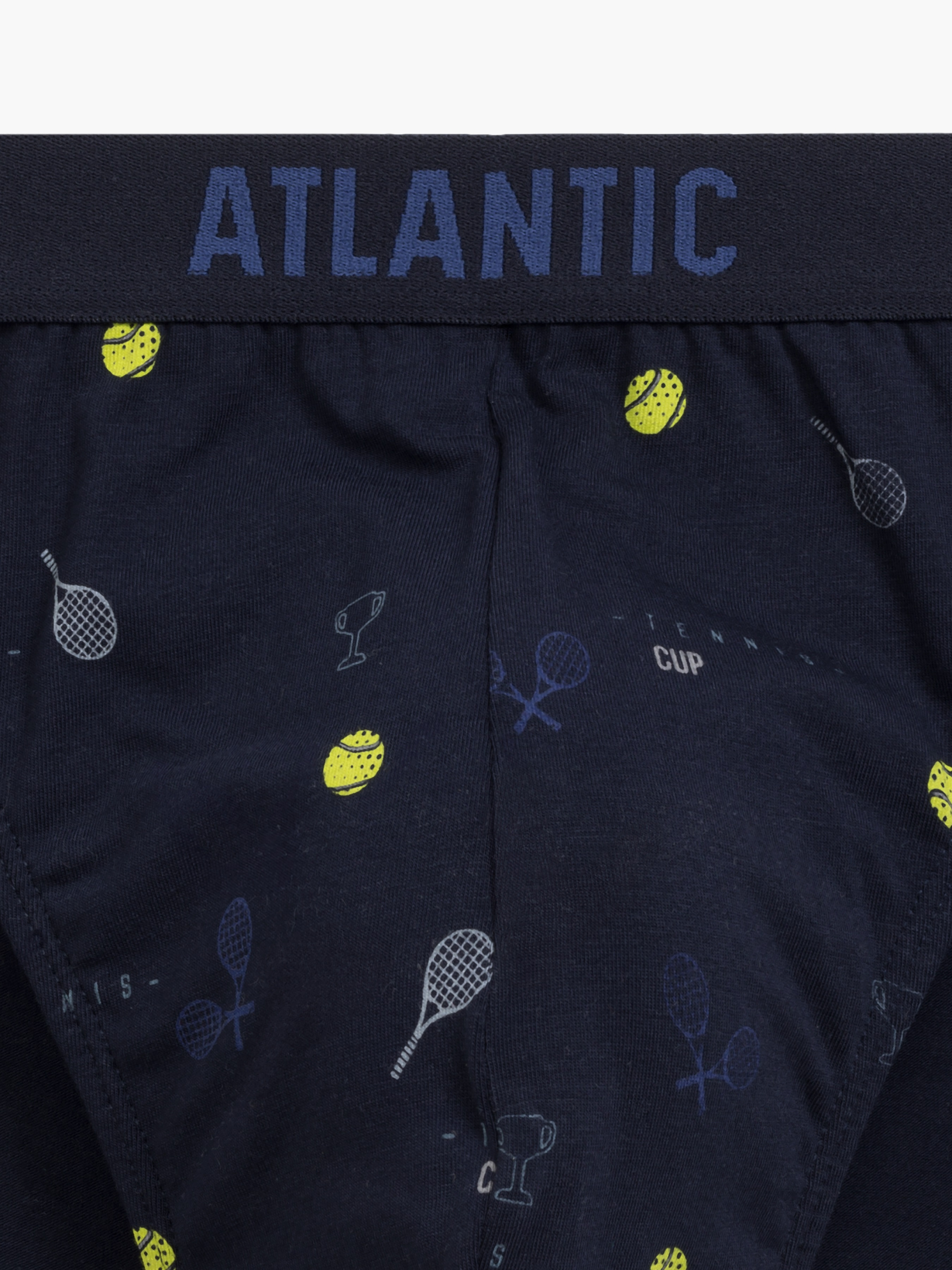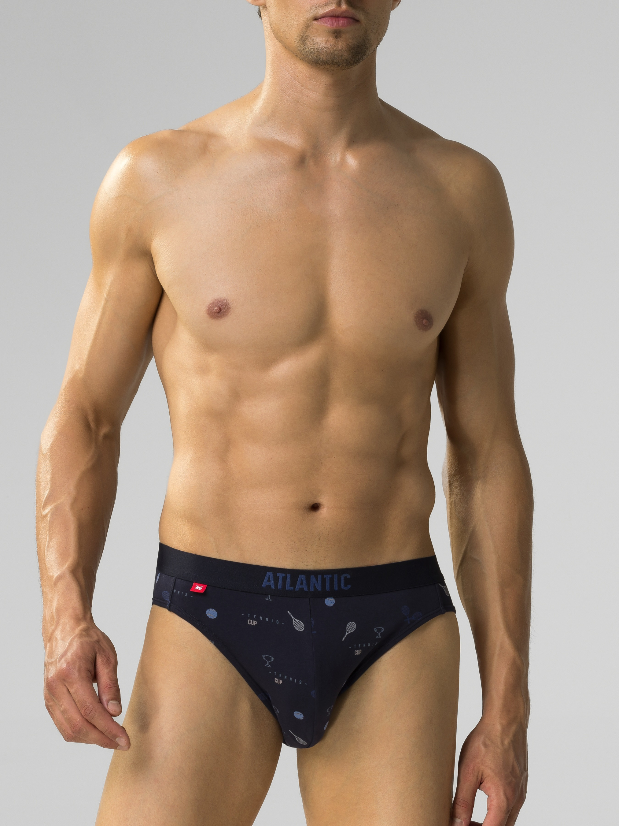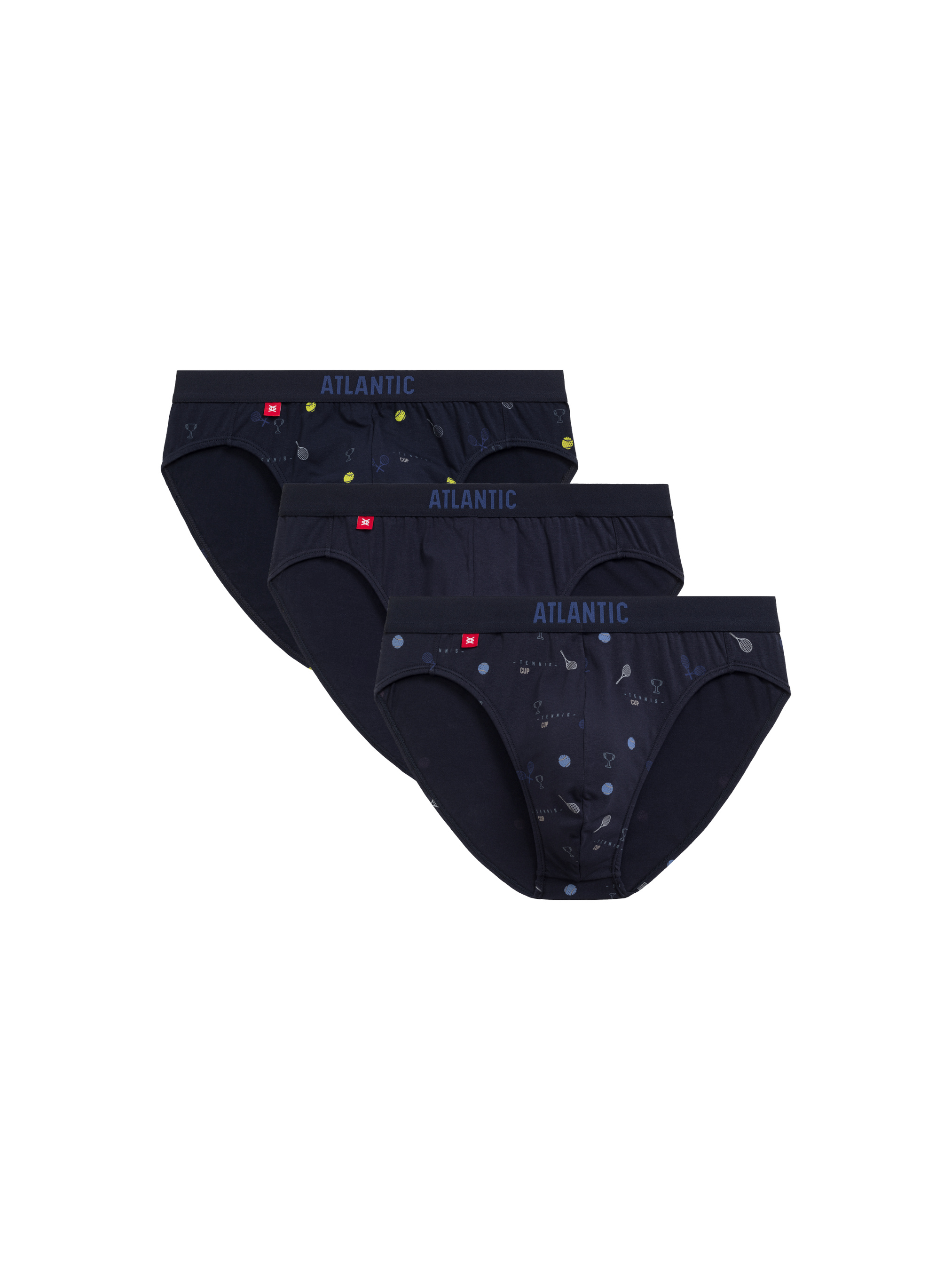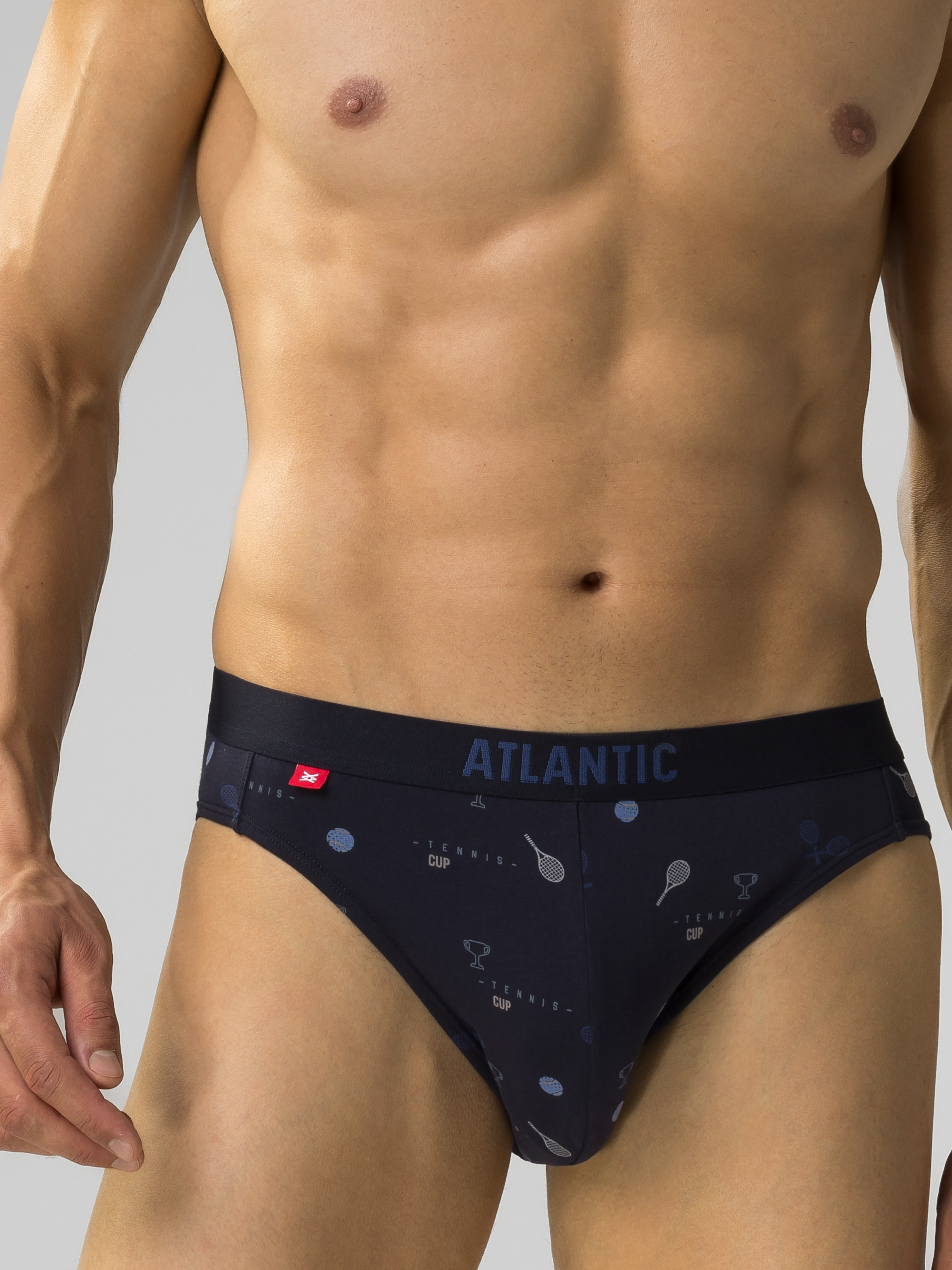 Набор мужских трусов спорт из трех штук. В комплекте трусы синего цвета с принтом «Теннис». Модель отличается средней высотой посадки, невысокими боковыми частями и полностью закрытыми ягодицами. Удобная, внешняя эластичная резинка по талии обеспечивает надежную фиксацию без передавливания. Трусы пошиты из натурального хлопка с небольшим добавлением эластана. Хлопок хорошо пропускает воздух и впитывает влагу, что делает их комфортными для повседневного ношения. Эластан обеспечивает лучшую эластичность и плотное прилегание. Преимущества: Обеспечивают отличную поддержку при активных движениях. Отличный выбор для тренировок, занятий спортом или просто активного дня. Хорошо подходят для тех, кто предпочитает носить узкую одежду, так как трусы не образуют складок и не видны под одеждой. Трусы Атлантик со спортивной посадкой — это идеальный вариант для тех, кто ищет баланс между комфортом, поддержкой и стилем, особенно при активном образе жизни.