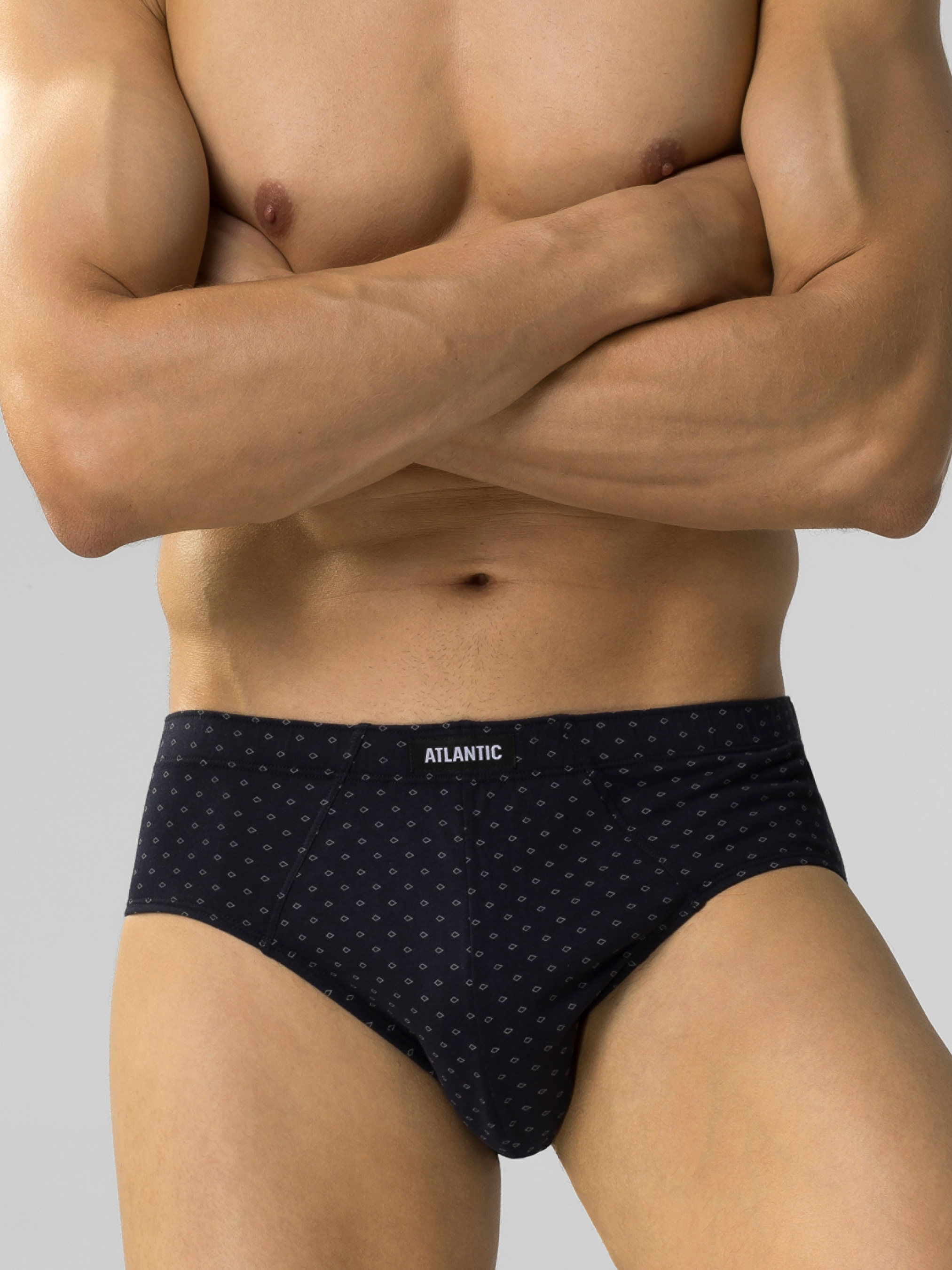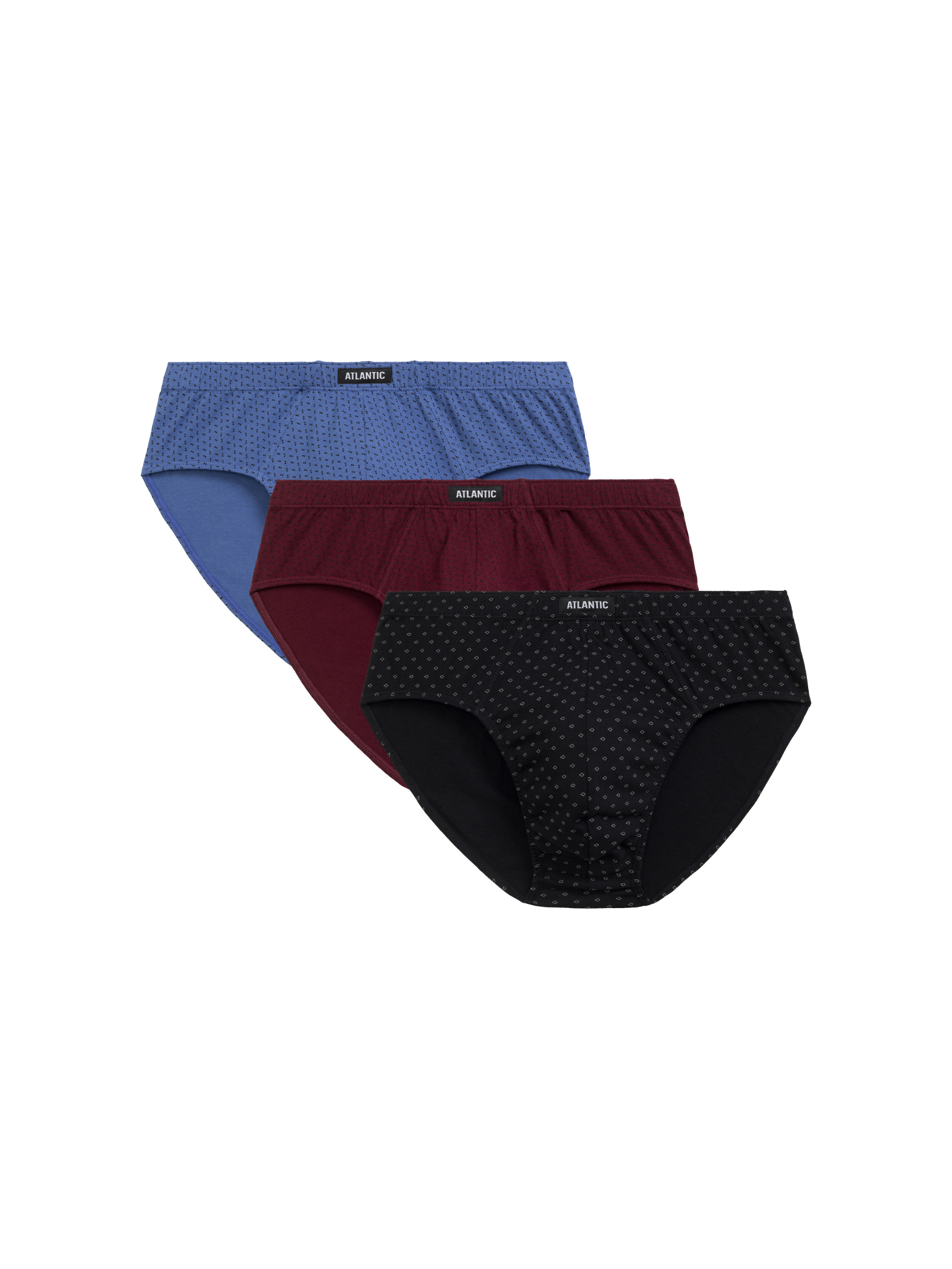 "Трусы мужские Atlantic классического кроя 3 штуки. В наборе трусы голубого, бордового и темно-синего цвета. Все трое трусов украшены небольшим геометрическим принтом. Классический крой – это широкая боковая часть, максимально закрытые ягодицы и высокая посадка. По талии идет мягкая внутренняя резинка, предотвращающая скатывание белья. Трусы изготовлены из 100% натурального хлопка. Хлопковая ткань хорошо производит воздух и отводит избыточную влагу, предупреждая раздражение. Трусы прекрасно подходят для ежедневного использования, занятия спортом и активного отдыха."