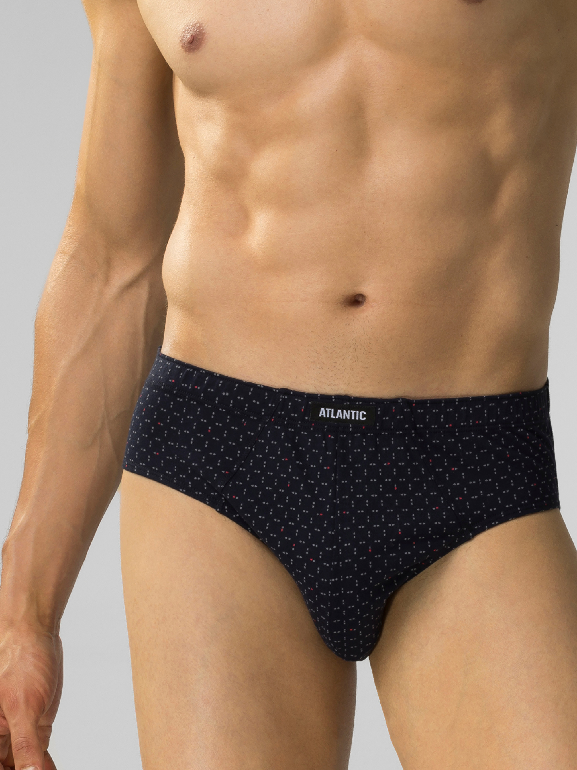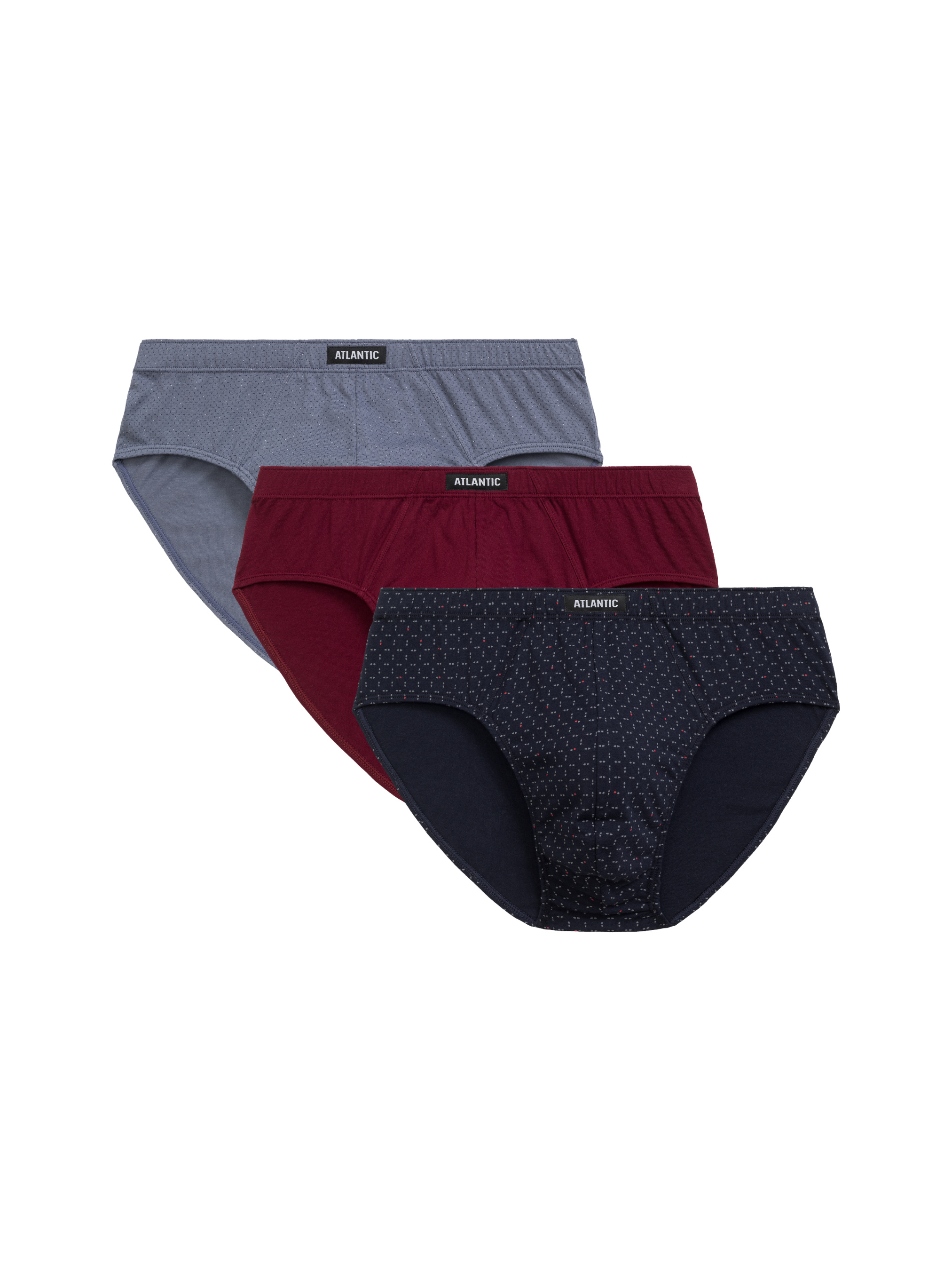 Трусы мужские Atlantic классического кроя 3 штуки. В наборе двое принтованных трусов -синего и голубого цвета и однотонные бордовые. Классический крой – это широкая боковая часть, максимально закрытые ягодицы и высокая посадка. По талии идет мягкая внутренняя резинка, предотвращающая скатывание белья. Трусы изготовлены из 100% натурального хлопка. Хлопковая ткань хорошо производит воздух и отводит избыточную влагу, предупреждая раздражение. Трусы прекрасно подходят для ежедневного использования, занятия спортом и активного отдыха.