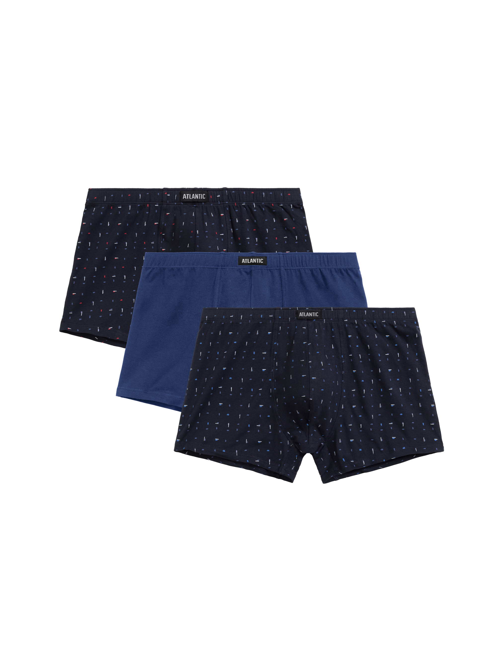 Комплект мужских трусов-шорт из трех штук сочетает комфорт и стиль благодаря высококачественному материалу и современному дизайну. Выполненные из мягкого хлопка с небольшим добавлением эластана, они обеспечивают отличную воздухопроницаемость и удобную посадку, слегка растягиваясь для оптимального комфорта. Приятный на ощупь материал не вызывает раздражения, а эластичная резинка на поясе надежно удерживает трусы на месте, не пережимая кожу. В наборе двое принтованных трусов темно-синего цвета и одни однотонные голубые. Дизайн с мелким геометрическим рисунком придает комплекту стильный и универсальный вид, который подойдет для любого случая. Комплект включает три пары — идеальный выбор для повседневного комфорта и разнообразия.