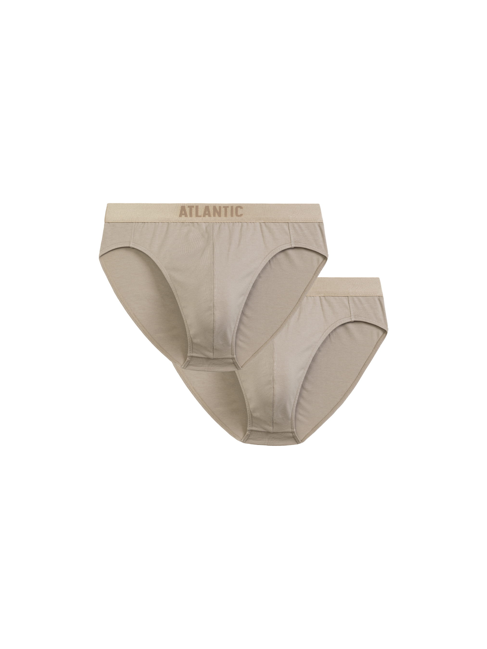 Комплект мужского нижнего белья Atlantic бежевого цвета с широкой внешней резинкой с крупным лого Atlantic. В наборе двое одинаковых русов. Модель выполнена в спортивном стиле, с заниженной талией, средней шириной боковых частей и анатомическим кроем. Пошиты из хлопкового волокна пима. Пима отличается от обычного хлопка более длинными и гибкими волокнами. Известен отличной прочностью и своими влагопоглощающими свойствами.