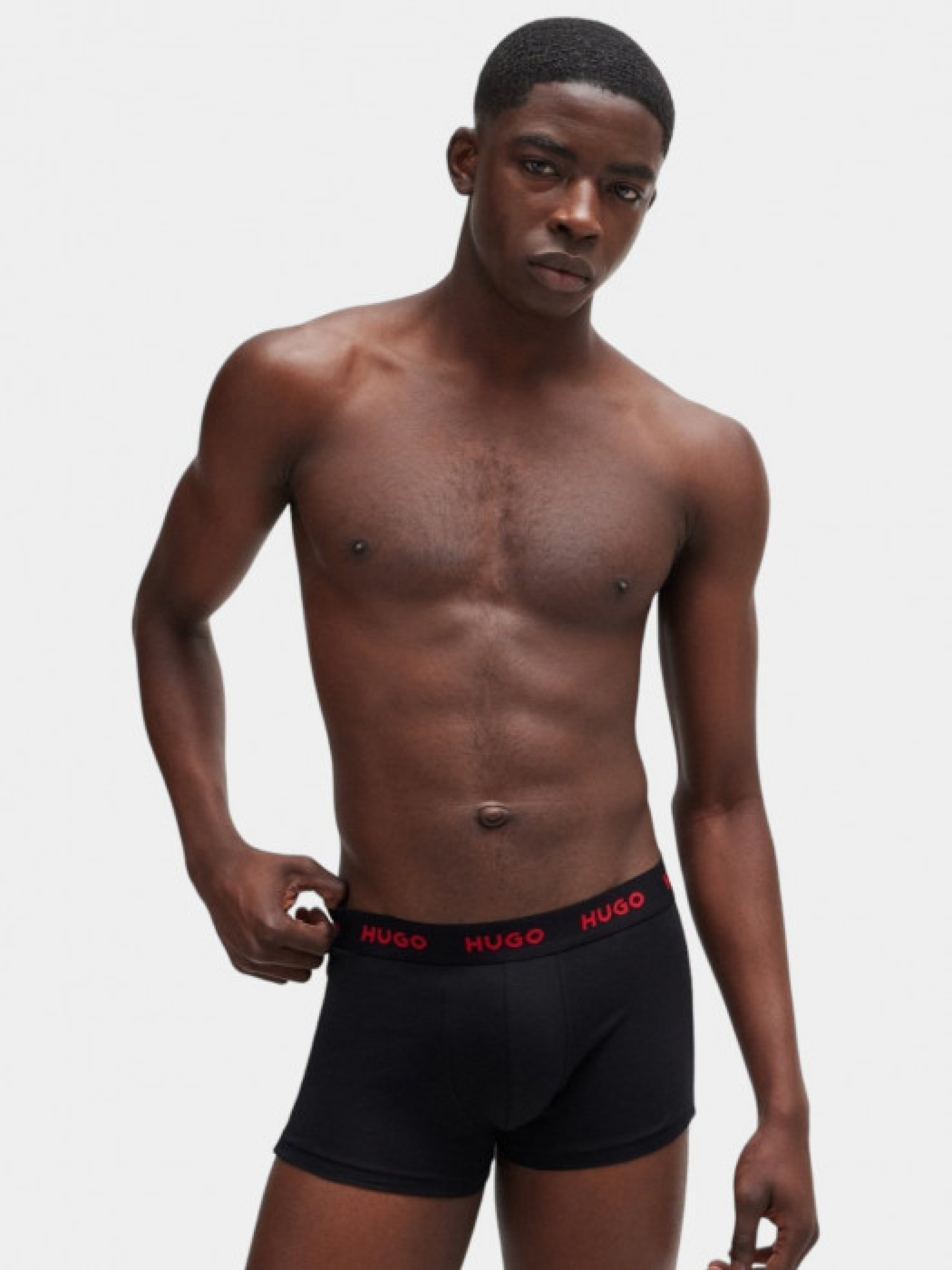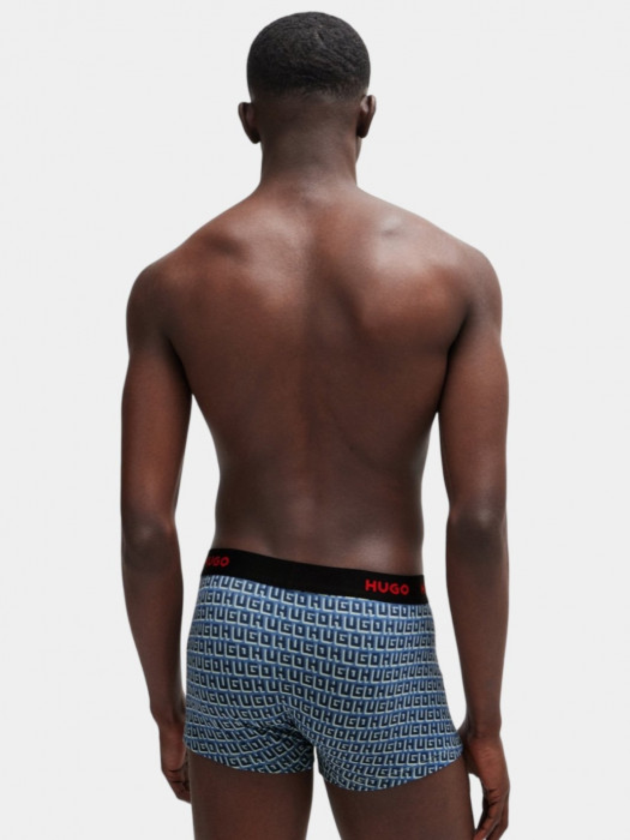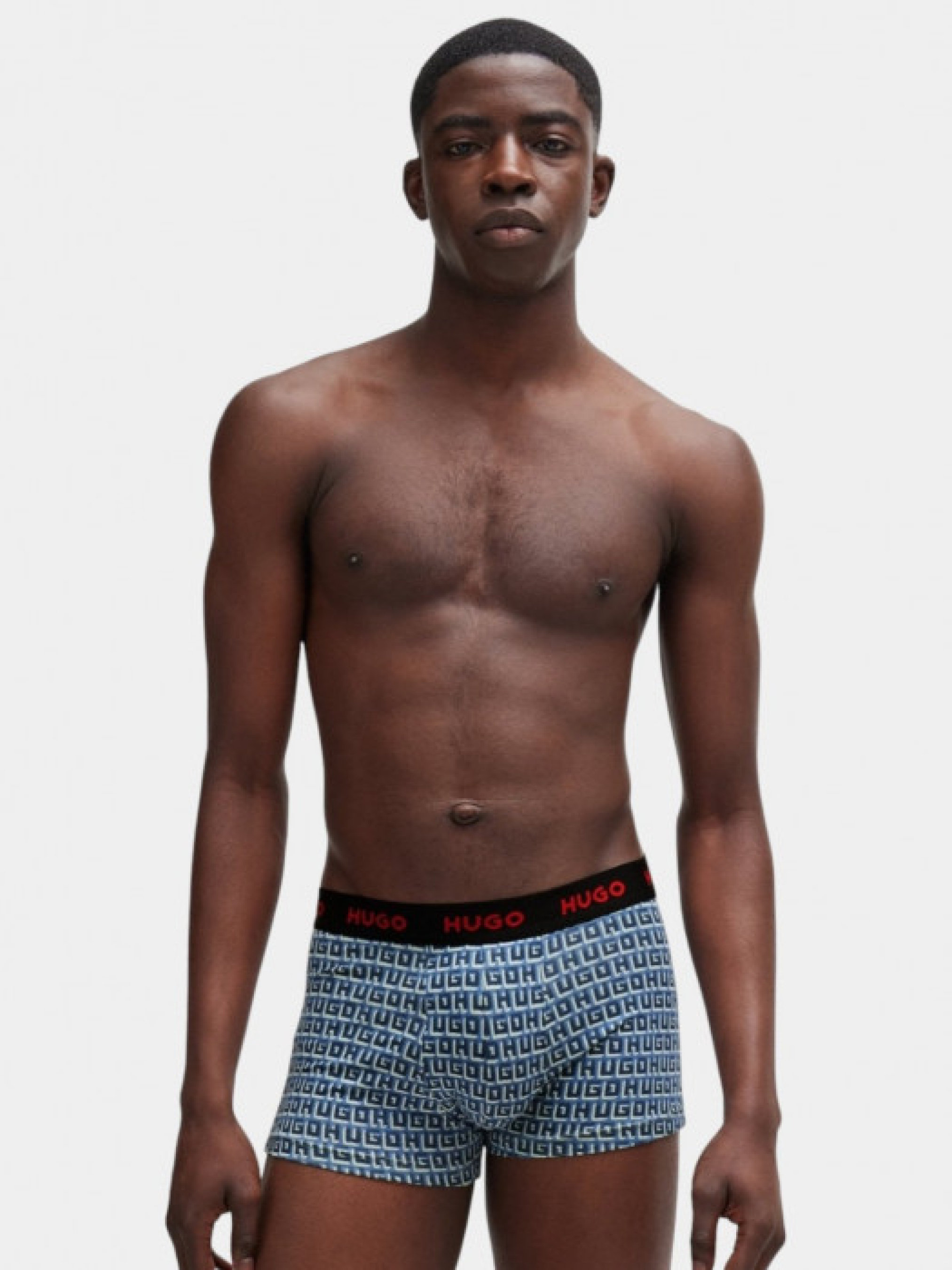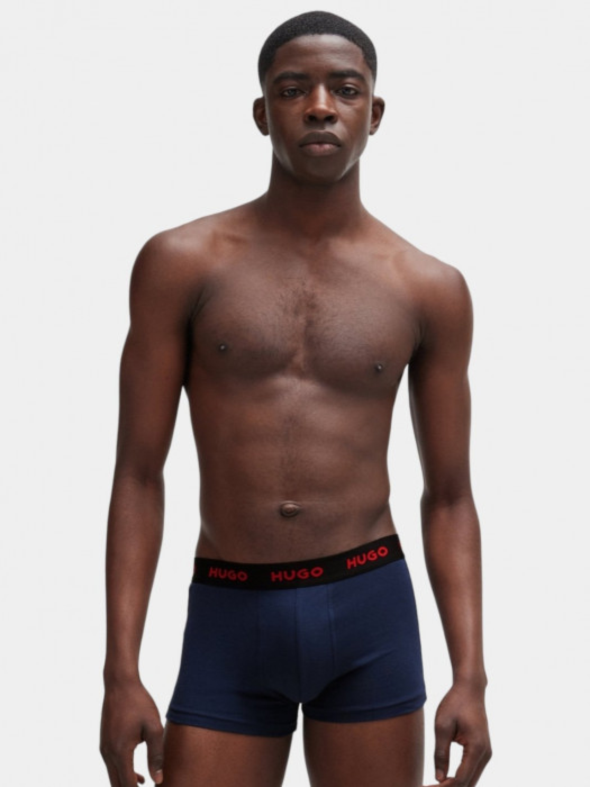 Три пары боксерок HUGO (модель TRUNK TRIPLET DESIGN) из элатичного хлопка на средней посадке. Повторяющиеся красные логотипы на поясе для характерного стиля. Цвета представлены в наборе: синий, черный и сине-белый принт. Упаковка: брендовая коробка.