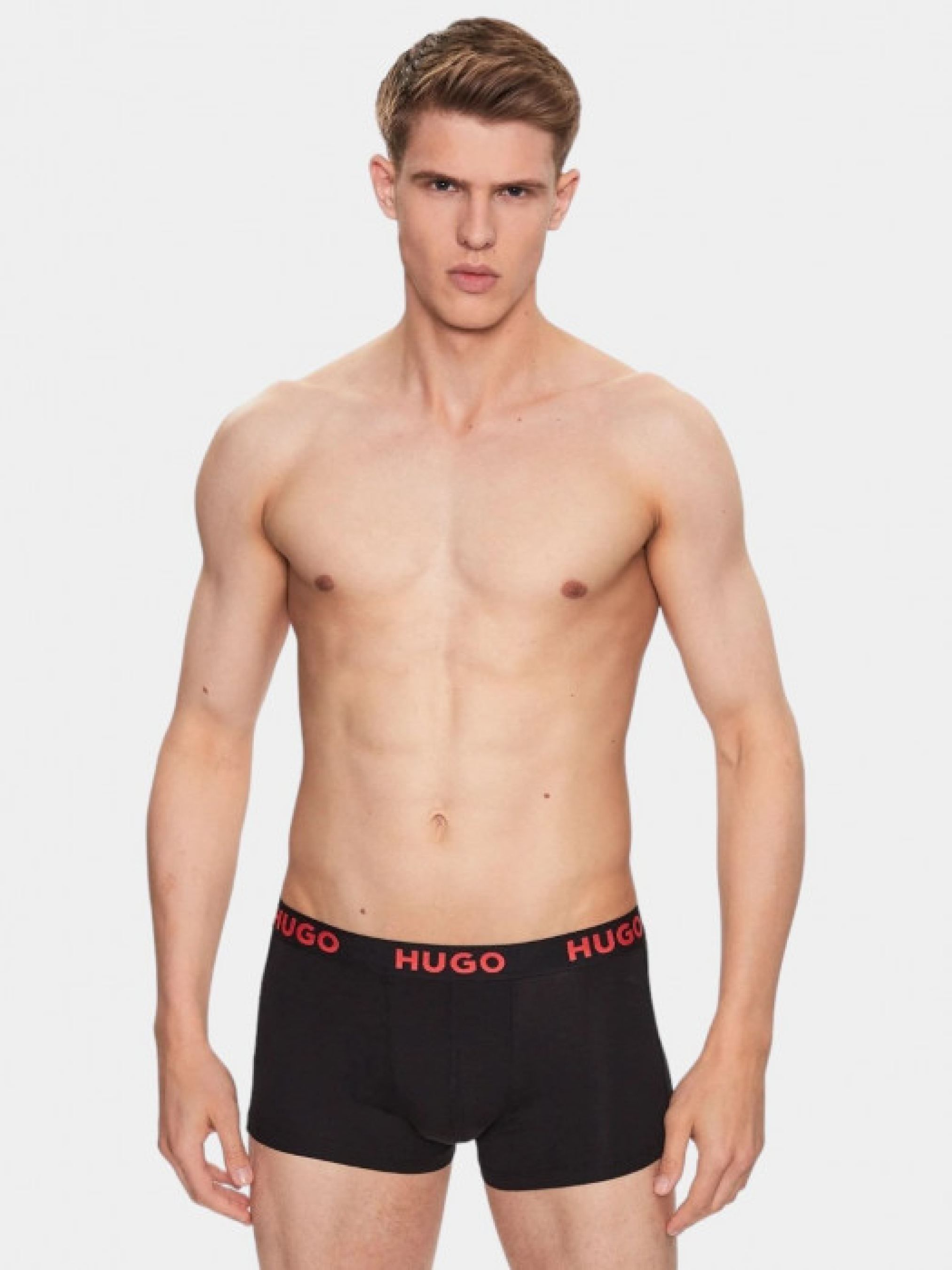 Три пары черных боксерок HUGO (модель TRUNK TRIPLET NEBULA) из элатичного хлопка на низкой посадке. Повторяющиеся красные логотипы на поясе для характерного стиля. Упаковка: брендовая коробка.