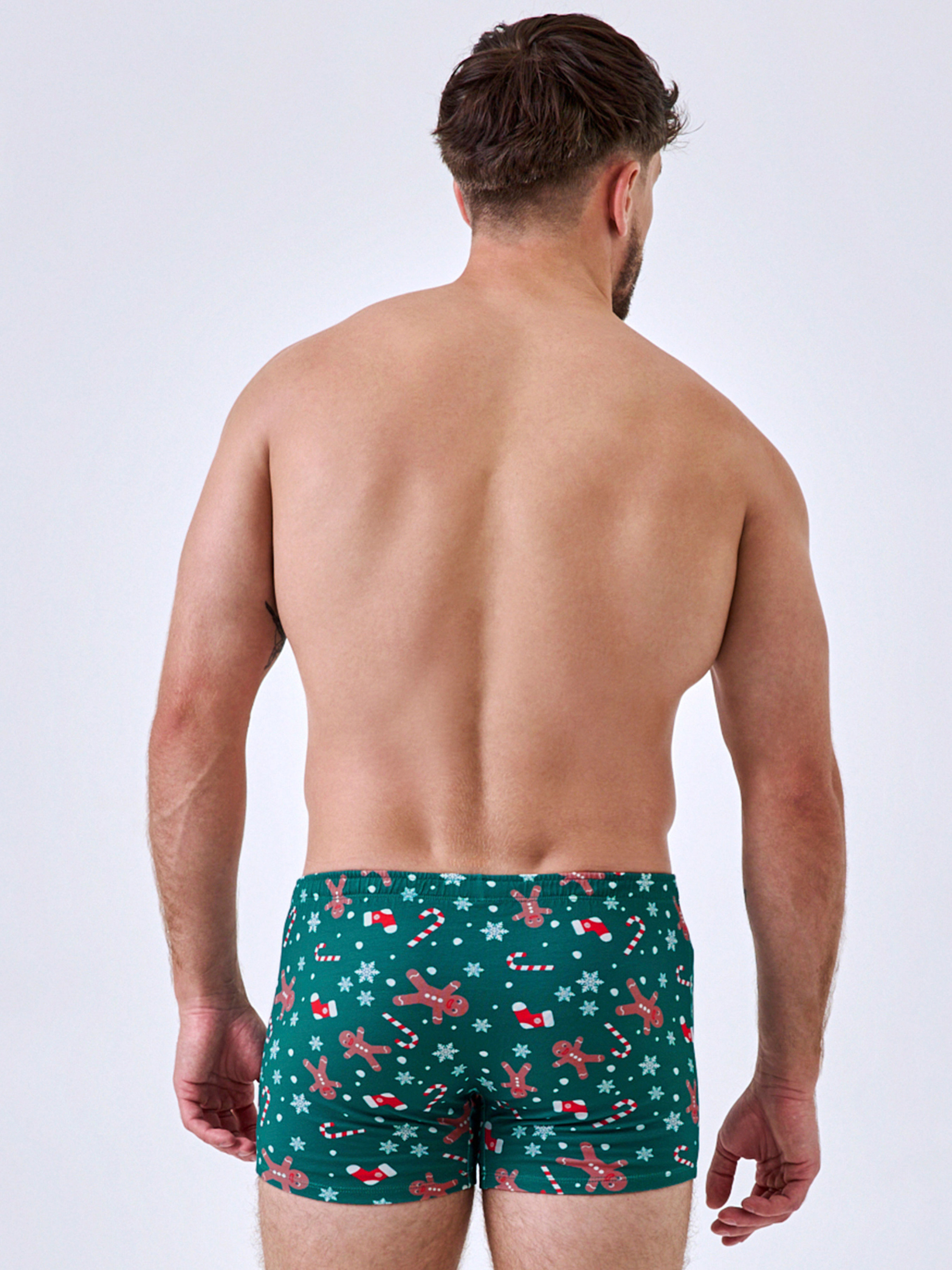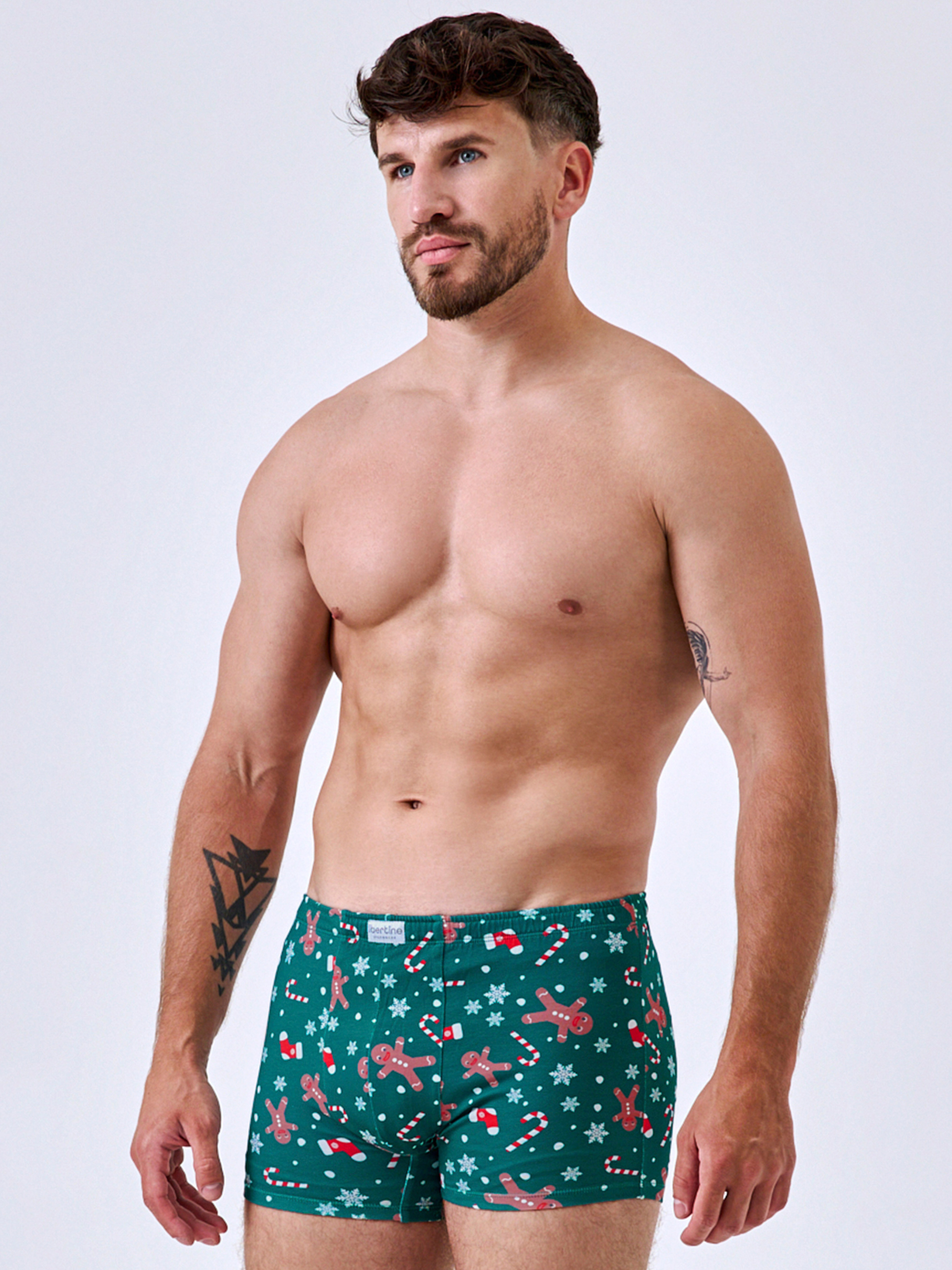 95% cotton, 5% elastane. Комфорт, що відчувається щодня. Ці чоловічі труси створені з м’якої бавовни, яка приємно лягає на шкіру, дихає та підтримує оптимальний баланс комфорту. Анатомічний крій забезпечує зручну посадку, а м’яка резинка на талії не тисне й не перекручується. Насичений зелений колір і святковий принт із пряниками, сніжинками та цукерками додають характеру – ідеальний вибір для зимового сезону або як оригінальний подарунок. Практичність, стиль і настрій – у кожній деталі. Ви можете замовити та купити чоловічі труси з бавовни, щоб відчути комфорт і впевненість у будь-який день.
