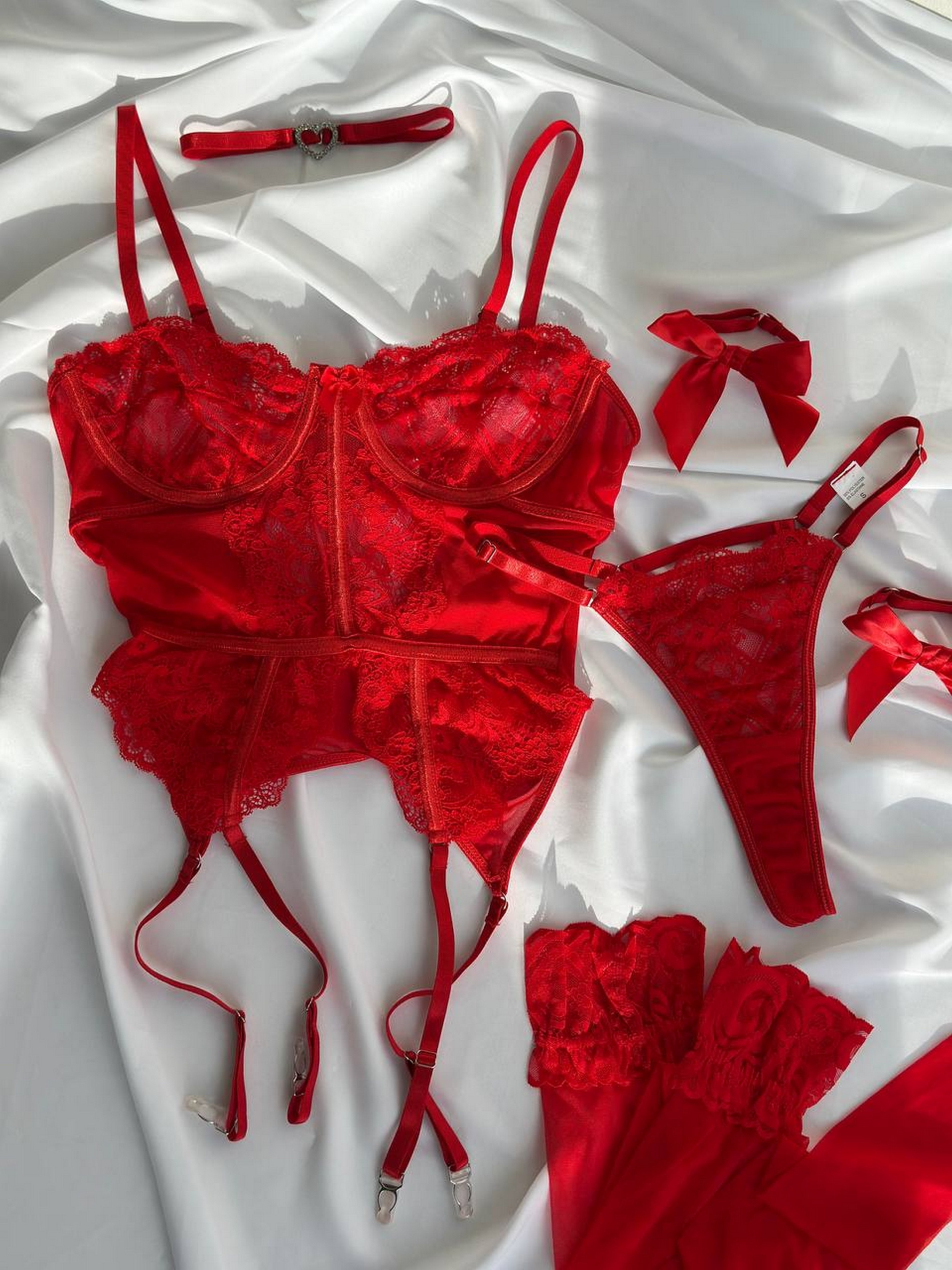 Комплект женского белья (бюстгальтер, трусики, чокер, браслеты, чулки) Nova Vega. Бюстье – изящное и соблазнительное, из сетки и кружевными вставками с акцентом на женственность. Бюст на косточках, сделает красивую форму груди. Трусики – элегантные кружевные трусики с регуляторами, сзади имеют соблазнительный дизайн. Аксессуары довершат ваш образ: чокер, браслеты, чулки входят в комплект. Материал – комбинация нежного кружева и мягкой сетки. Размерная сетка: S: грудь 85-94, бедра 86-94 М: грудь 90-94, бедра 94-98 L: грудь 94-98, бедра 98-105 Товар не подлежит возврату или обмену.