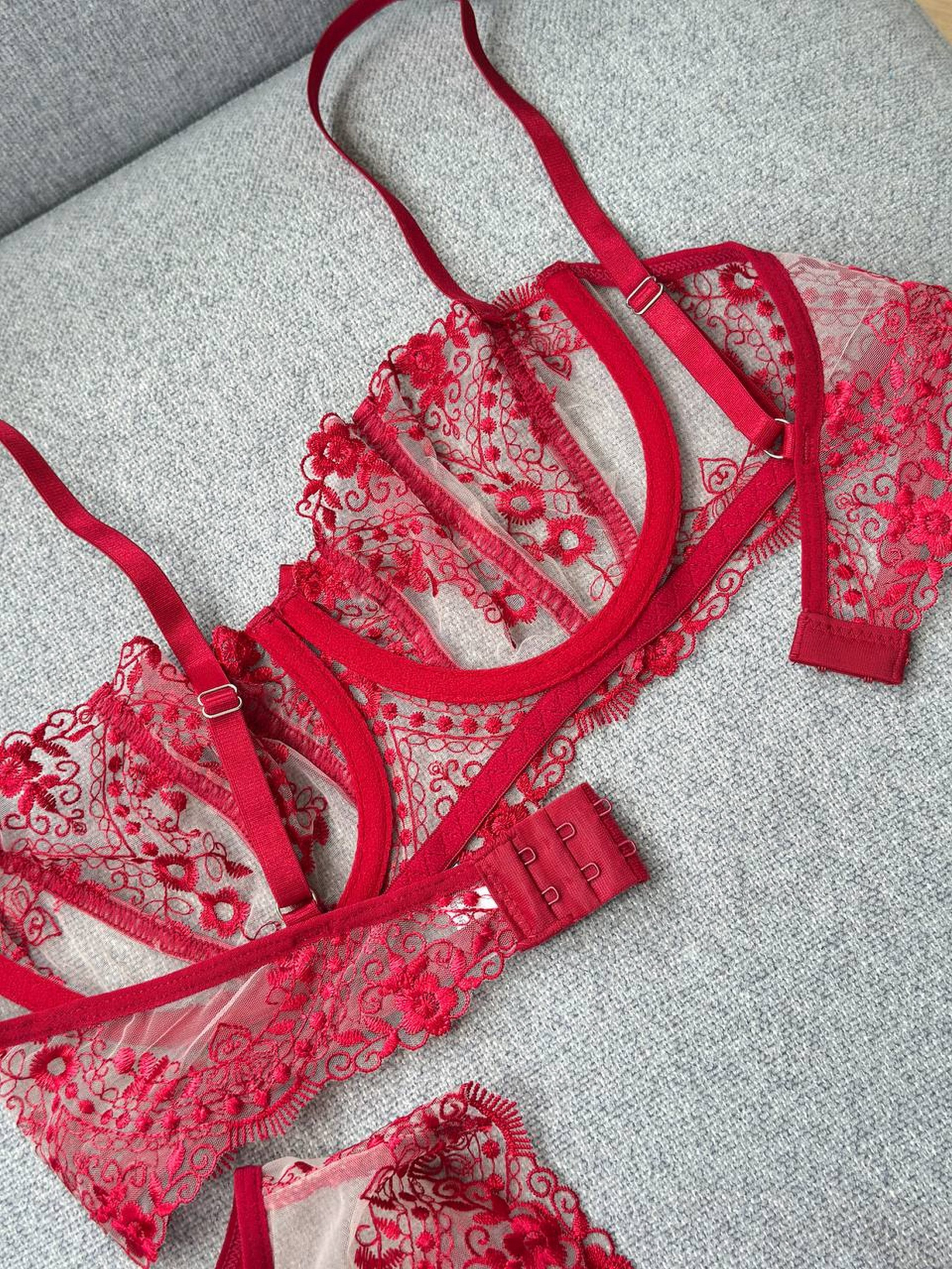 Комплект женского белья (бюстгальтер, трусики, пояс) Nova Vega. Почувствуйте себя королевой в этом роскошном комплекте белья. Изысканный красный кружевной дизайн, который никого не оставит безразличным. Каждая деталь создана, чтобы подчеркнуть вашу природную красоту и женственность. Бюстик кружевной, на косточках. Пояс для чулок придает нотку соблазнительности. Трусики с изящными деталями в форме стринга. Размерная сетка: S: грудь 85-91, бедра 84-94 М: грудь 90-95, бедра 92-99 L: грудь 94-99, бедра 98-106 Товар не подлежит возврату или обмену.