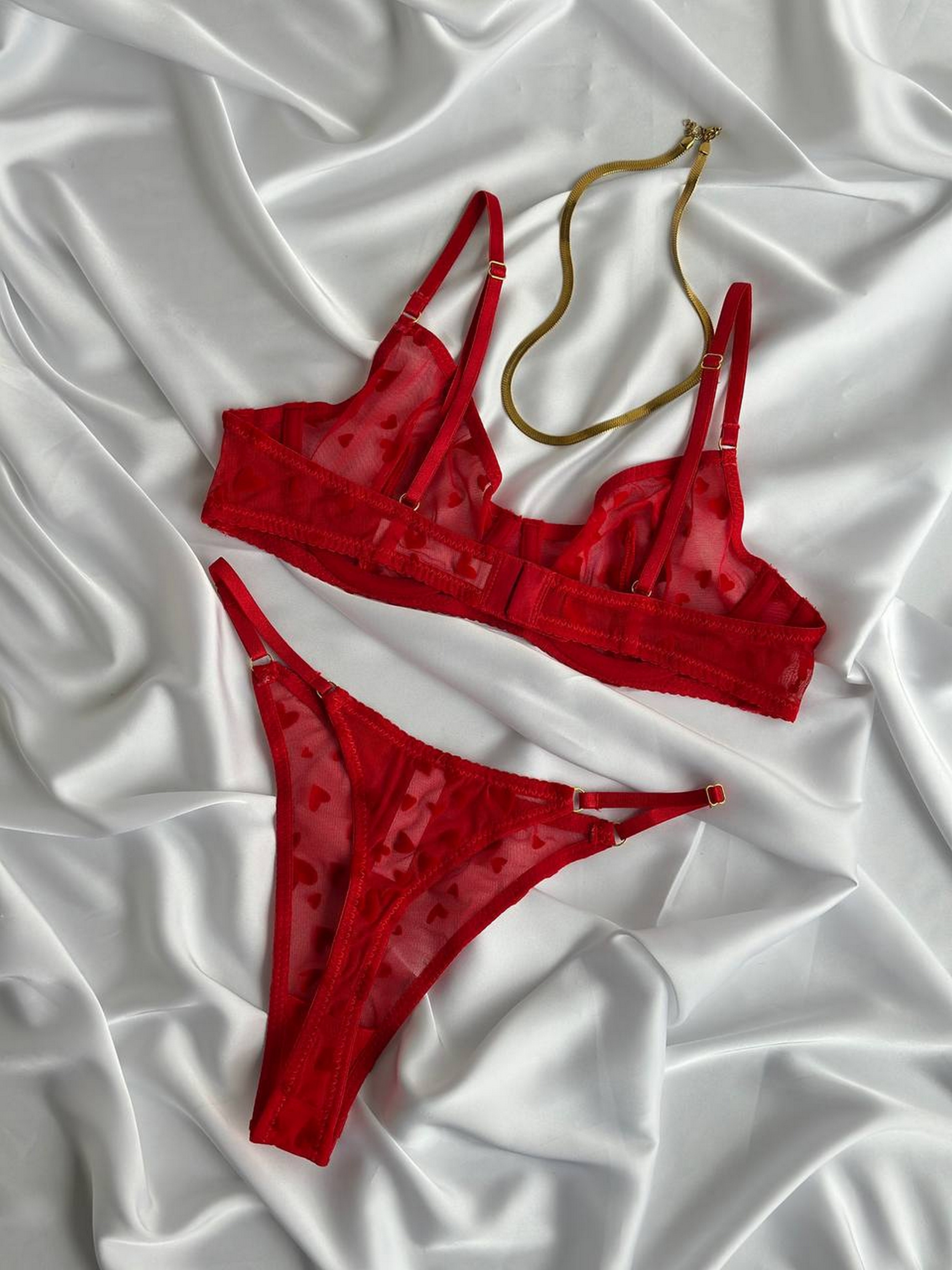 Комплект (бюстгальтер, трусики) Красный цвет – символ страсти, подчеркивающий женственность и придающий уверенности. Бюстик на косточках, трусики с регуляторами. Ткань итальянская микросетка. Таблица размеров: М: грудь 85-91, бедра 86-94 L: грудь 90-94, бедра 94-98 XL: грудь 95-98, бедра 98-104 Товар обмену и возврату не подлежит!