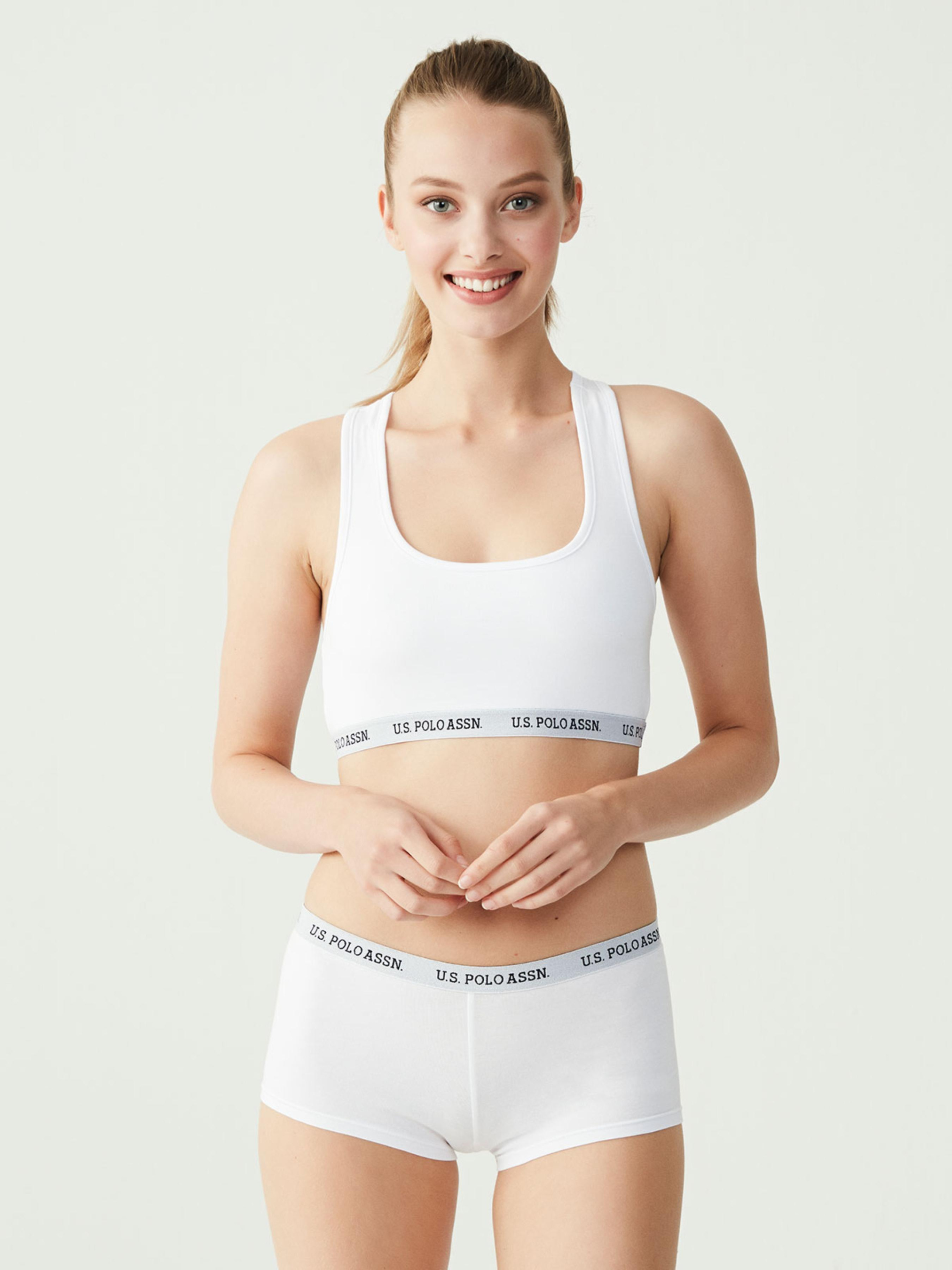 Жіночий комплект білизни ТМ US.POLO.ASSN. Складається з двох частин. Топ без вставок і кісточок на тонких подвійних бретелях. Під грудьми еластична брендована гумка, що забезпечує підтримку і фіксацію грудей. Трусики-шорти середньої посадки також доповнено брендованою резинкою. Виготовлено з високоякісних матеріалів, що забезпечує комфорт під час повсякденного носіння.Комплект білизни (топ, трусики) Відповідність розмірів: 34-XS, 36-S, 38-M, 40-L, 42-XL