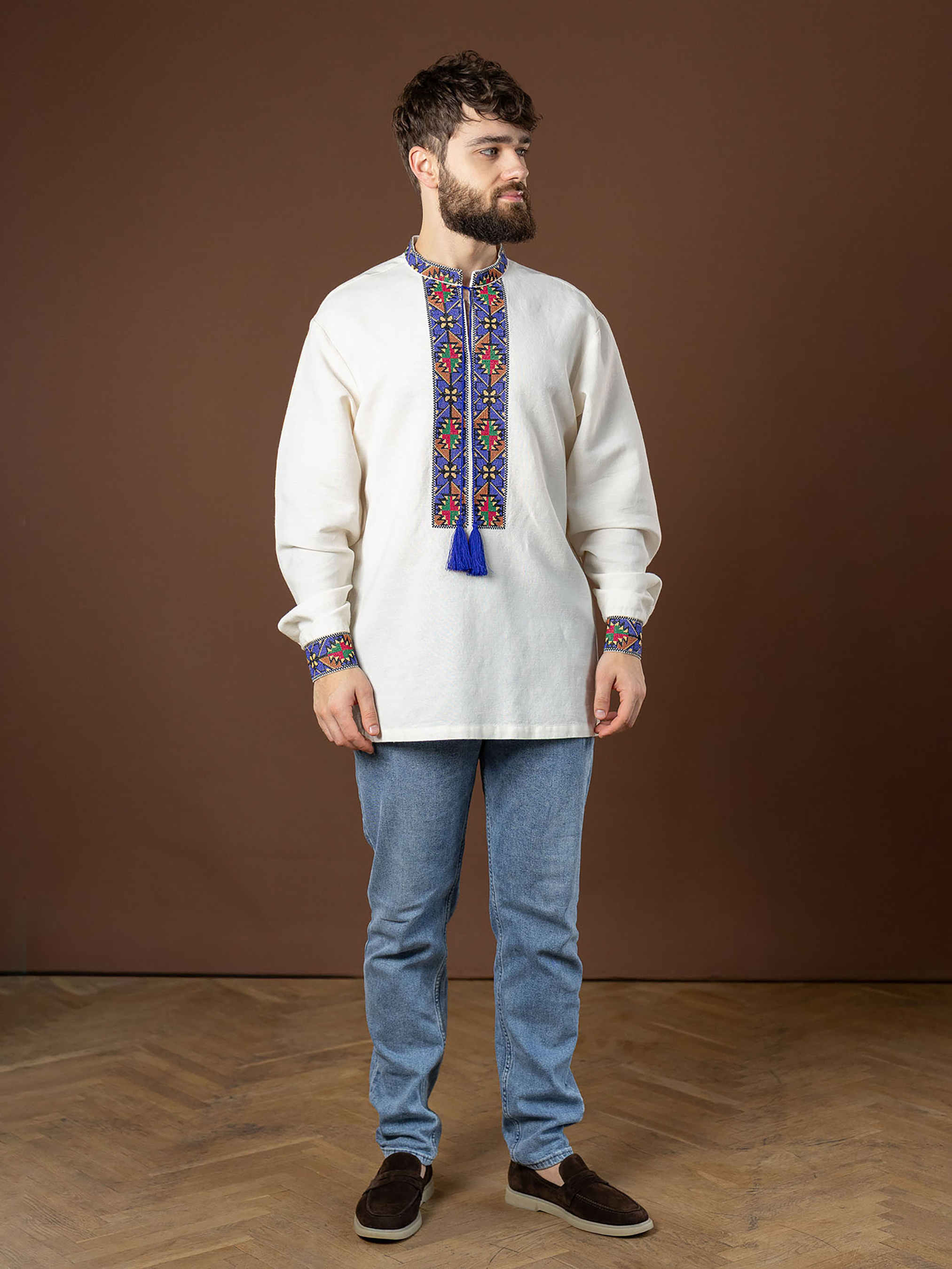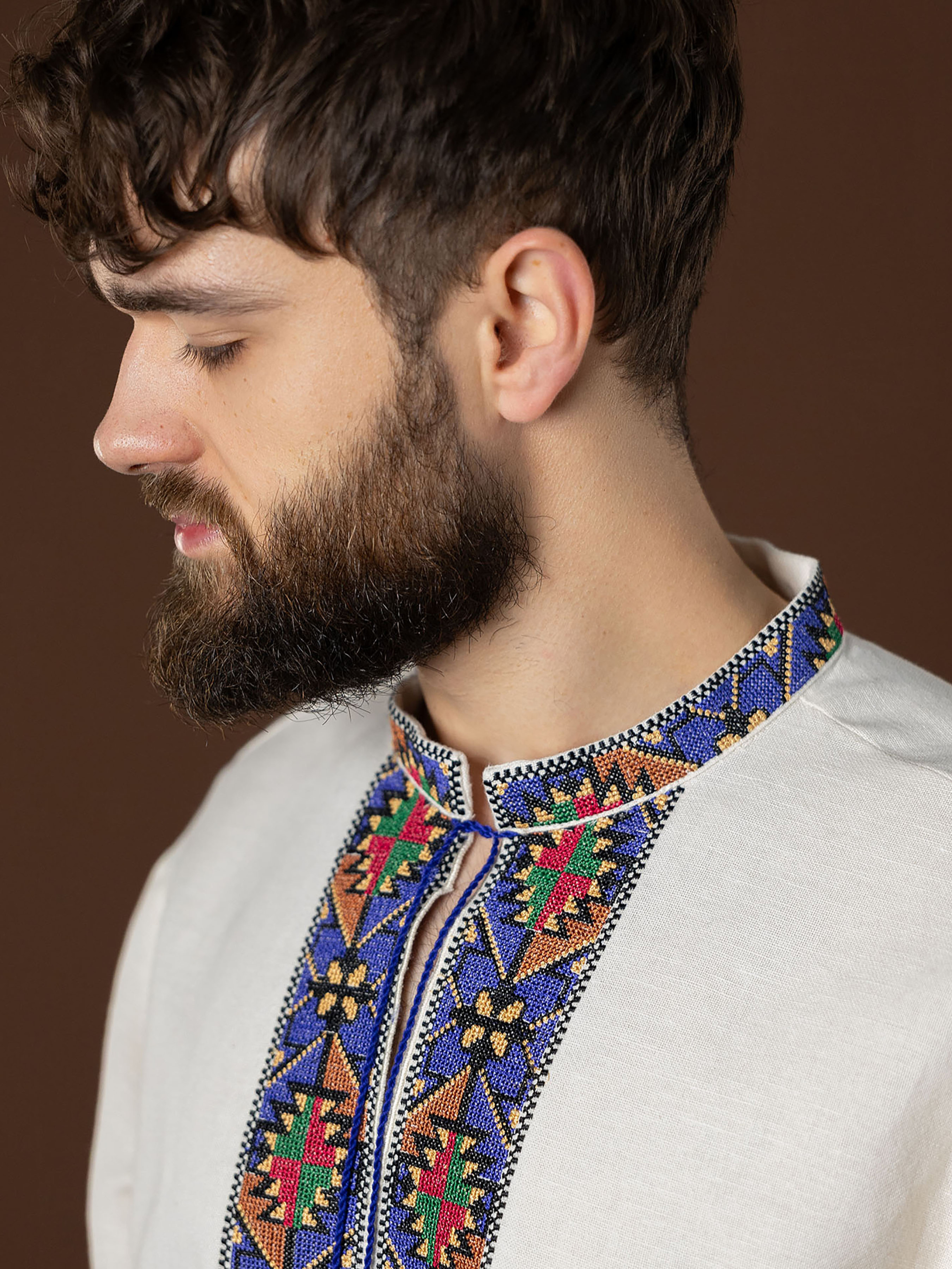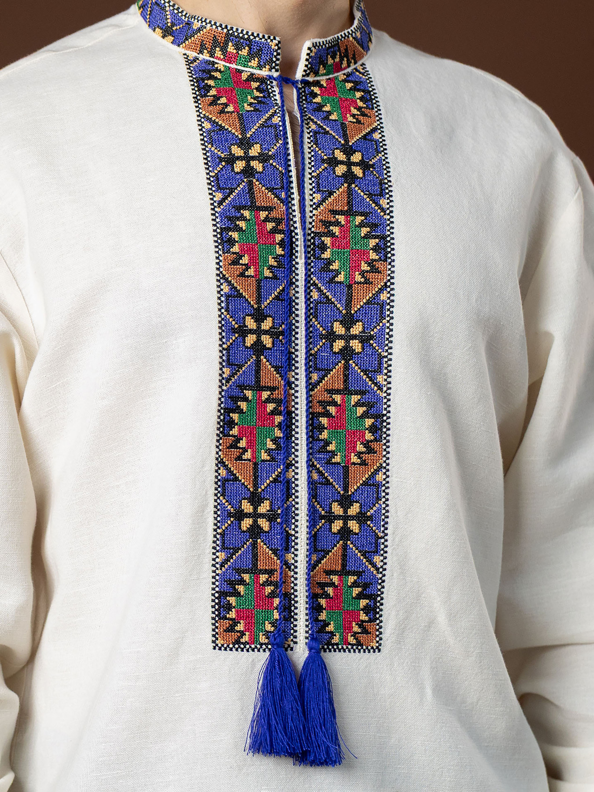 Ця вишиванка — вдале поєднання традиційності та сучасного комфорту. Виготовлена з натуральної тканини, вона приємна до тіла, добре пропускає повітря й зберігає форму після прання. Орнаментальний візерунок демонструє гармонійність теплих та холодних кольорових відтінків, а також вдале поєднання геометричних елементів: ромбів – символу продовження роду, достатку; об’єднаних трикутників – символів чоловічого і жіночого начал, що несе в собі потужне оберегове значення. Фасон сорочки вільний і зручний, з коміром-стійкою та акуратною застібкою. Манжети також прикрашені орнаментом, тому образ виглядає гармонійно. Вишивка виконана у традиційних геометричних мотивах, поєднуючи насичені сині, червоні й зелені відтінки, які надають сорочці виразності. Ця вишиванка ідеально підійде як для святкових подій, так і для повсякденного стилю. Вона вдало доповнить гардероб і стане універсальною річчю на будь-який сезон.