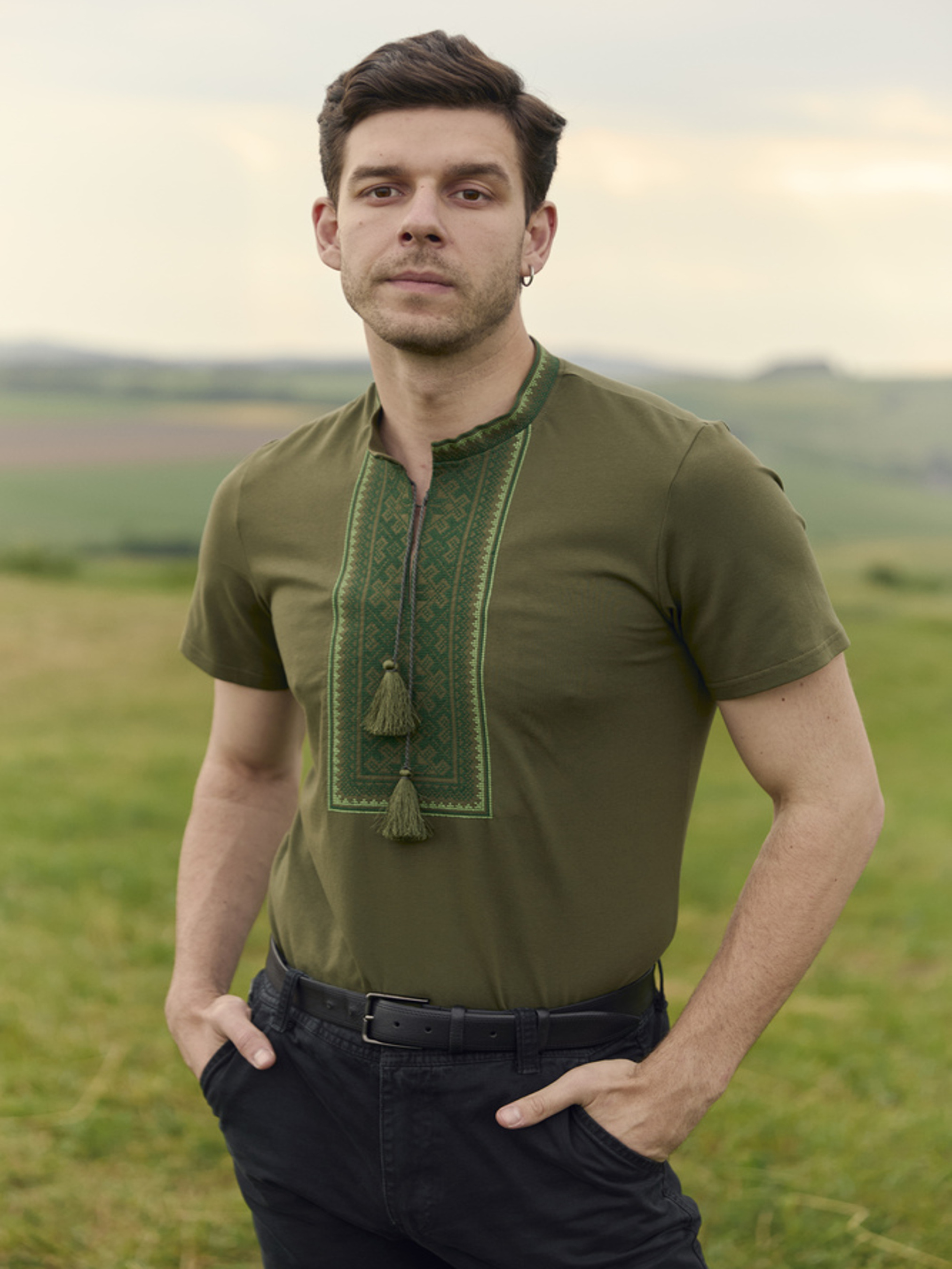 Характеристики: Довжина рукава: Короткий рукав Колір тканини: хакі Матеріал: Стрейч кулір Склад тканини: 95% бавовна, 5% еластан Догляд: ручне прання машинне прання “делікатне” при температурі до 40 °C прасування виробу з відпарювання при середній температурі 150 °C хімічна чистка заборонена відбілювання заборонено Особливості та характеристики: високоякісна тканина зі 100% натуральною бавовною та невеликою домішкою еластану забезпечує еластичність, комфорт і приємні тактильні відчуття; матеріал добре пропускає повітря, гігроскопічний, не подразнює шкіру та довго зберігає форму; короткі рукави та кругла горловина забезпечують свободу рухів і стильний повсякденний вигляд; вишивка в традиційному українському стилі по передній частині додає виробу оригінальності та етнічного шарму; футболка має прямий крій, що робить її універсальною для поєднання з джинсами, шортами чи спортивними штанами; застібки відсутні — легкий надяг і комфорт протягом усього дня; модель підкреслює мужність та сучасний стиль, при цьому зберігаючи традиційні українські мотиви. Чоловіча футболка-вишиванка з орнаментом стане ідеальним вибором для повсякденного носіння, святкових подій або неформальних зустрічей, поєднуючи сучасний крій і етнічну естетику.