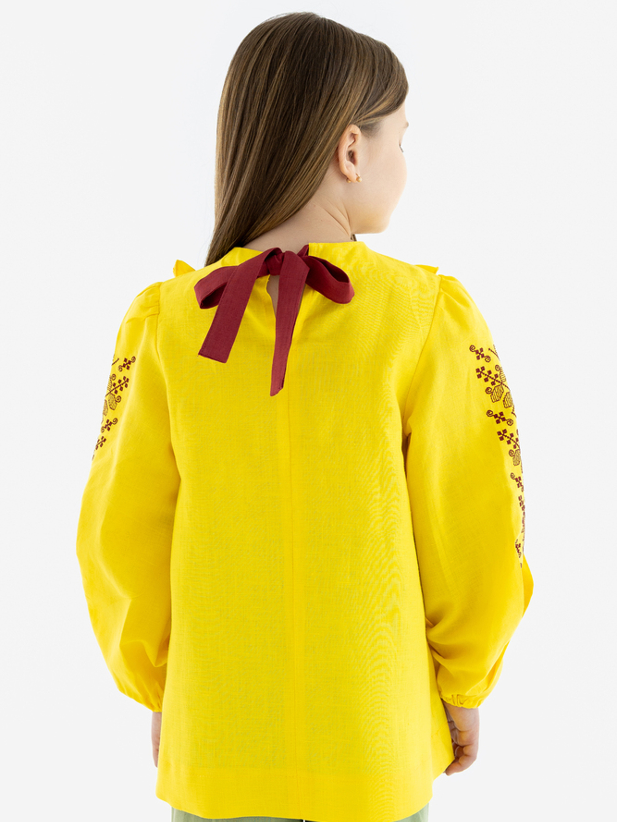 Характеристики: Довжина рукава: довгий Колір тканини: жовтий Матеріал: напівльон Склад тканини: 50% льон, 50% бавовна Догляд: ручне прання машинне прання "делікатне" при температурі 20 °C прасування виробу з відпарюванням при середній температурі 150 °C хімічна чистка заборонена відбілювання заборонено Переваги та особливості: натуральний склад тканини – 50% льону і 50% бавовни, гіпоалергенний, зносостійкий, добре пропускає повітря, вбирає вологу; яскравий жовтий колір додає святковості, позитиву та енергії кожному дню; традиційна вишивка на передній планці та рукавах із рослинними елементами підкреслює українські мотиви; рюші та бант позаду додають ніжності й вишуканості, регулюють об’єм горловини; універсальна модель – підходить для свят, родинних урочистостей і щоденного носіння. Стильна жовта вишиванка гармонійно поєднала культуру та сучасність, стаючи справжнім оберегом для дівчинки. Вона не лише приваблива зовні, а й комфортна завдяки поєднанню льону та бавовни: льон додає міцності та природної прохолоди, а бавовна робить тканину м’якою та приємною для дитячої шкіри. Яскравий жовтий колір символізує тепло, сонце та життєрадісність, даруючи гарний настрій щодня. Рослинна символіка в орнаменті вишивки уособлює красу, процвітання, любов та нерозривний зв’язок людини з природою.