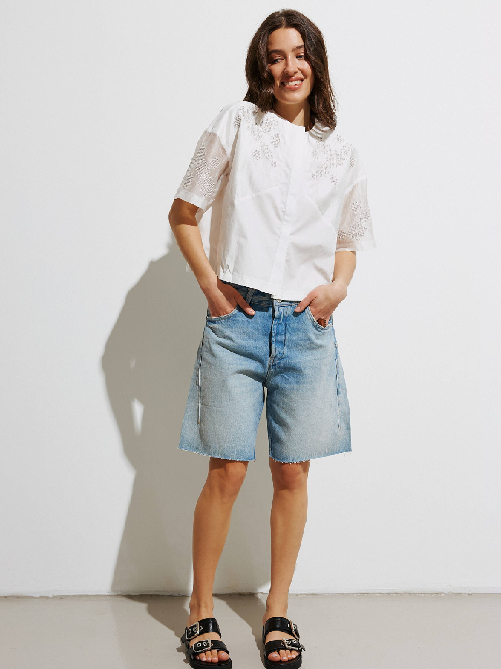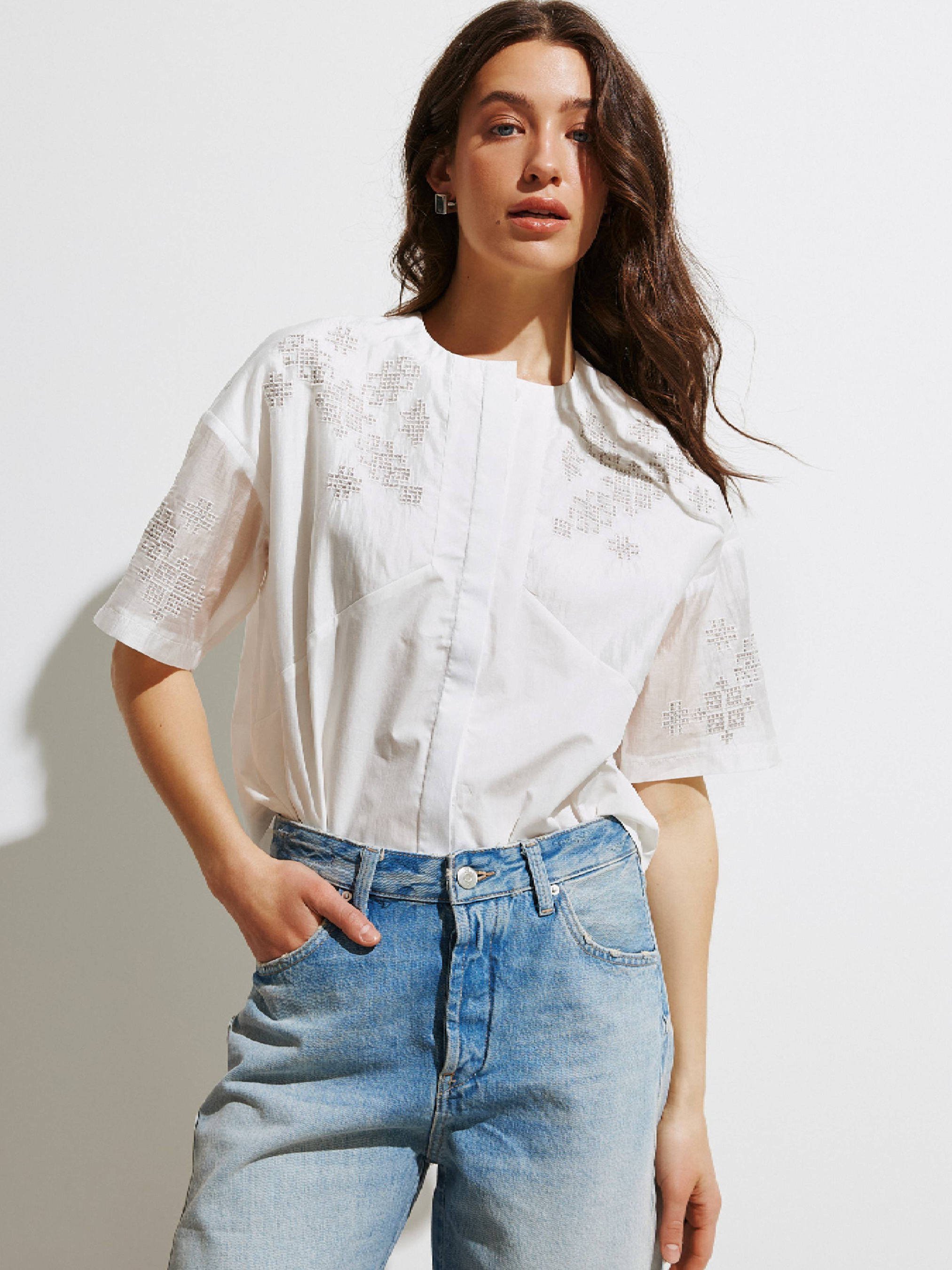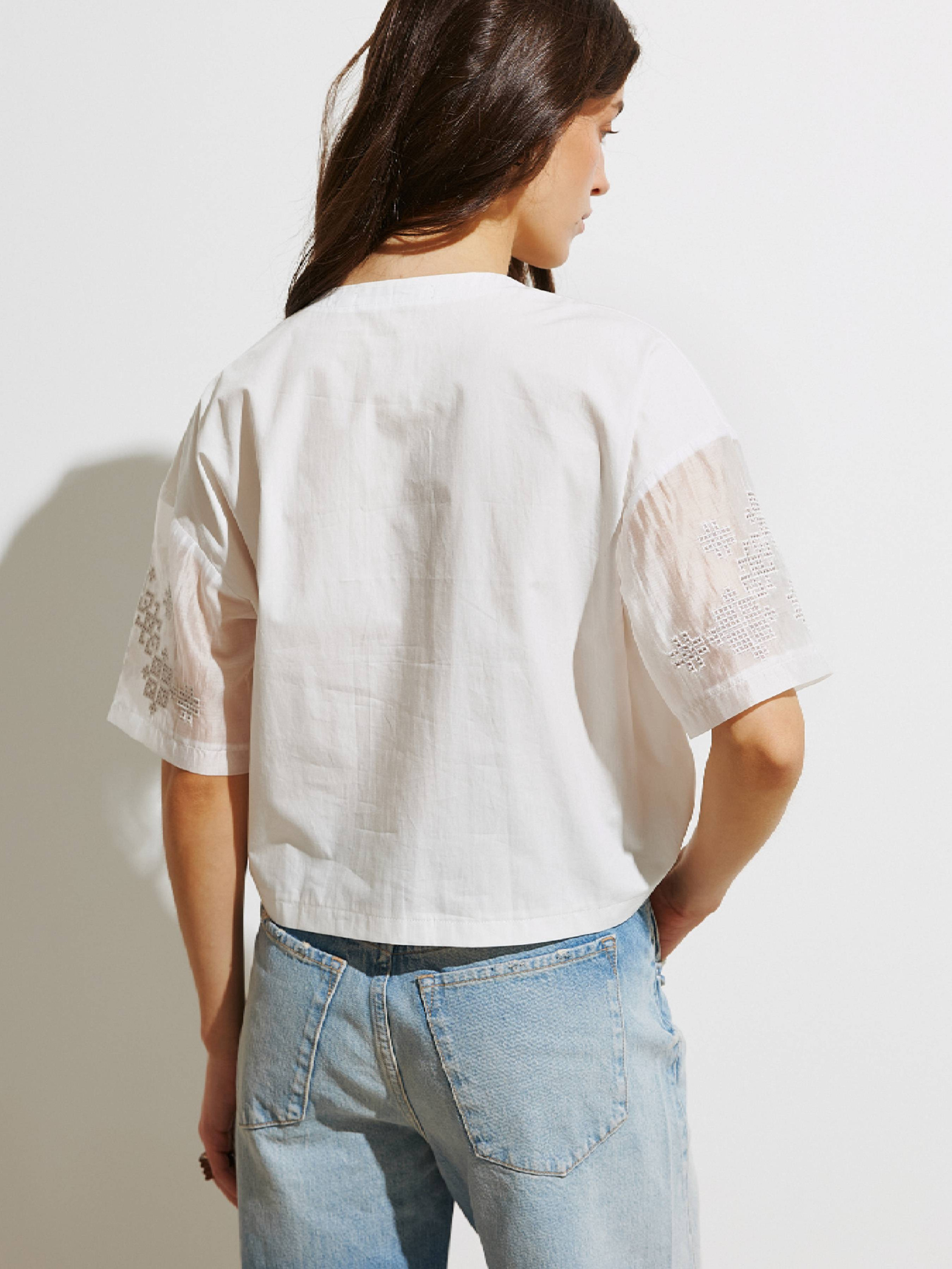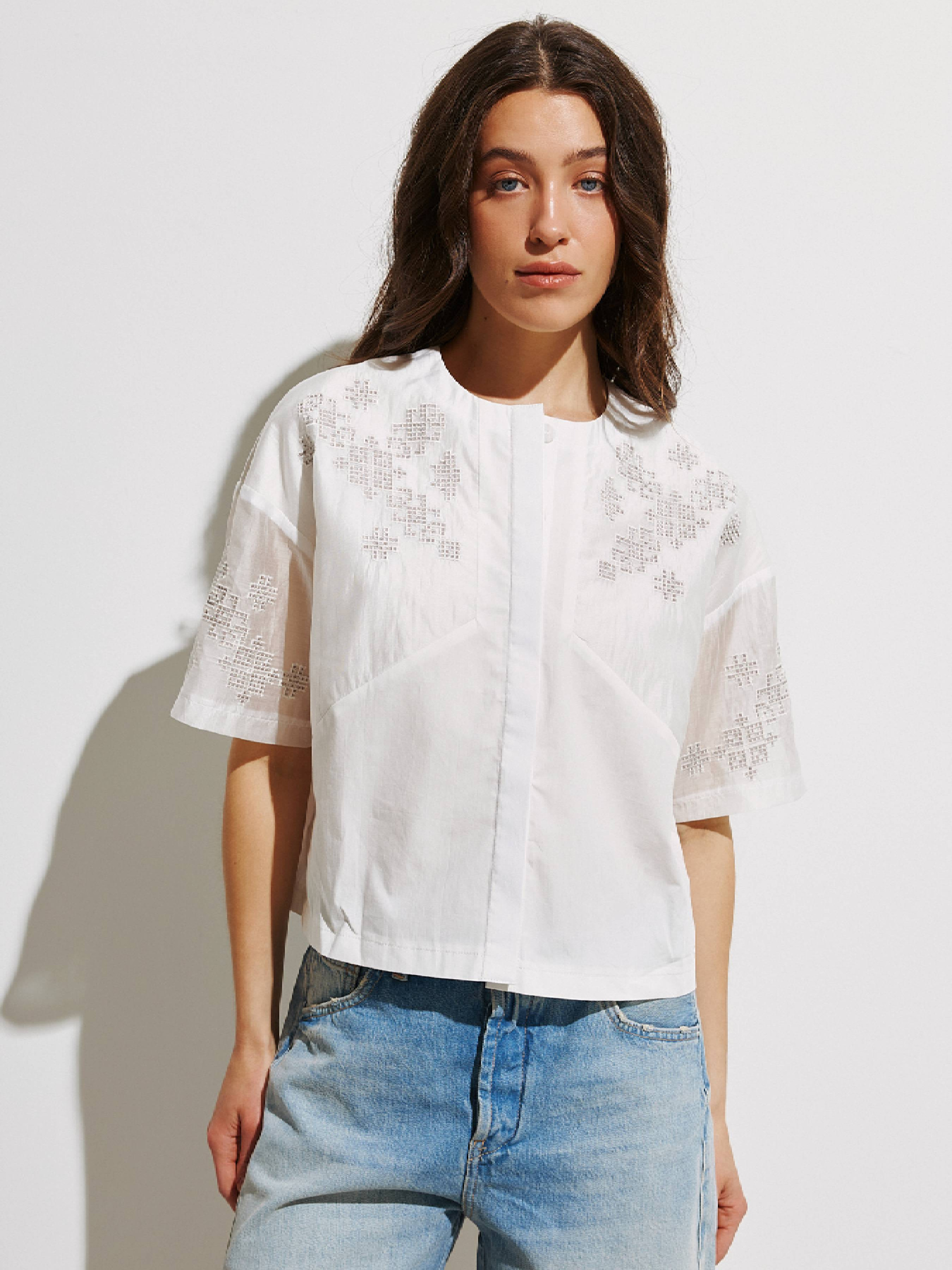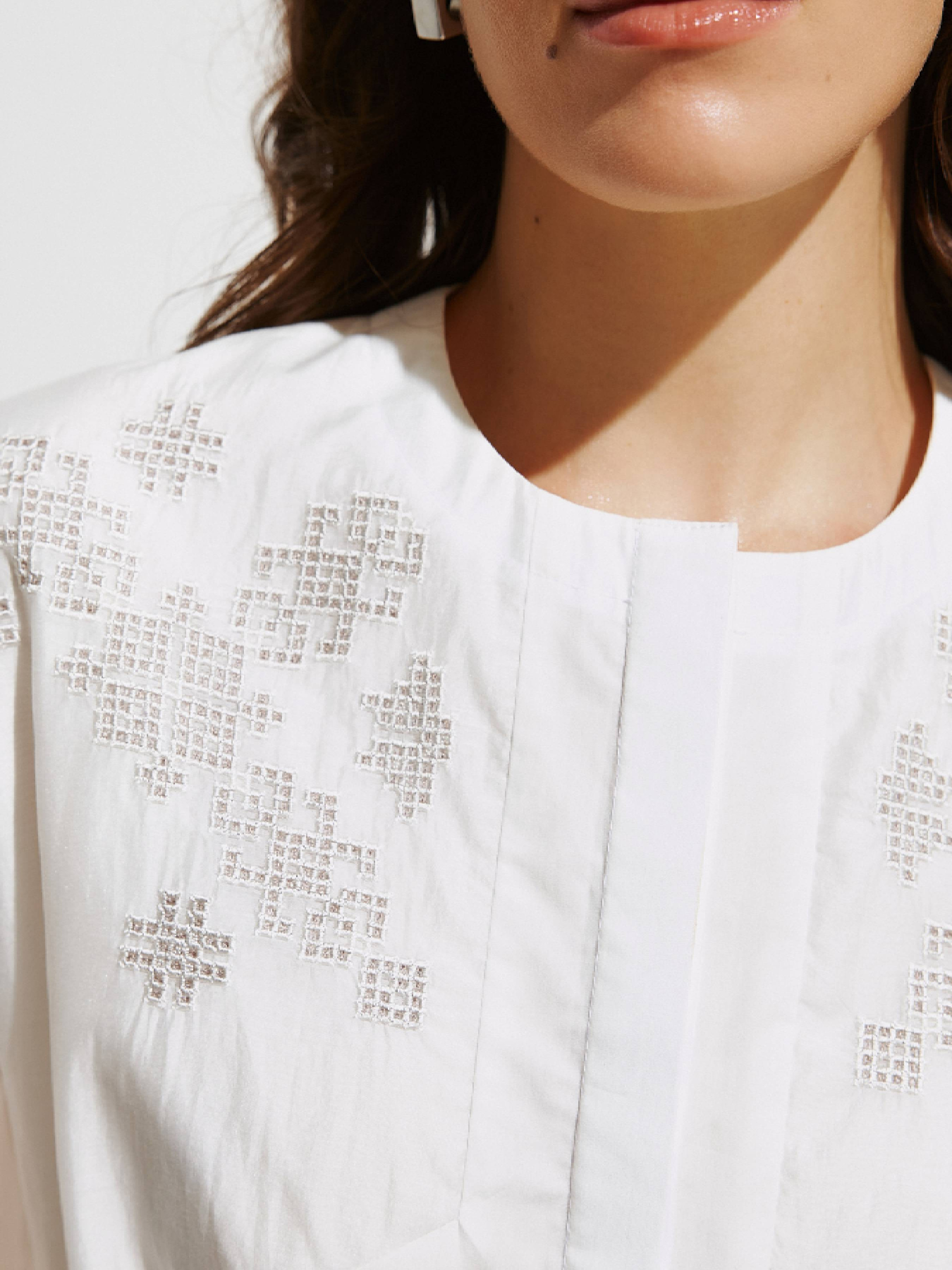 Укроп-рубашка с прозрачными рукавами. Модель широкого кроя с низким плечом. Фиксируется на ряд пуговиц, скрытых под планкой. Стилизованная геометрическая вышивка в технике "Гладь" на тонкой основе тенселя из эвкалиптового волокна. Выполнена из натуральной хлопковой ткани. Замеры изделия в груди: S – 106 см, M – 110 см, L – 114 см, XL – 118 см. Замеры по низу изделия: S – 102 см, M – 106 см, L – 110 см, XL – 114 см. Параметры модели: рост 168 см, 81-64-93 см. Размер на модели S.