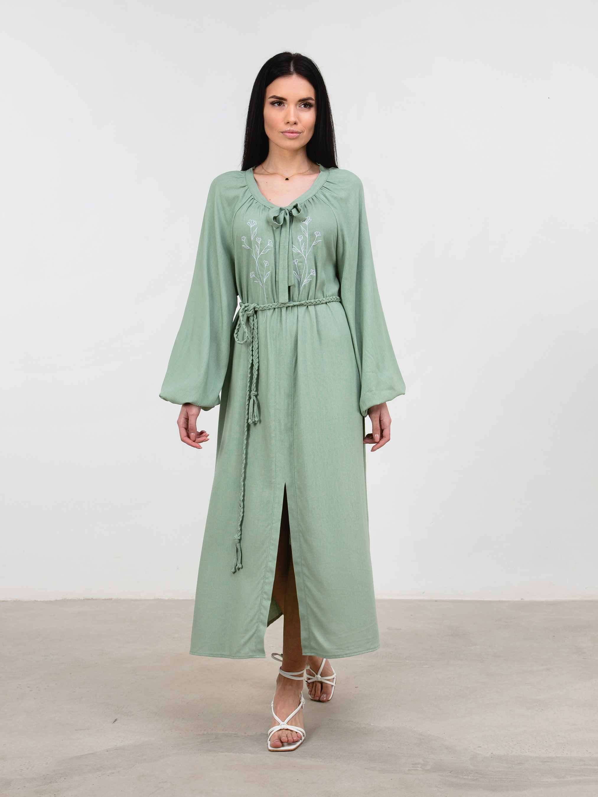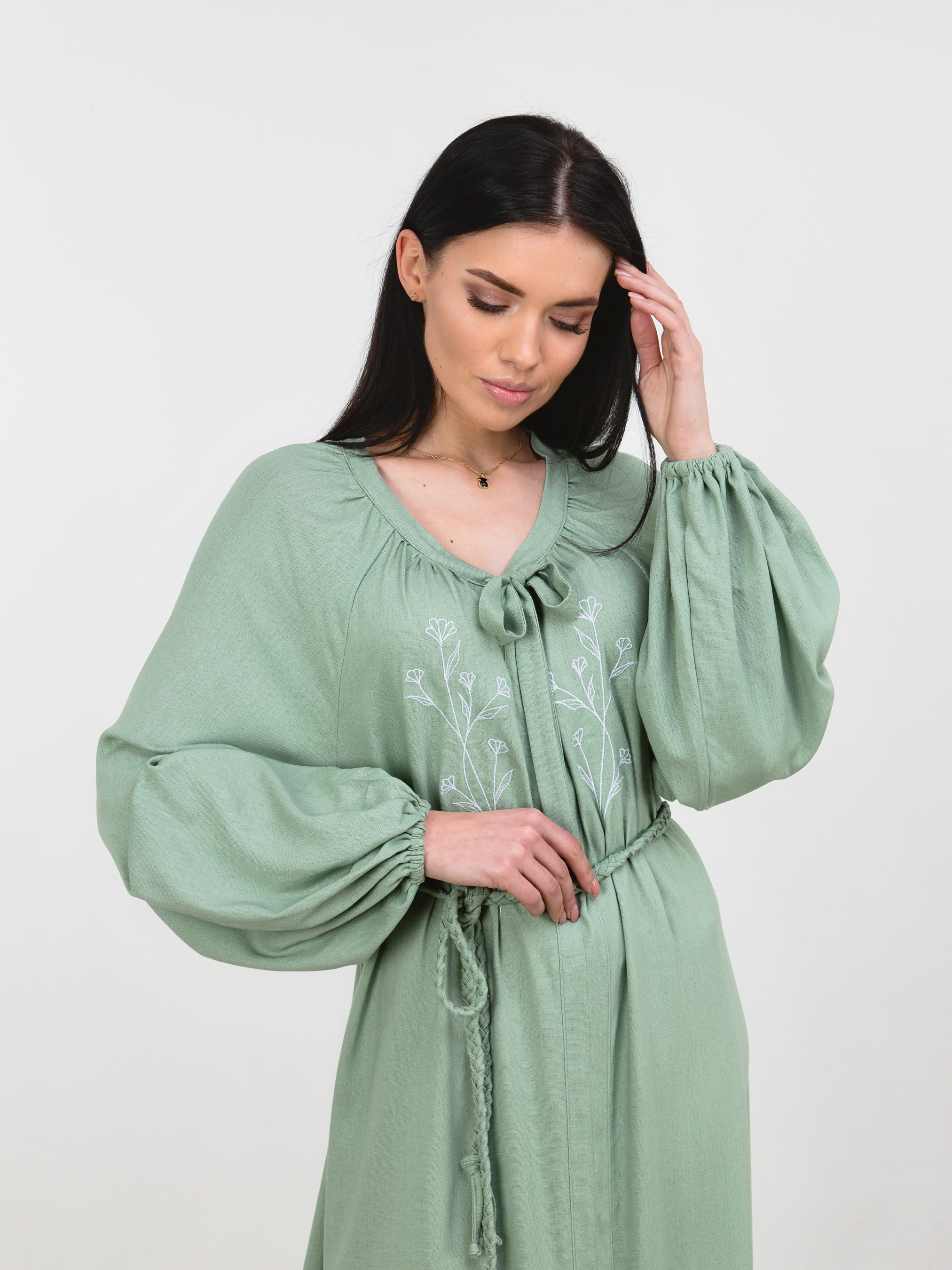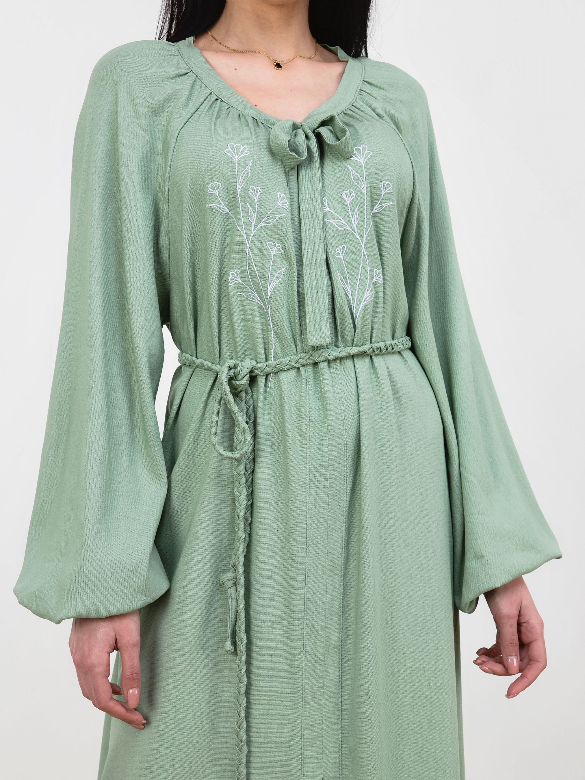 Свободное платье со льна. На груди машинная вышивка силуэт цветов. В комплекте поясок, чтобы подчеркнуть талию. Спереди застёгивается на пару пуговок. Свободные рукава, на манжете резинка. XS-S Длина по спине : 122 см Длина рукава : 71 см Полуобхват груди: 55 см Полуобхват бедер : 65 см Полуобхват талии: 59 см S-M Длина по спине: 123 см Длина рукава : 72 см Полуобхват груди: 58 см Полуобхват бедер : 68 см Полуобхват талии : 62 см M-L Длина по спине: 123 см Длина рукава : 73 см Полуобхват груди: 60 см Полуобхват бедер : 70 см Полуобхват талии: 65 см