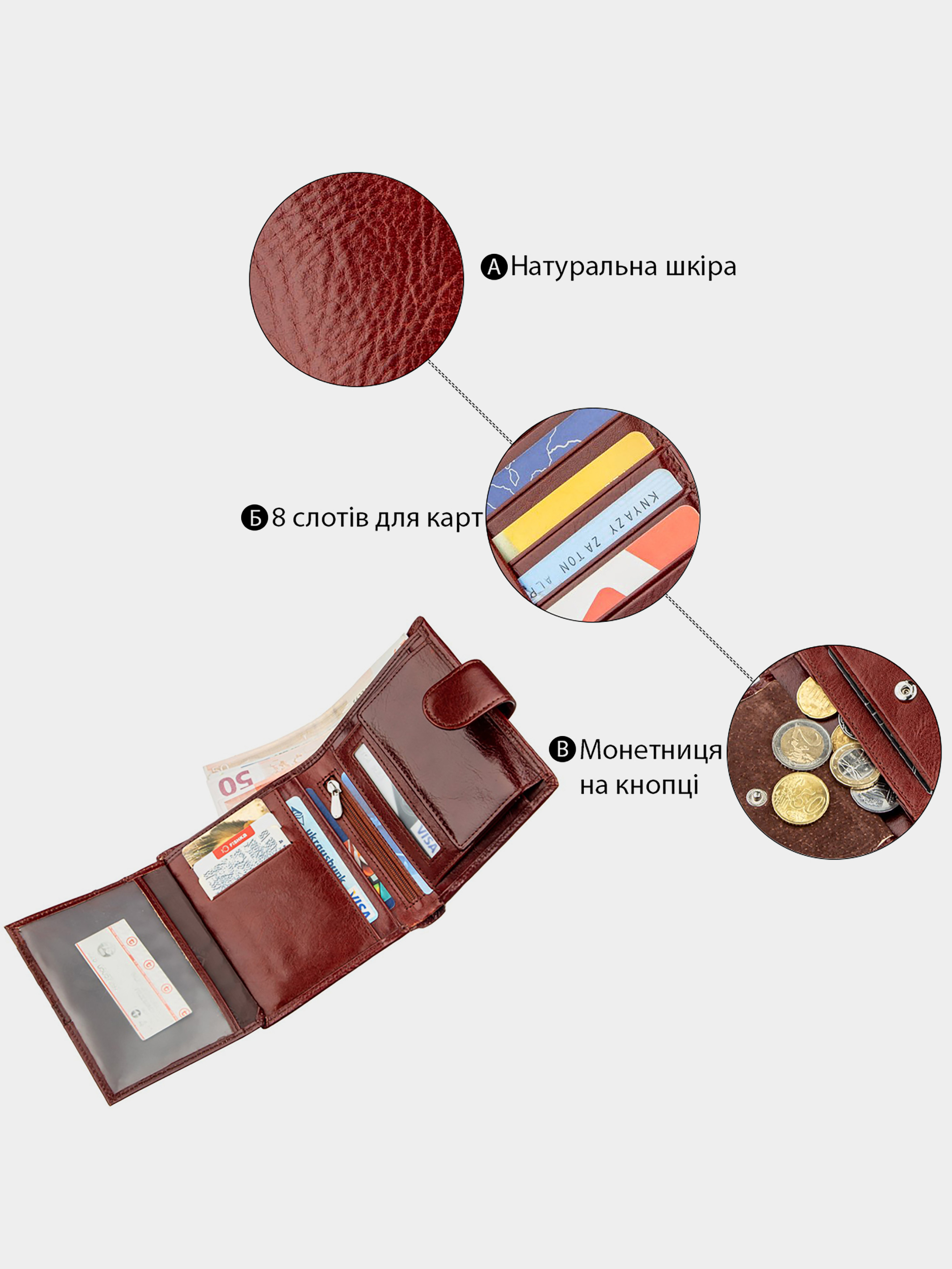 Материал: натуральная кожа; Размеры (ШхВ, см): 11х12; Цвет: коричневый; Страна производитель: Китай; Страна происхождения ТМ: Украина. Описание: - мужской бумажник из натуральной кожи на кнопке; - внутри расположено два больших отделения для купюр по всей длине; - одно большое отделение на молнии по всей длине; - два отделения для монет на кнопке; - два кармашка для сим-карт; - отделение на молнии для ценных вещей по центру; - прозрачное отделения для карт или фото; - 8 отделений для карточек; - три потайных отделения; Отличный кожаный бумажник для настоящих мужчин в выдержанном и не вызывающем дизайне. Имеет стильный коричневый цвет с притягательным красным оттенком. Выполнен из высококачественного материала, поэтому непременно прослужит Вам очень долгое время. Бумажник также может похвастаться особой практичностью и неоспоримым удобством в процессе своей эксплуатации. Множество различных отделений обязательно пригодяться Вам в повседневной рутинной жизни. Поэтому покупайте данный бумажник для себя или на подарок близкому человеку. Упаковано изделие в фирменную твердую картонную коробку белого цвета.