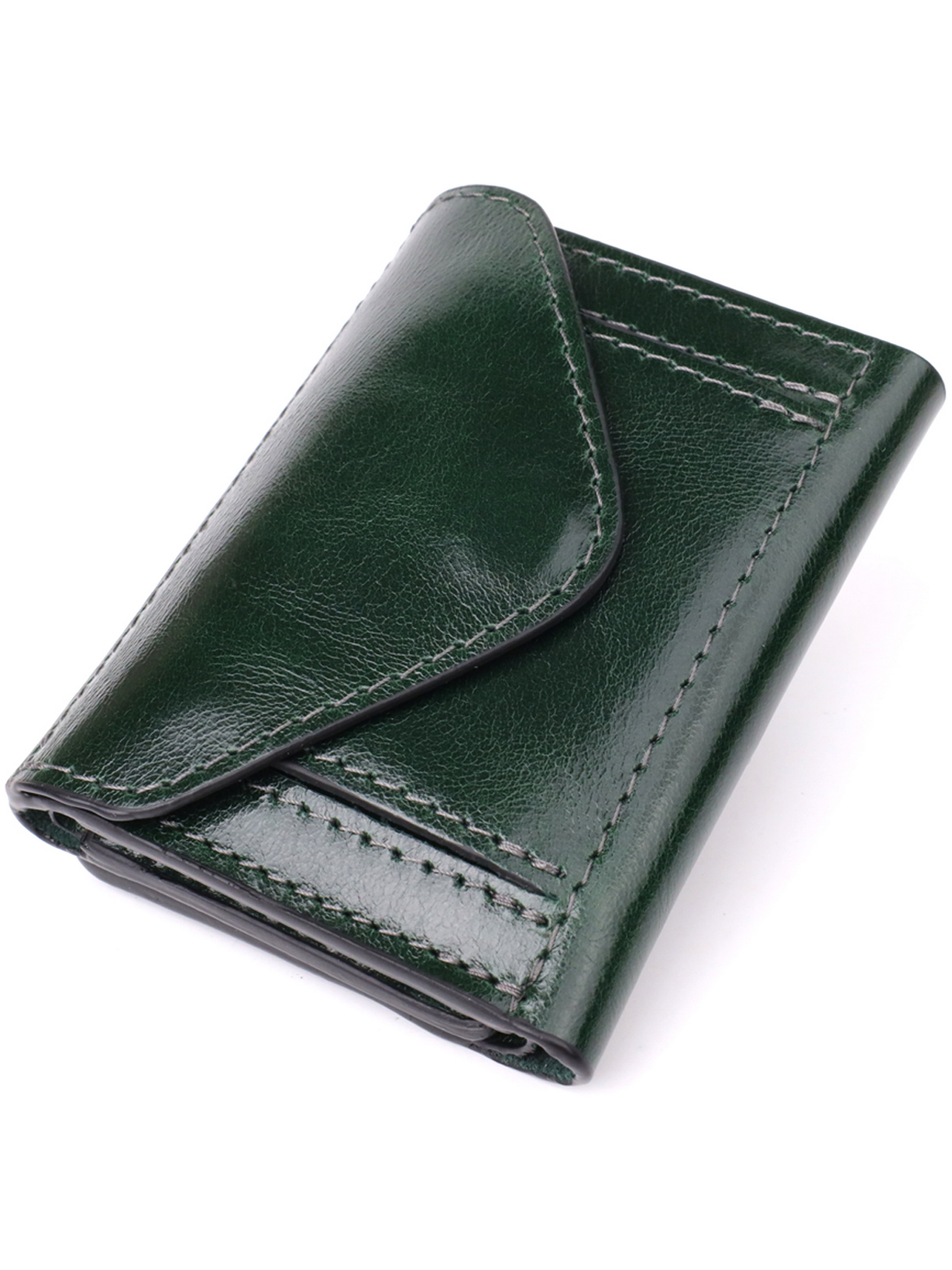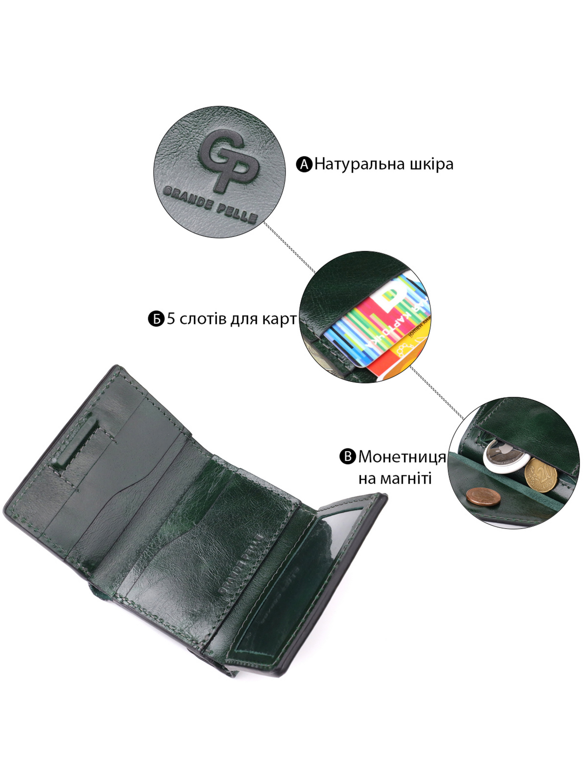 Материал: натуральная кожа. Цвет: зеленый. Размеры (ШхВхГ, см): 7,5х10х2 см. Страна производитель: Украина. Бренд: GRANDE PELLE. Описание: - закрывается в три сложения на магнит; - внутри 1 отделение на всю длину; - 5 слотов для карточек; - монетница снаружи. Элегантное женское портмоне, выполненное из натуральной кожи высокого класса с мягкой и приятной на ощупь фактурой, станет отличным дополнением к любому образу. Модель сочетает в себе изысканный стиль, удобную организацию внутреннего пространства и практичность в использовании. Внутри предусмотрено вместительное отделение для купюр, а также несколько удобных слотов для пластиковых карт - всё, что необходимо современной женщине для повседневного комфорта. Снаружи расположена аккуратная монетница, закрывающаяся клапаном на магнитную застежку, что позволяет быстро получить доступ к мелочи при необходимости. Портмоне складывается в три сложения и фиксируется надежной магнитной застежкой, сохраняя компактность и аккуратный внешний вид. Изделие поставляется в фирменном чехле, что делает его не только практичным аксессуаром, но и отличным вариантом подарка для любимой женщины, подруги или коллеги.