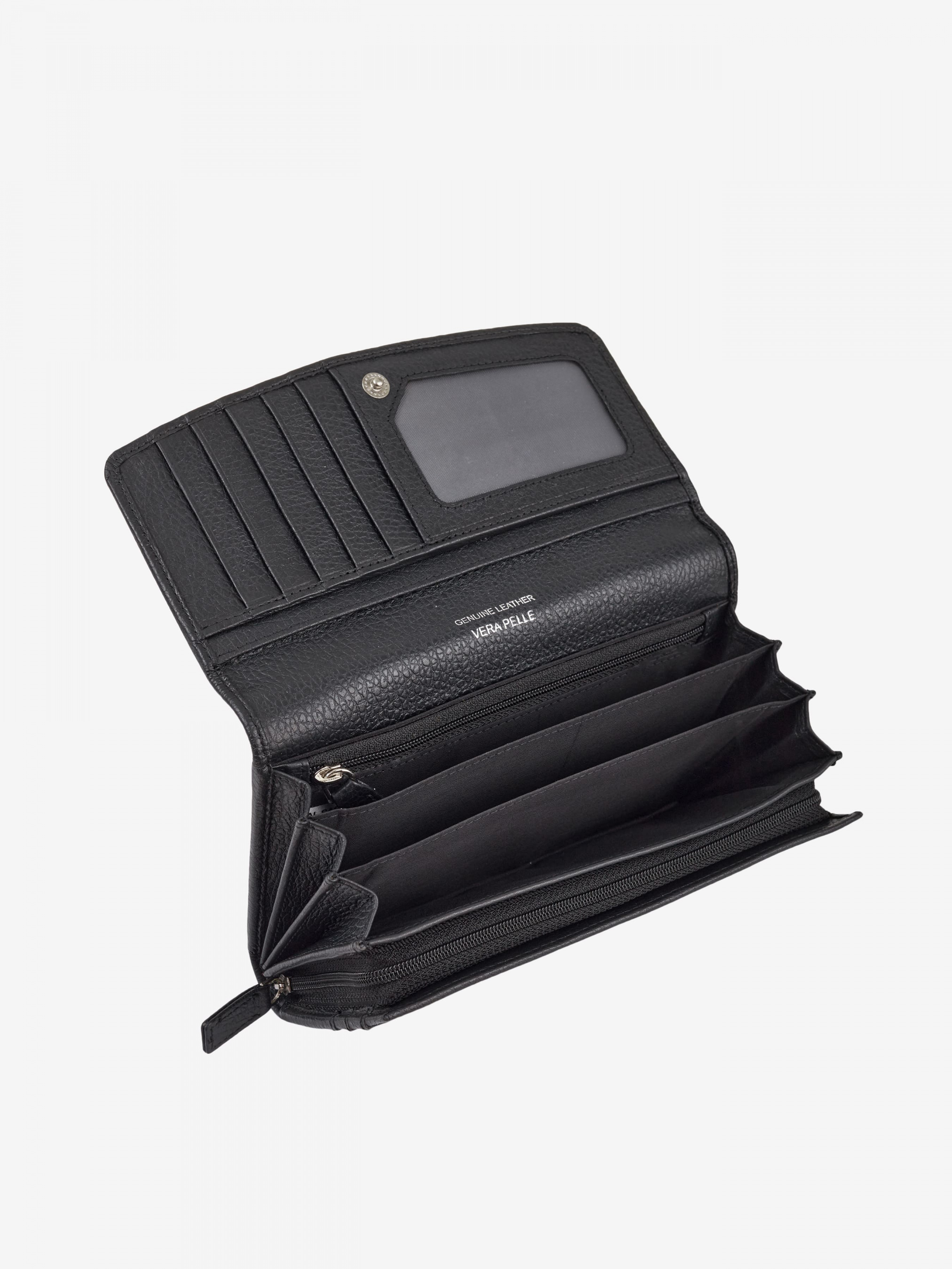 Детали: - 100% натуральная кожа флотар - Внутри 4 отделения для наличных, 1 из них на молнии, 12 отделений для карточек, монетница на молнии и 3 карманчика без застежки - Размеры: (Ш x В x Г): 19 x 10 x 4 см - Застежка: кнопка, молния - Фурнитура серебристого цвета