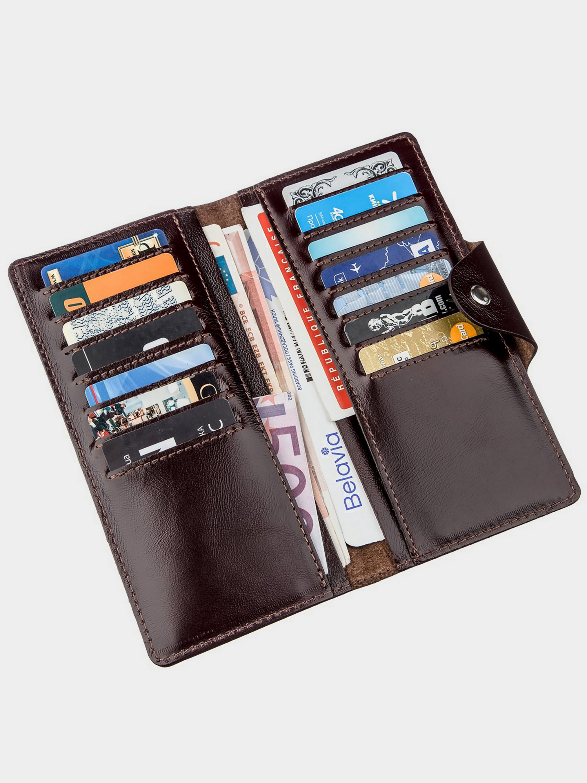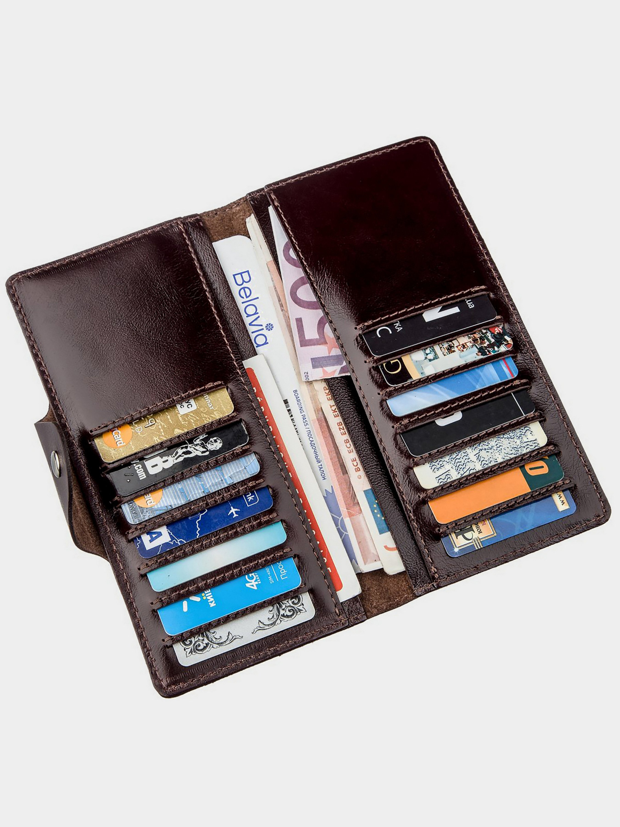Цвет: коричневый; Материал: натуральная кожа высокого качества; Размеры (ШхВ, см): 18х8,5х1; Страна производитель: Украина. Внутри: - 4 отделения для купюр; - 14 отделений для пластиковых карточек. Вертикальный кожаный бумажник от украинского производителя. Аксессуар изготовлен исключительно из натуральной кожи и внутри и снаружи. Закрывается модель на две кнопки (ближнюю или дальнюю). Таким образом, вы можете самостоятельно регулировать наполненность изделия. Стильный и функциональный аксессуар, который станет незаменимым помощником для своего обладателя.