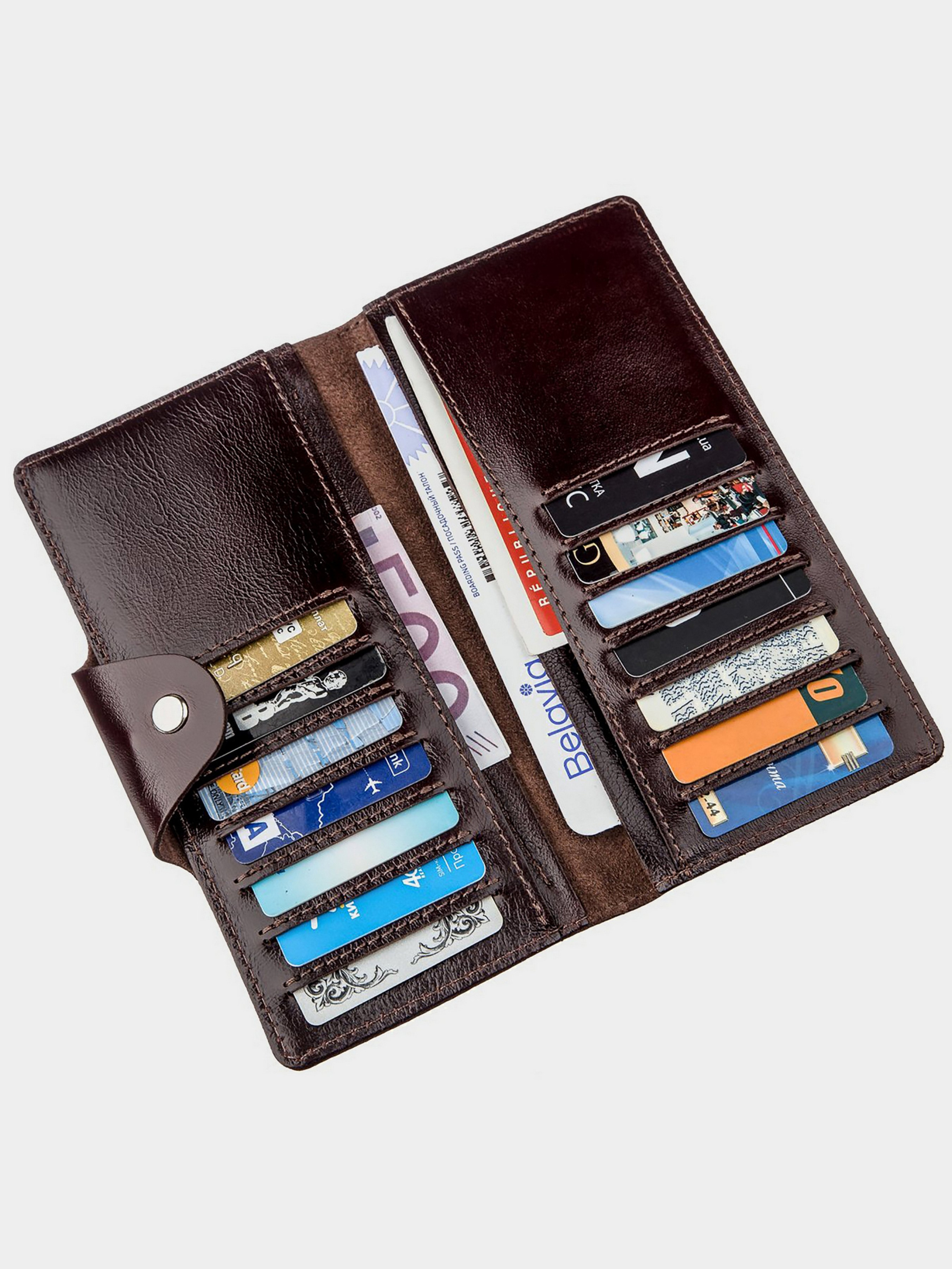 Цвет: коричневый; Материал: натуральная кожа высокого качества; Размеры (ШхВ, см): 18х8,5х1; Страна производитель: Украина. Внутри: - 4 отделения для купюр; - 14 отделений для пластиковых карточек. - карман на молнии на тыльной стороне. Кошелек из натуральной кожи классического коричневого цвета. Застегивается на хлястик с кнопками. Модель имеет глянцевое покрытие. Достаточно оригинально смотрится. Богатый внешний вид. Сверху прошита ровной строчкой в дизайн изделия. Имеет строгий выдержанный дизайн в классическом стиле. Идеально подойдет для тех, кто любит стиль и оригинальность. Не занимает много места в вашей сумке. Тонкий и одновременно вместительный. Будет отличным подарком. Кошелек имеет высокую износостойкость к потертостям и трещинам. Модель доступна в разных цветах и типах кожи. Мы уверены, что бумажник удивит своего владельца.