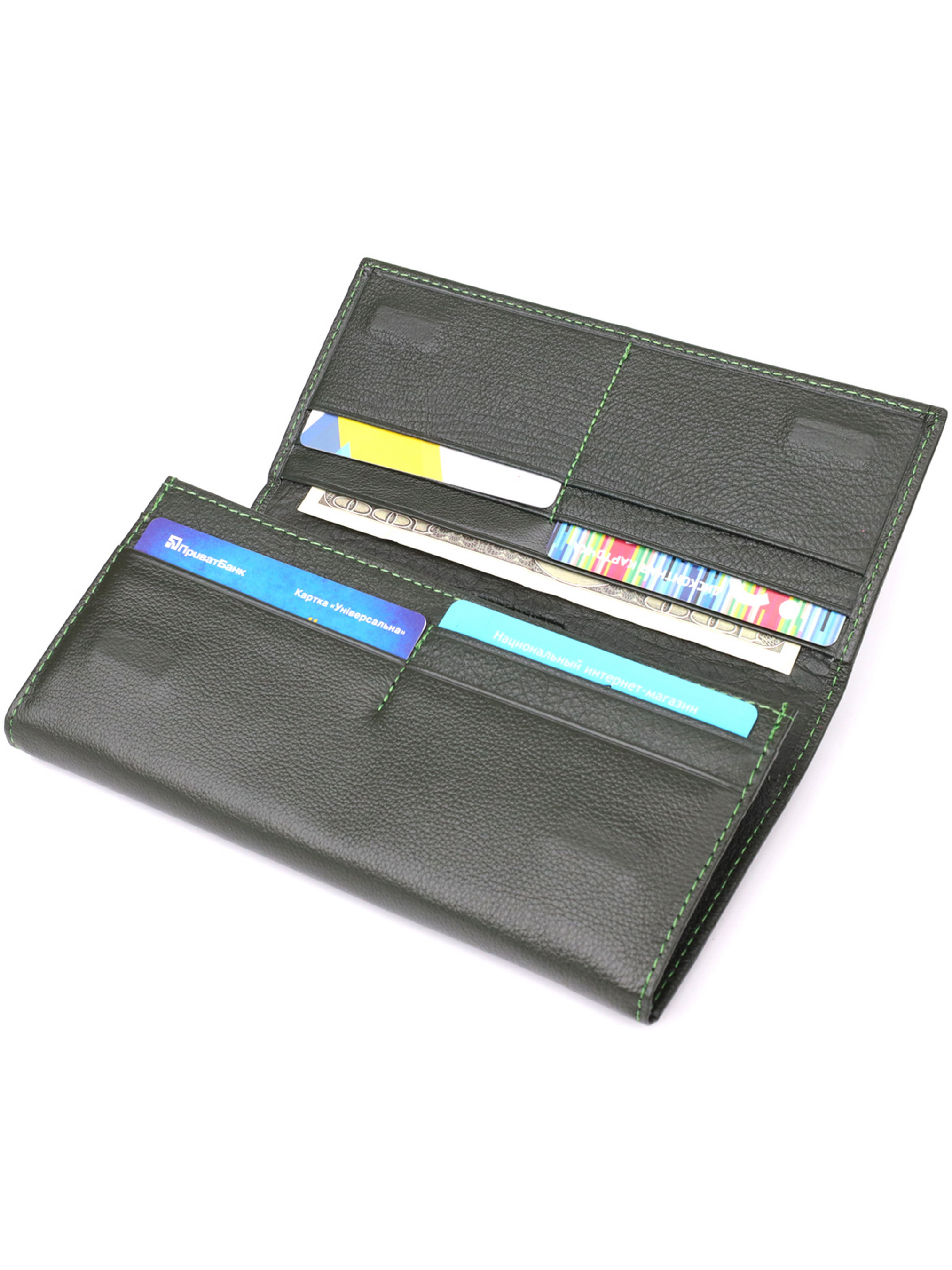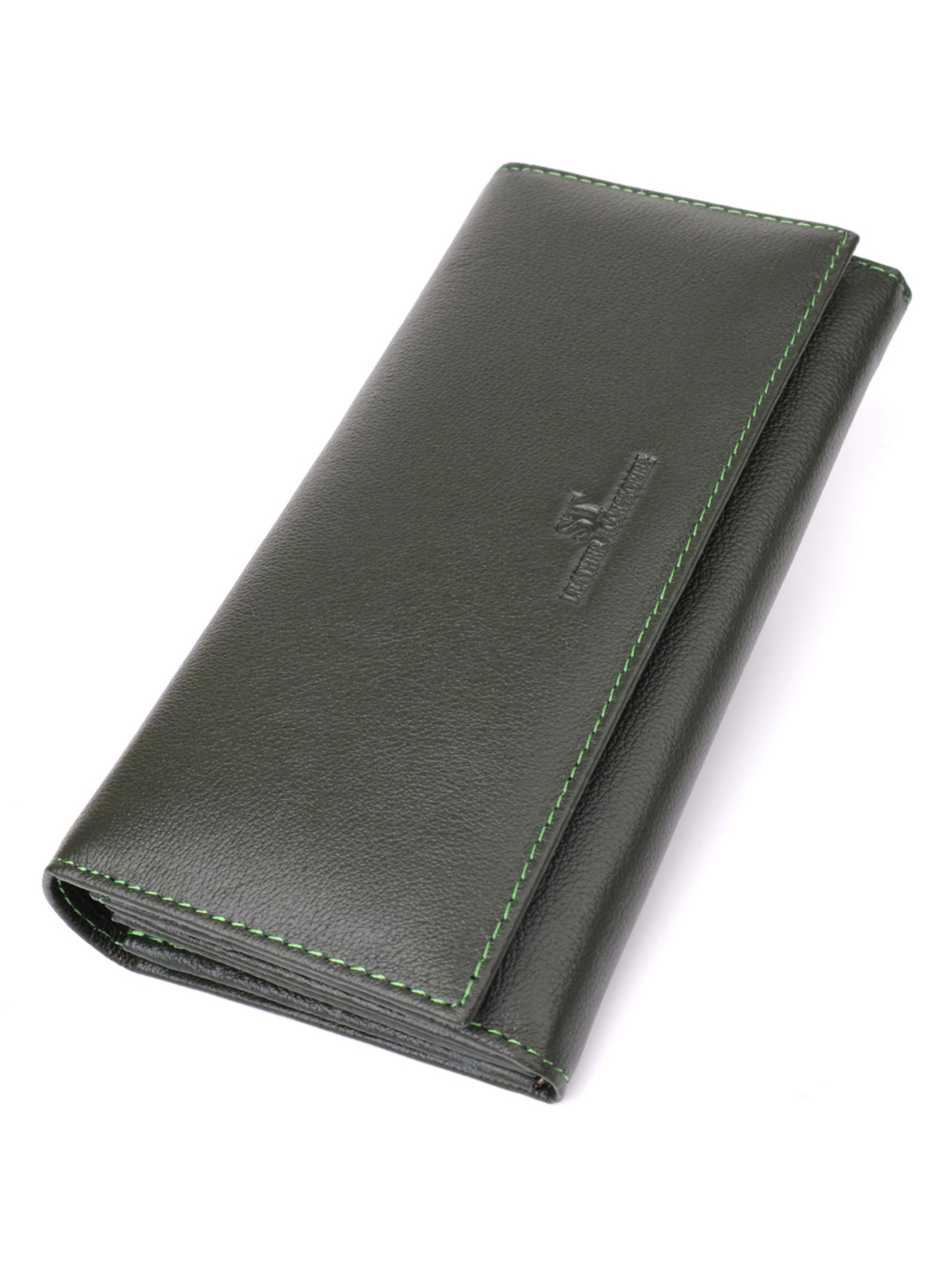 Материал: натуральная кожа; Цвет: зеленый; Размеры (ШхВхГ): 20,5х9,5х2,5 см; Страна производства: Китай. Особенности: - 4 отделения для купюр; - 1 карман на молнии снаружи; - 8 ячеек под пластиковые карточки; - 2 кармана на молнии внутри; - 1 прилегающий карман; - закрывается на магниты. Практичное и надёжное женское портмоне в два сложения, выполненное из натуральной кожи высшего качества. Аксессуар отличается продуманной функциональностью и высокой износостойкостью, благодаря чему станет верным спутником на каждый день. Внутреннее пространство организовано максимально удобно: четыре отделения для купюр, два длинных кармана на молнии, восемь ячеек для пластиковых карт, скрытый внутренний карман, а также внешний карман на молнии, идеально подходящий для монет. Лицевая сторона украшена тиснёным логотипом бренда, который подтверждает оригинальность и качество изделия. Внутренняя отделка сочетает натуральную кожу с плотным текстилем. Портмоне дополнено надёжной фурнитурой и поставляется в фирменной картонной коробке белого цвета - отличный выбор как для себя, так и в подарок.