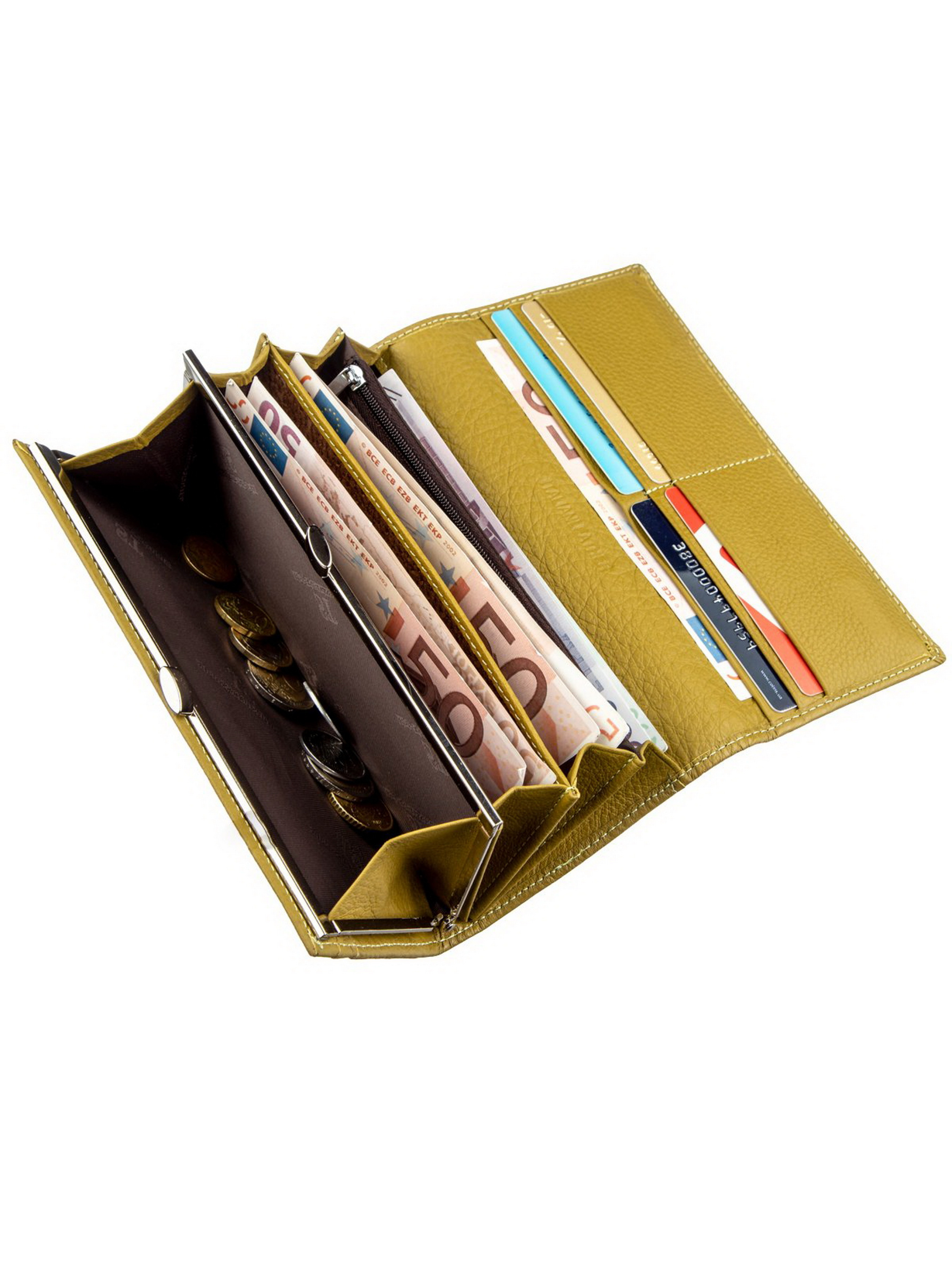 Материал: натуральная кожа; Размеры (ШхВ, см): 18,5х9; Цвет: горчичный; Страна производитель: Китай; Страна происхождения ТМ: Украина. Описание: - женский кошелек из натуральной кожи на магнитах; - внутри расположено три больших отделения для купюр по всей длине; - одно большое отделение на молнии по всей длине; - отделение для монет на защелке; - потайное отделение внутри по всей длине; - внешнее потайное отделение по всей длине; - 8 отделений для карточек; Красивый и экстравагантный женский кошелек необыкновенного горчичного цвета. Исполнен аксессуар из натуральной кожи. Выглядит очень модно и стильно. Ко всему этому кошелек еще и очень практичный, потому что имеет все необходимые отделения и карманы для Ваших ценностей. Внутри есть три основных больших отделения для купюр, отделение на молнии для прочих ценностей, карманы для всяческих карт и удобная монетница на металлической защелке. Также есть одно внешнее вместительное отделение. Закрывается этот бумажник на удобные магниты, которые расположены по бокам. Упаковано изделие в белую картонную коробку.