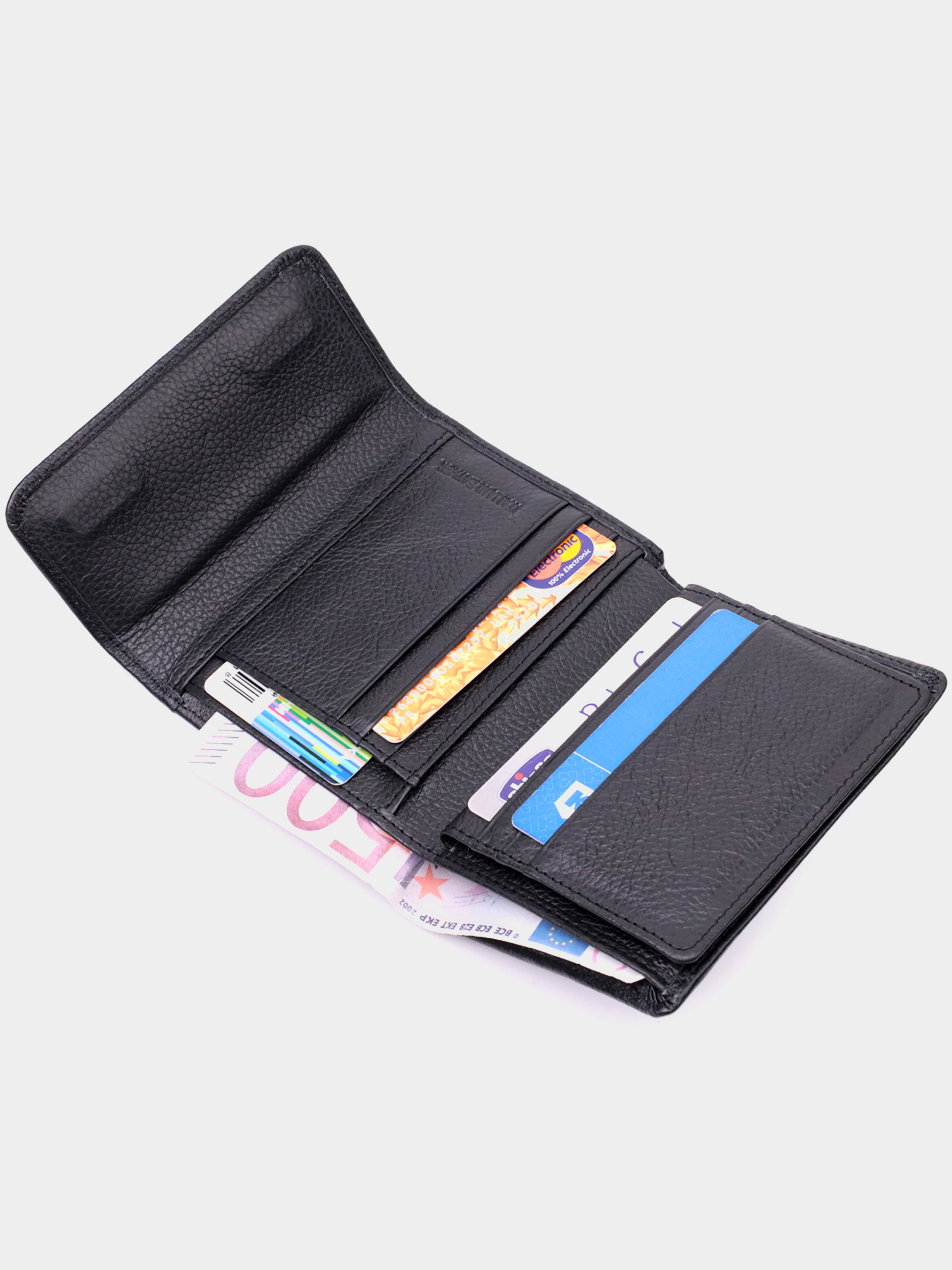 Материал: натуральная кожа; Цвет: черный; Размеры (ШхВхГ)см: 11,7х9,5х2 см; Страна производства: Китай. Особенности: - 1 основное отделение для купюр; - 1 отделение на молнии на всю длину; - 6 слотов для кредиток; - 4 скрытых кармана; - 1 карман под пленкой; - 1 наружный карман для монет на молнии; - закрывается клапаном на магниты. Вместительный кошелек среднего размера из натуральной кожи высочайшего качества. Аксессуар состоит из одного вместительного отделения для купюр, кармана на молнии через всю длину, шести ячеек для карт, четырех скрытых карманов, кармашка под пленкой и наружного кармана на молнии, что отлично прослужит для монет. Снаружи изделие прошито ровной строчкой по краю и украшено тисненым логотипом компании производителя, которое размещено на клапане посередине. Портмоне дополнено надежной фурнитурой и крепкой подкладкой. Укомплектован кошелек в фирменную картонную коробку белого цвета. Изделие станет идеальным подарком для девушки любого возраста.