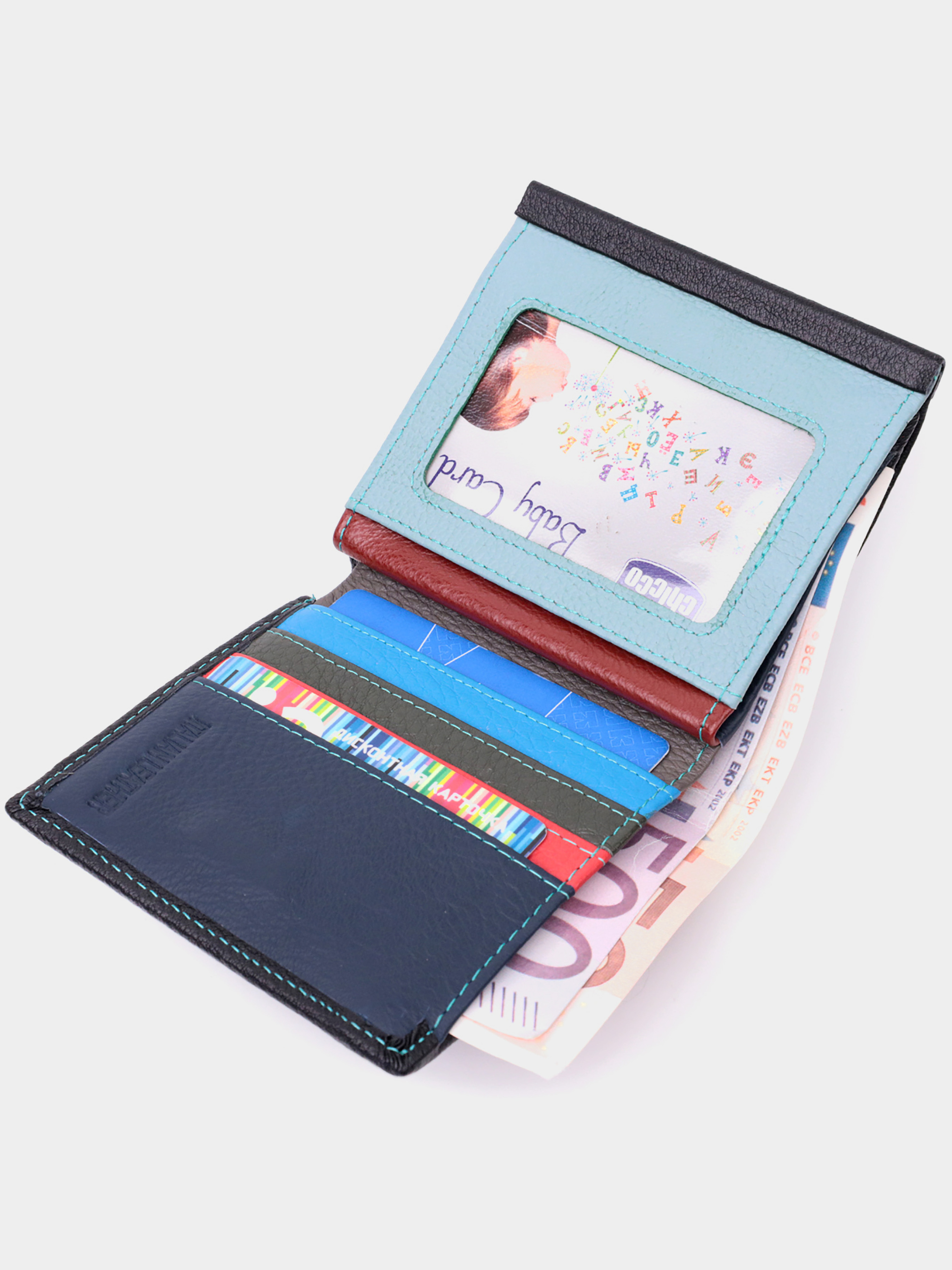 Материал: натуральная кожа; Цвет: черный; Размеры (ШхВхГ)см: 10,5х10х1,5 см; Страна производства: Китай. Особенности: - 2 отделения для купюр; - 1 карман на молнии; - 4 слота для кредиток; - 1 скрытый карман; - 1 прозрачный карман; - 1 карман для монет на кнопке под клапаном; - закрывается на магнит. Портмоне для женщин среднего размера из натуральной кожи высочайшего качества. Акцентом этого кошелька является цвет, точнее несколько цветов - он черного цвета снаружи и многоцветный внутри. Аксессуар состоит из двух вместительных отделений для купюр, кармана на молнии, четырех ячеек для карт, скрытого кармана, прозрачного кармана и кармана для монет. Снаружи изделие прошито ровной строчкой бирюзового цвета по краю и украшено металлическим логотипом компании производителя, который размещен вверху посередине. Портмоне дополнено надежной фурнитурой и крепкой подкладкой. Укомплектован кошелек в фирменную картонную коробку белого цвета.