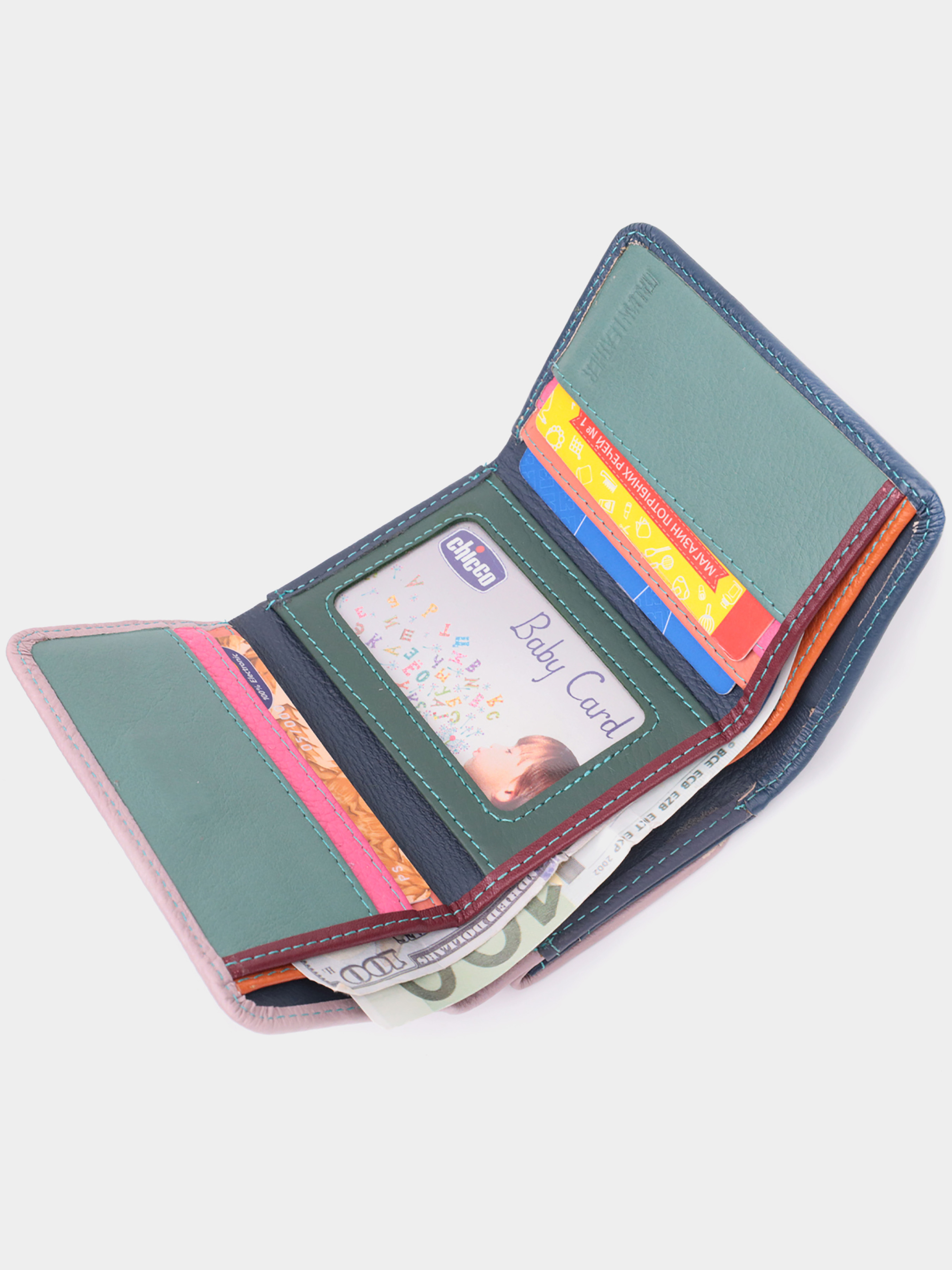 Материал: натуральная кожа; Цвет: разноцветный; Размеры (ШхВхГ)см: 11,3х8,5х2 см; Страна производства: Китай. Особенности: - 2 отделения для купюр; - 5 ячеек для карт; - 2 скрытых кармана; - 1 карман под пленкой; - карман для монет, что закрывается клапаном на магнит; - закрывается в три сложения клапаном на магнит. Оригинальный женский кошелек среднего размера из натуральной кожи. Отличительная особенность этого кошелька двухцветная наружная часть и многоцветная внутренняя часть. Данная модель тройного сложения, которая закрывается на клапан с магнитом. Внутри есть два отделения для купюр, монетница, пять слотов под пластиковые карты, одно окошко для фото, а также два скрытых отделения. Отменный функционал и удобный размер создает идеальную модель кошелька для повседневного использования.