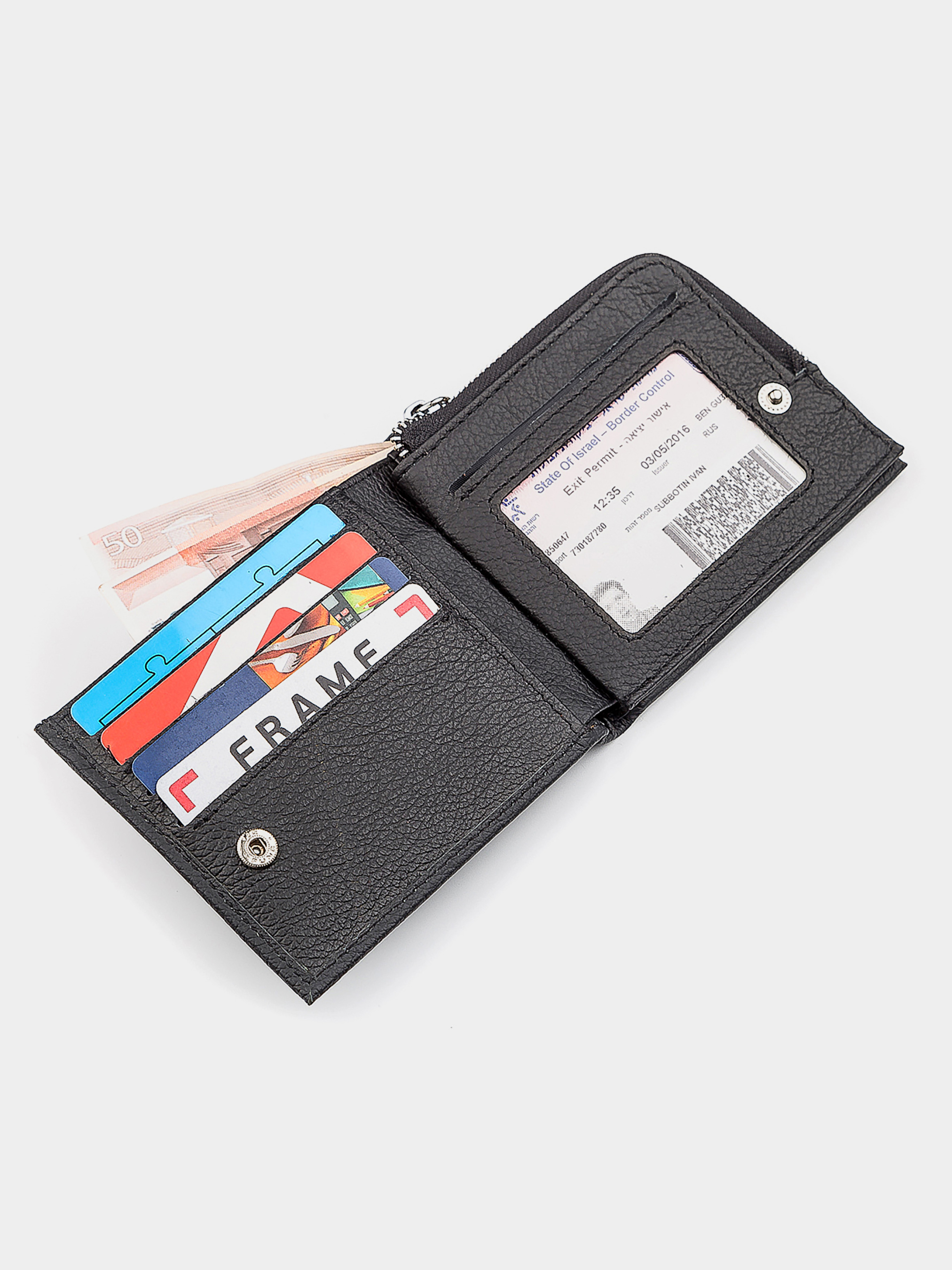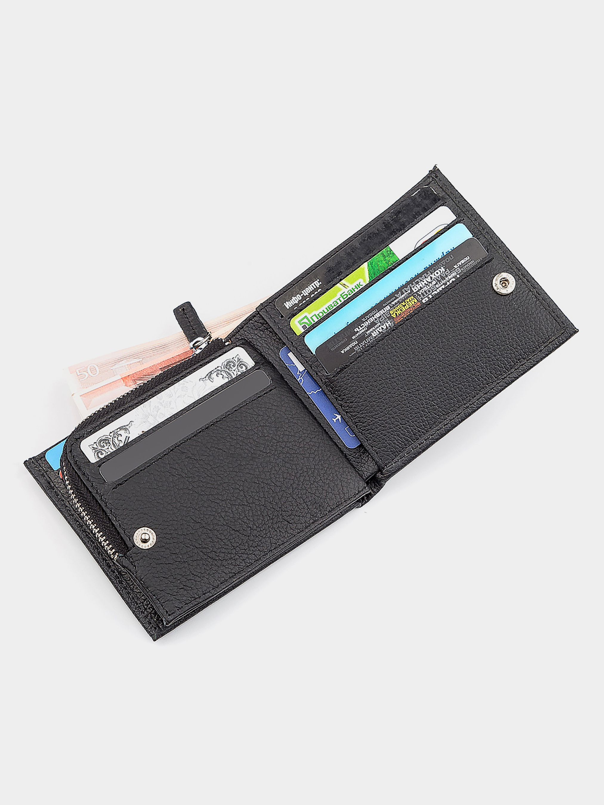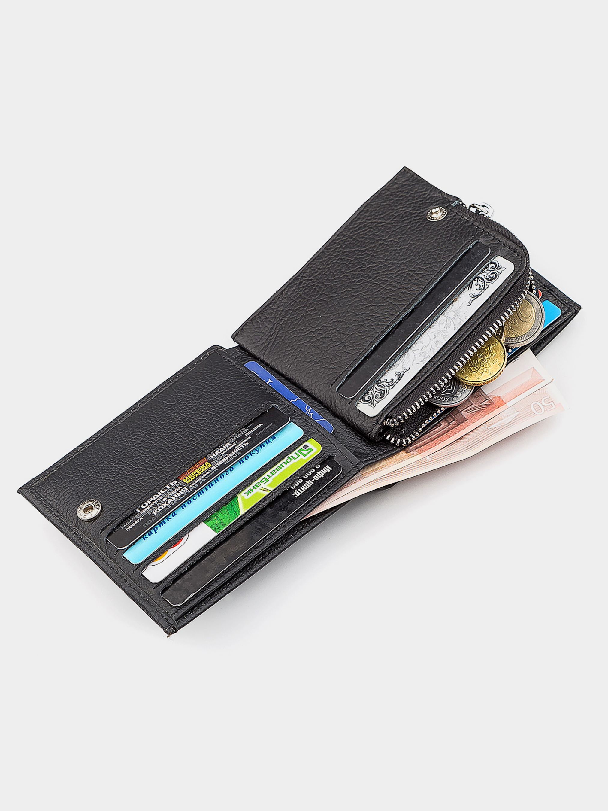 Материал: натуральная кожа; Цвет: черный; Размеры (ШхВхГ): 11х9,5х3; Страна производства: Китай. Особенности -2 кармана для банкнот (одно из которых на молнии); -10 отделений под кредитные карточки; -2 прилегающих кармана; -1 отделение с прозрачным окном; -1 отделение для монет, которое закрывается молнией. Классический стиль данной модели предусматривает фиксацию клапана на специальной кнопке. Природная фактура натуральной говяжьей кожи не оставит равнодушной ни одну модницу. Во внутреннем функционале есть несколько отделений для купюр, одно из которых дополнено молнией и 10 слотов для кредиток или визитных карточек. Также, имеется отделение на змейке и окошко, где можно раcположить права или удостоверение личности. Кошелек предлагается в подарочной упаковке от производителя.