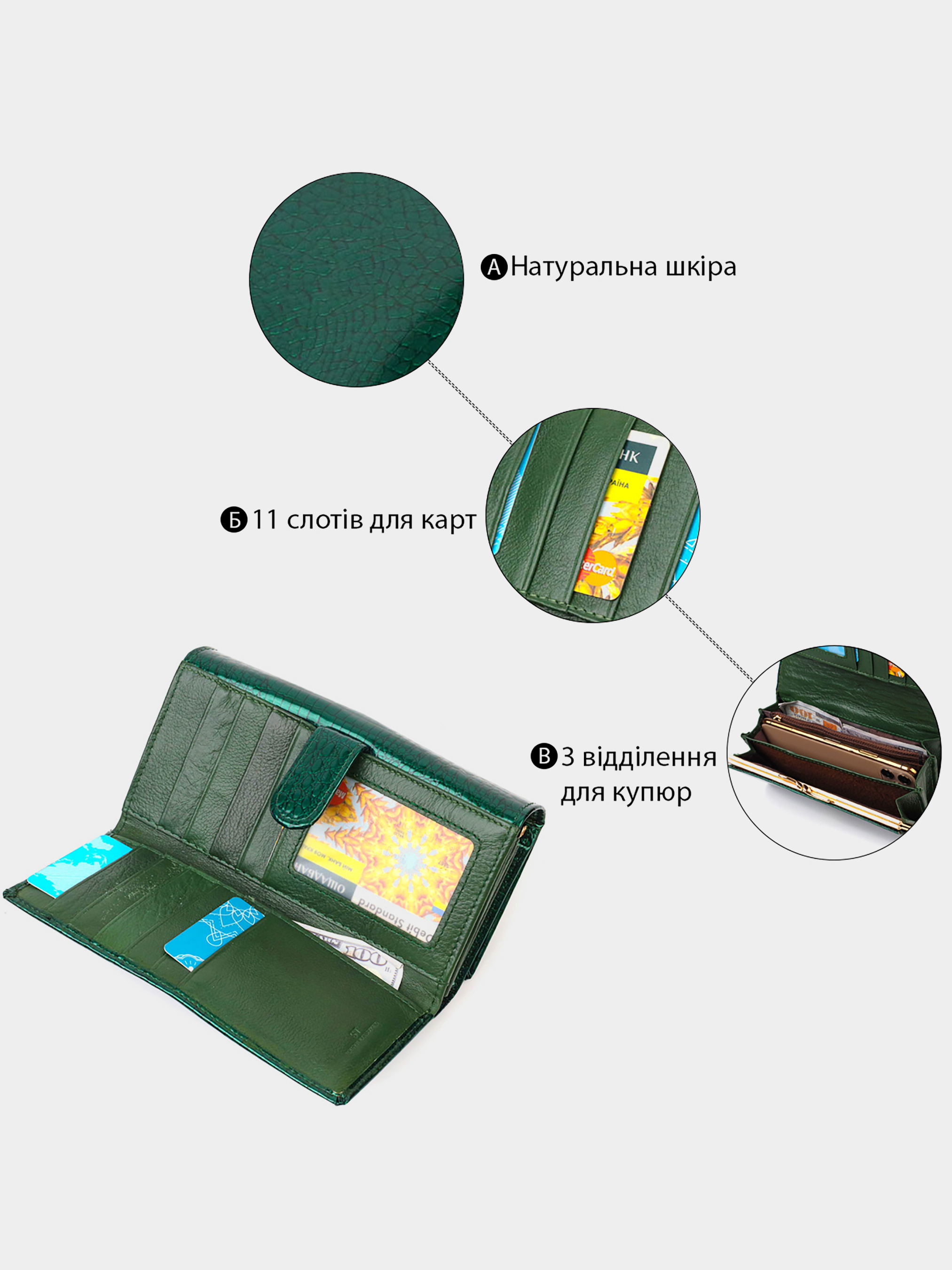 Материал: натуральная кожа; Размеры (ШхВ, см): 17х9х3; Цвет: зеленый; Страна производитель: Китай; Страна происхождения ТМ: Украина. Описание: - женский кошелек из натуральной кожи на кнопке; - внутри расположено три больших отделения для купюр по всей длине; - одно большое отделение на молнии по всей длине; - двойное отделение для монет на защелке; - два кармашка для сим-карт; - потайное отделение; - прозрачное отделение для фото; - 4 отделения для карт в основном отделении; - 11 отделений для карт в визитнице; - потайное отделение на всю длину в визитнице. Многофункциональный кошелек для деловых и современных женщин. Имеет красивый и строгий дизайн и отличается особой практичностью. Изготовлено данное изделие из натуральной кожи. Наполнение представлено вместительными отделениями и карманами для Ваших ценностей. Блок для карт расположен на внешней стороне и насчитывает одиннадцать карманов для карт и одно потайное отделение. Закрывается кошелек на металлическую кнопку, которую также можно регулировать по длине по мере наполнения карточками. Упакован кошелек в белую картонную коробку с логотипом производителя.