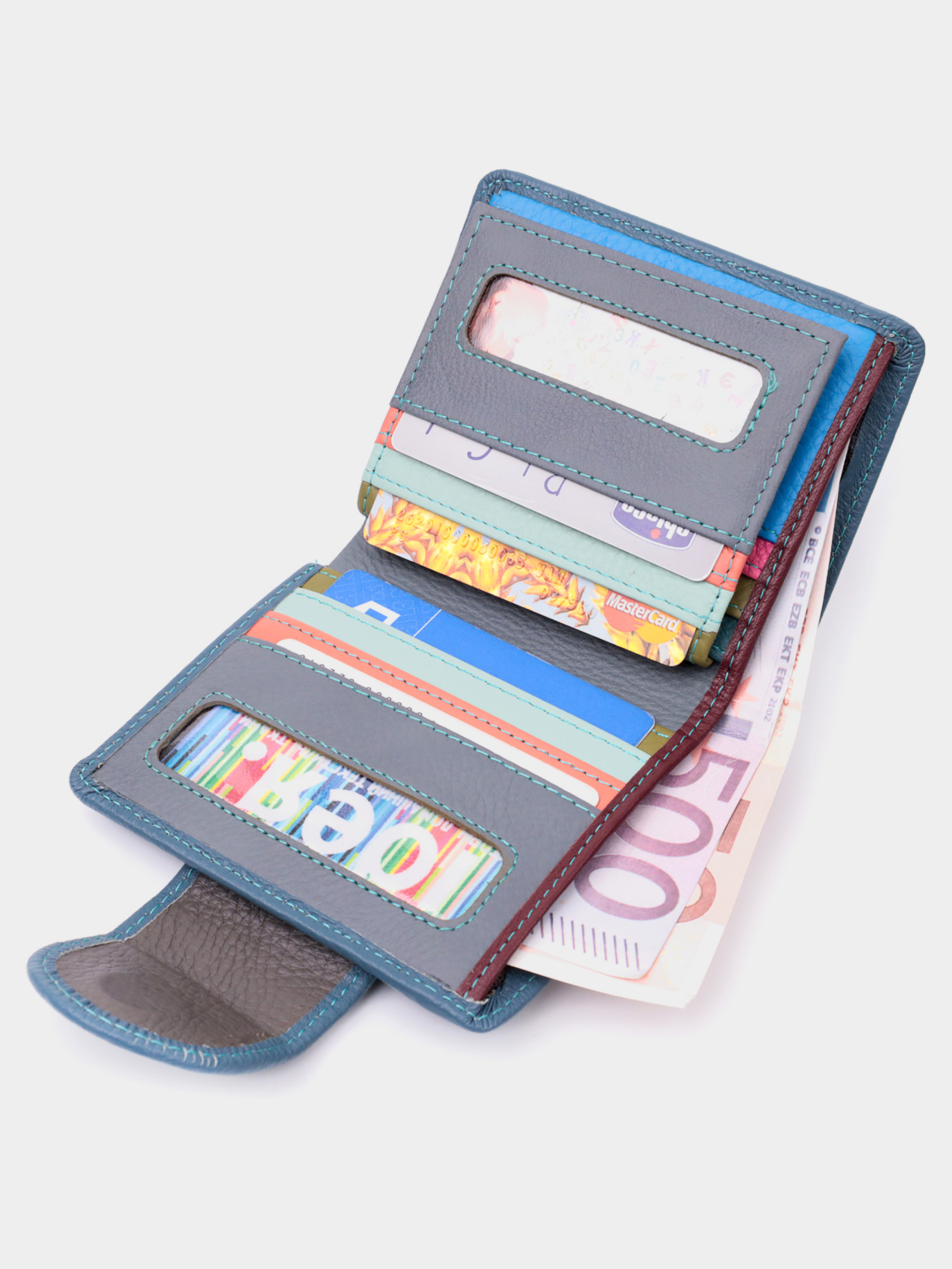 Материал: натуральная кожа; Цвет: бирюзовый; Размеры (ШхВхГ)см: 10х11,3х1,5см; Страна производства: Китай. Особенности: - 1 основное отделение с кожаной перегородкой для купюр; - 1 карман на молнии через всю длину; - 1 монетница снаружи, что закрывается клапаном на кнопку; - 3 скрытых кармана; - 9 ячеек для кредиток, три из них с прозрачными окошками; - 1 кармашек под пленкой; - закрывается хлястиком на магнит. Качественное вертикальное портмоне в два сложения удобного размера из натуральной кожи высочайшего качества. Кошелек серо-бирюзового цвета снаружи и разноцветный внутри, что очень стильно и современно. Кожаное портмоне очень практичное и служит достаточно долго. Аксессуар состоит из основного отделения с кожаной перегородкой для купюр, кармана на молнии через всю длину, монетницы, девяти ячеек для карт, прозрачного окошка для пропуска и трех скрытых карманов. Портмоне дополнено надежной фурнитурой и прошито по краю ровной строчкой бирюзового цвета. Укомплектован кошелек в фирменную картонную коробку белого цвета. Изделие станет идеальным подарком для девушки любого возраста.