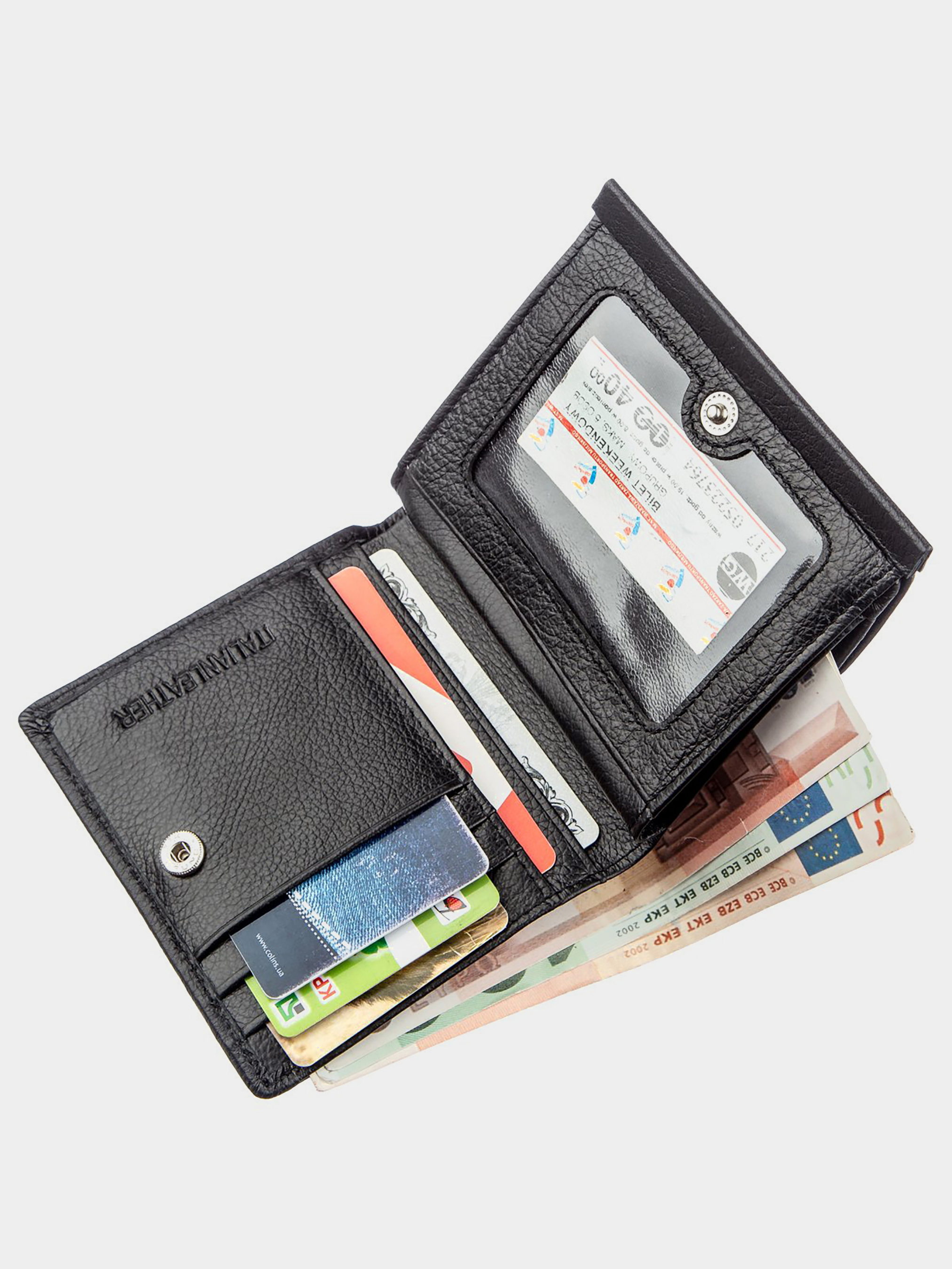 Материал: натуральная кожа; Размеры (ШхВ, см): 10х10,5; Цвет: черный; Страна производитель: Китай; Страна происхождения ТМ: Украина. Описание: - женский бумажник из натуральной кожи на кнопке; - внутри расположено два больших отделения для купюр по всей длине; - одно большое отделение на молнии по всей длине; - двойное отделение для монет на кнопке; - два потайных отделения по всей длине; - прозрачное отделение для фото; - 3 отделения для карт. Небольшой практичный женский бумажник с добротной натуральной кожи высокого качества. Имеет универсальный черный цвет с матовым оттенком. Если Вы не являетесь поклонником больших и громоздких кошельков, то данное портмоне прекрасный выбор. Внутри кошелька расположено два основных отделения для купюр, отделение на молнии для особо ценных мелочей, карманы для фото близких людей и конечно же карточек и визиток. Монетница в данной модели находится на тыльной стороне и имеет два отделения, закрывается на металлическую кнопку. Такой бумажник может стать замечательной обновкой не только для себя, но и отличным подарком для дорогого человека. Продается аксессуар в белой картонной коробке с фирменным логотипом.