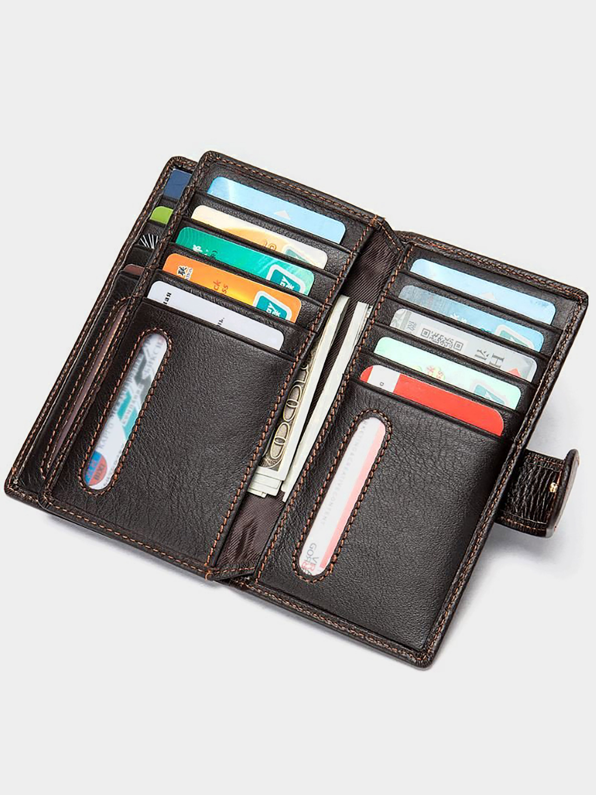 Материал: натуральная кожа высокого качества. Цвет: коричневый. Размеры (ШхВхГ, см): 8,5х14,5х1 см. Страна производитель: Китай. Бренд: Vintage. Описание: - 4 кармана открытого типа; - 19 ячеек для кредиток (три из которых для фото); Стильная вместительная Візитниця в классическом стиле. Аксессуар выполнен в коже флотар, которая долго носится и на ней не видно царапин. Візитниця поместится в вашу сумку. По необходимости в карманы кредитницы вы сможете вместить купюры. Дизайн аксессуара выделяется за счет красивой ровной строчки по краям. Модель закрывается хлястик с кнопкой. Очень легкая и удобная. Идеальное решение на подарок.