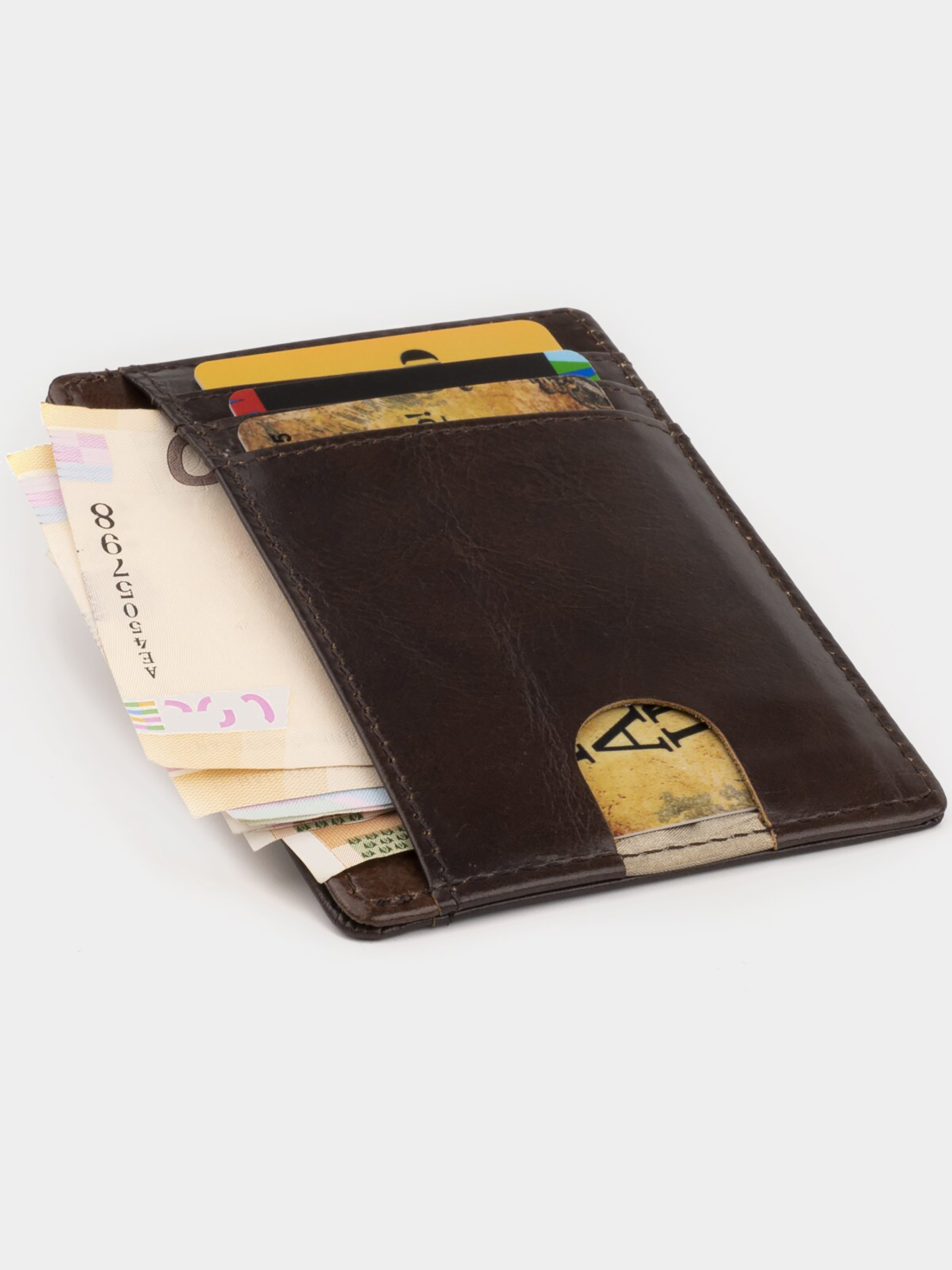 Материал: натуральная кожа высокого качества. Цвет: коричневый. Размеры (ШхВхГ, см): 10,5х8х1,5 см. Страна производитель: Китай. Бренд: Vintage. Особенности: - 4 отделения для пластиковых карточек (одно из них под пленкой); - 2 отделение для банкнот; Маленькая кожаная Візитниця из натуральной кожи коричневого цвета. Такой аксессуар выглядит очень элегантно и может использоваться для хранения купюр. Візитниця упакована в текстильный пылезащитный чехол. Візитниця легко поместится в карман или сумку.